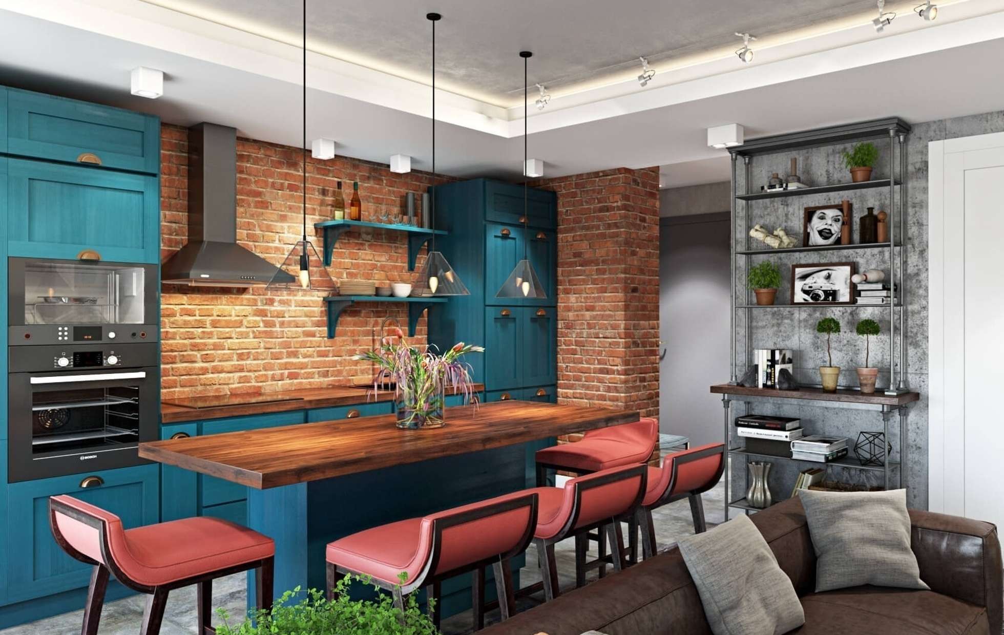На совмещенной кухне царят нестандартные варианты креативного дизайна, в котором гармонично сочетается черновая отделка стен с инновационной техникой. Этот стиль соединяет текстуры, цвета, материалы, чтобы получилась необычная и комфортная обстановка.