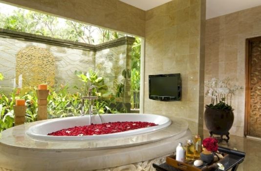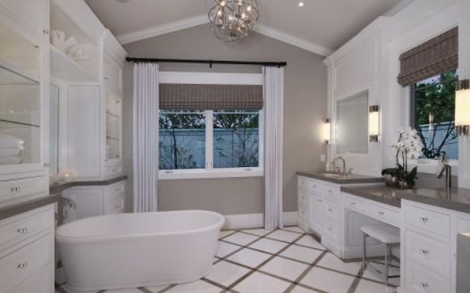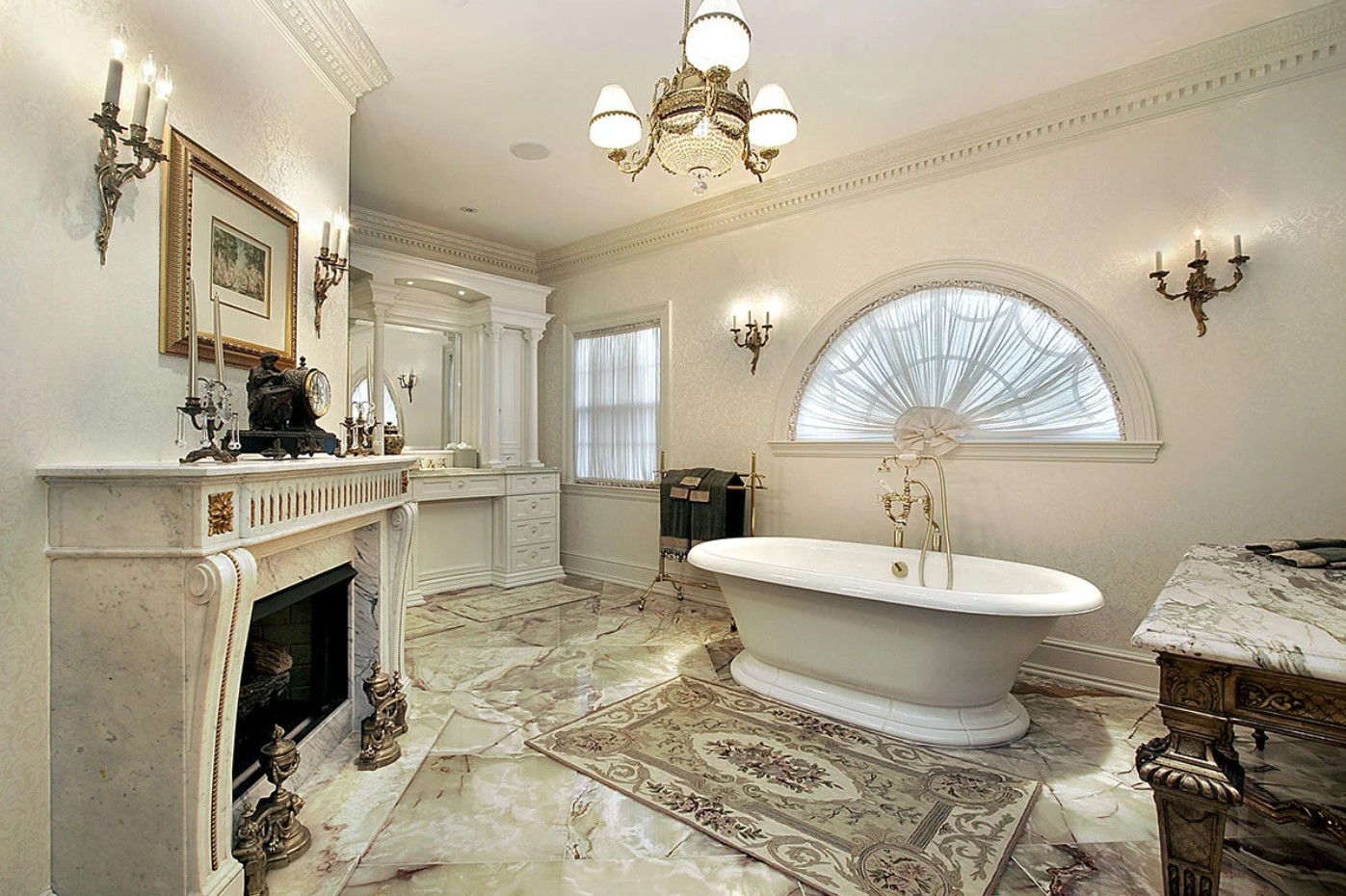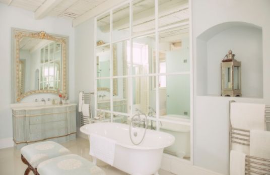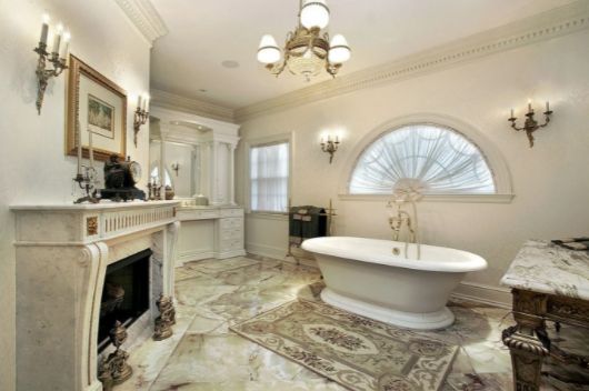 Большой размер комнаты позволяет выбрать королевский размер ванной и любой стиль ее оформления.