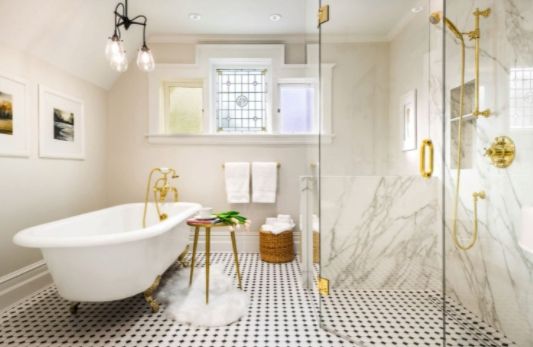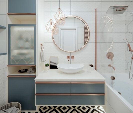 Не стоит огорчаться, если дизайн ванной комнаты в формате класса «люкс» вам не по карману. Важна не стоимость отделки ванны, а насколько стильно и интересно она выглядит. Только стиль и вкус придает настоящий шик. Минималистический дизайн подразумевает лаконизм, простоту и нейтральную отделку стен. Чтобы придать ему индивидуальность и художественную оригинальность, подберите, например, напольную плитку с интересным геометрическим орнаментом, сочетающуюся по цвету с оттенком стен. Помещение сразу же преобразится, станет стильным. Или разместите в минималистичный интерьер, оснащенный технологичными гаджетами, ванну в ретро стиле — это брендовое сочетание.