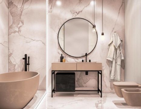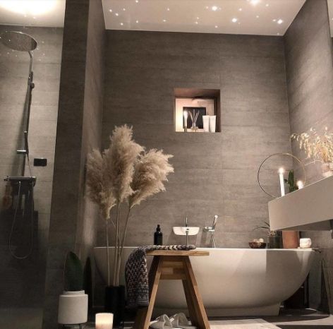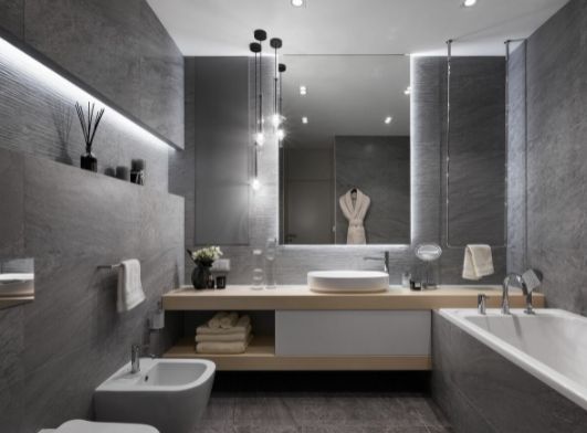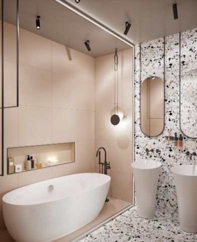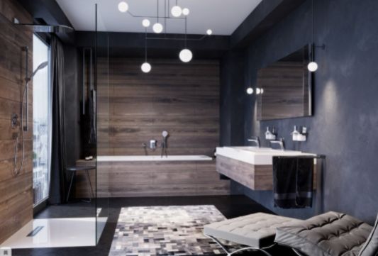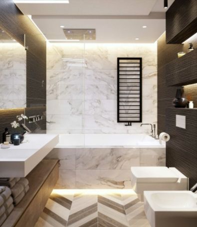 Комфорт, функциональность и экологичность — три кита современной ванной комнаты. Стилевое решение ванной будет удачным, если гармонично сочетается с общим стилем квартиры или дома. Самые актуальные современные стили интерьера — минимализм, эко, неоклассика, скандинавский и лофт. В моде натуральные материалы: камень, дерево, мрамор, оникс, металл, бетон. Их успешно имитирует плитка. Большое значение имеют удачно выбранные системы хранения.Общепринятый когда-то способ отделки плиткой всех стен в интерьере ванной комнаты от пола до потолка перестал быть правилом. Плитку сочетают с покраской стен или использованием фактурной штукатурки, что придает ванной сходство с жилым помещением. Если размеры позволяют, ее дополняют шкафами, мягкой мебелью, большими зеркалами, в том числе зеркалами в пол, красивыми люстрами, и даже произведениями искусства. Роскошь современной ванной комнаты заключается в ее эстетике. Чаще всего такие проекты реализуют в собственных домах.