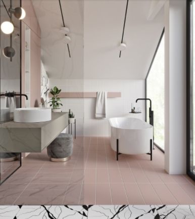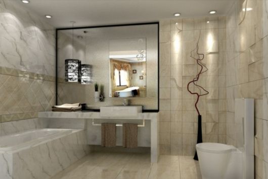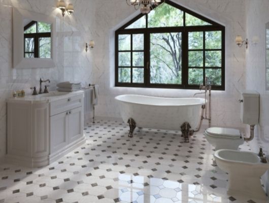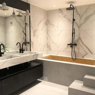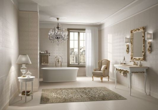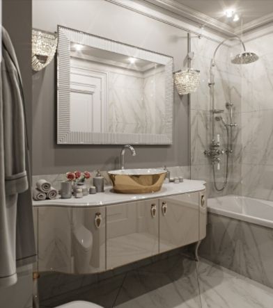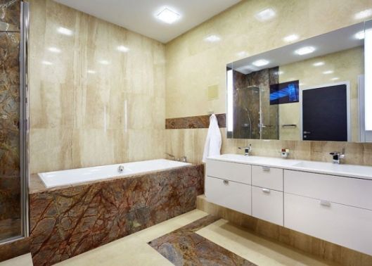 Чтобы небольшое помещение казалось просторней, лучше подобрать плитку светлых оттенков. Один из самых популярных вариантов отделки ванн — мрамор или плитка под мрамор. Мраморный рисунок можно отнести к универсальным: он прекрасно подойдет к стилю минимализм. Облицовка будет изысканно выглядеть и в отделке стен ванной в классическом стиле.