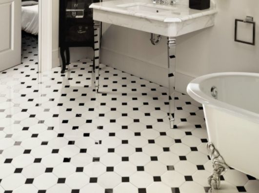 Всегда эффектно черно-белое сочетание: белые кафельные стены и черно-белый в шашечку кафельный пол. Причем черно-белая цветовая комбинация хорошо подходит для любого стиля ванной комнаты — от традиционного до современного.