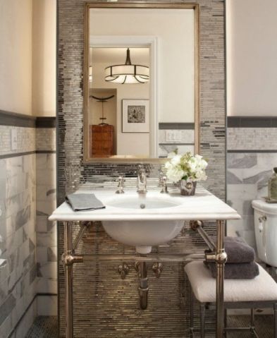 3. Интересно и стильно выглядит мозаика или небольшая плитка в несколько рядов, уложенная посередине стены по всей ее длине.