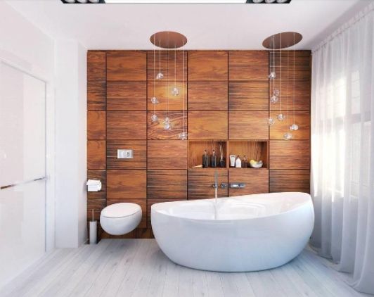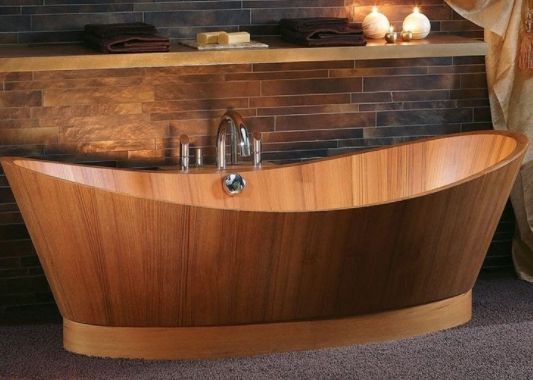 Деревянная ванна обречена стать шедевром любой ванной комнаты и полностью соответствует эко стилю. Она усиливает эффект релаксации, создает особенное настроение в ванной комнате, является главным элементом дизайна. Такие ванны изготавливают из устойчивых к воздействию воды пород дерева: дуба, лиственницы, кедра и других. Им можно придать разнообразную форму. Это вариант дорогой модели ванны суперлюкс по европейской классификации.