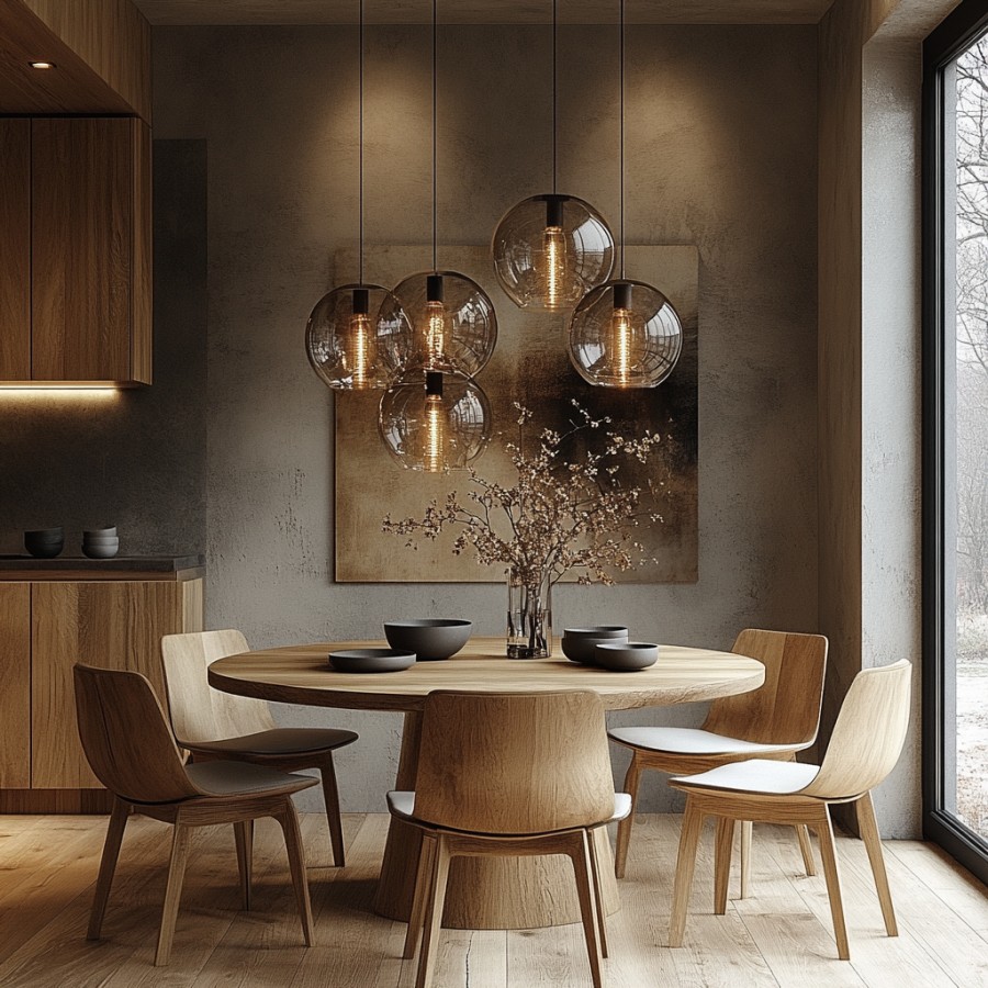Важную роль в создании уюта играет освещение. Подвесной светильник или люстра над столом — способ выделить обеденную зону. Выберите теплый свет, чтобы атмосфера была мягкой и располагающей. Если стол стоит у стены, добавьте настенные бра или точечные светильники. В нише или углу нужно предусмотреть дополнительное освещение, особенно если там мало естественного света.