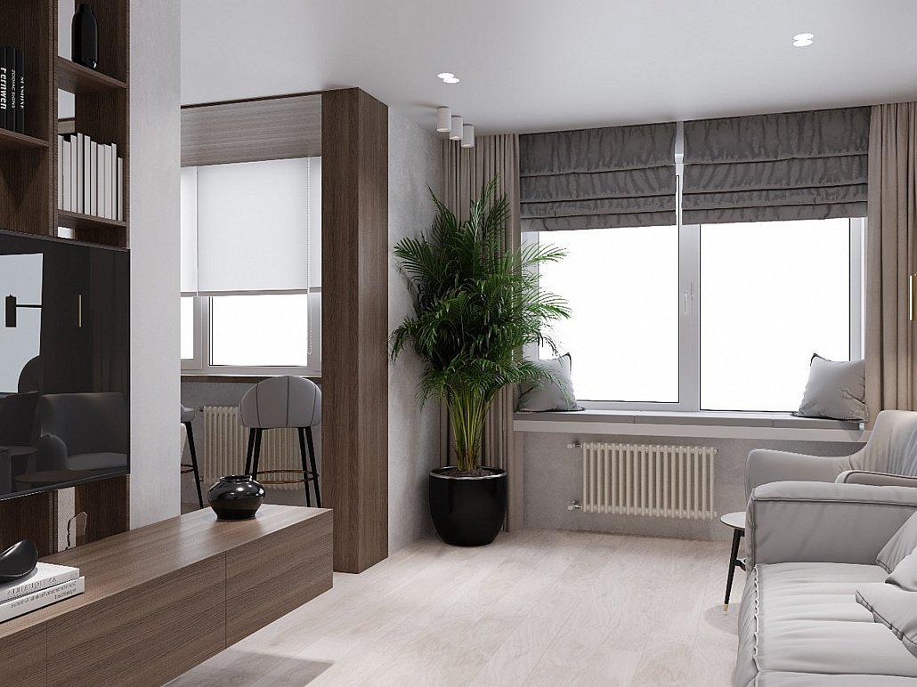 В просторных помещениях с ярким освещением акцентом может выступать черный цвет мебели, элементов пола или декора.