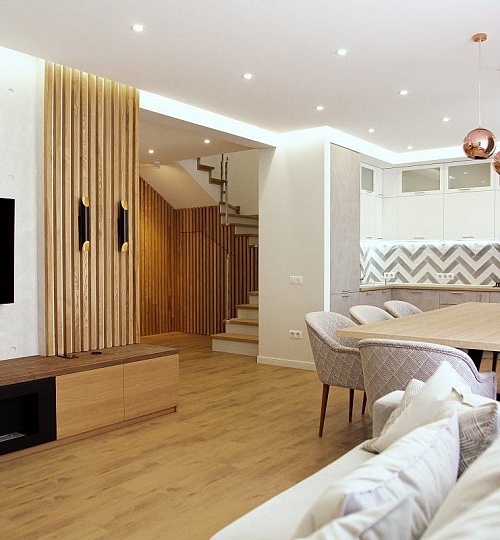 Чтобы помещения выглядели органично, лучше все функциональные зоны выполнять в едином ключе. Стильной доминантой, отделяющей кухню от столовой, может служить барная островная стойка. Пол облицовывают мрамором или керамогранитом темных тонов. В таких оттенках отделывают кухонный фартук. Мебель по отношению к отделке выбирают контрастной.