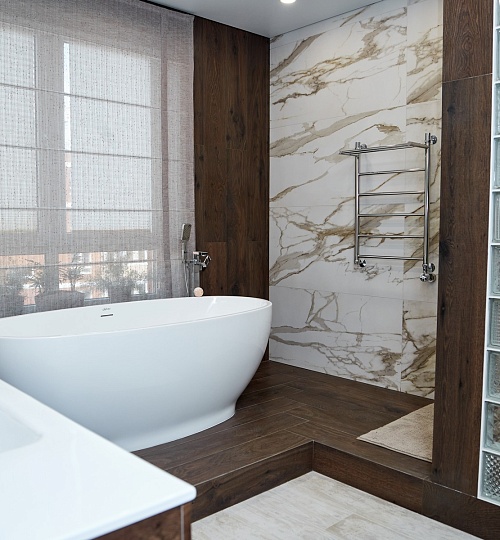 Запоминающийся проект с необычной «фишкой» — большой ванной, которая разместилась в спальной комнате.