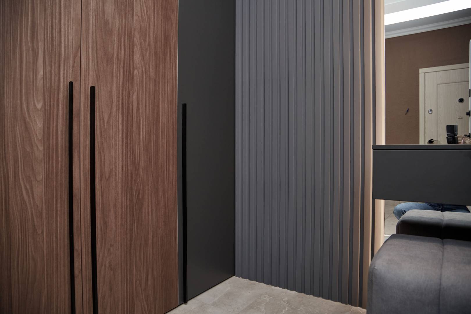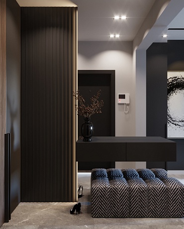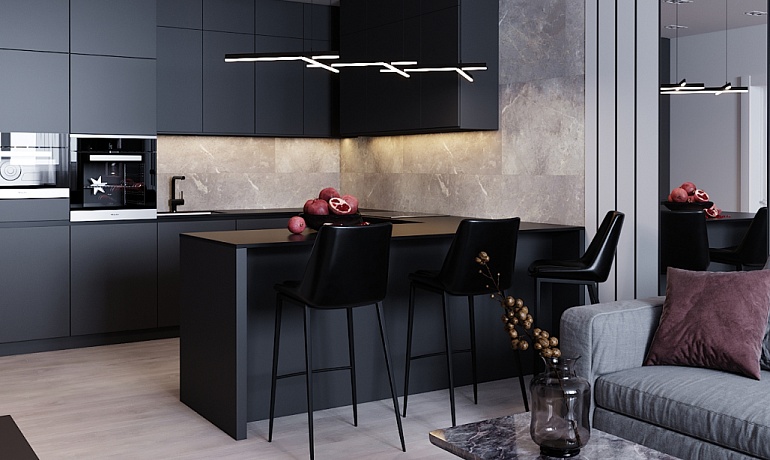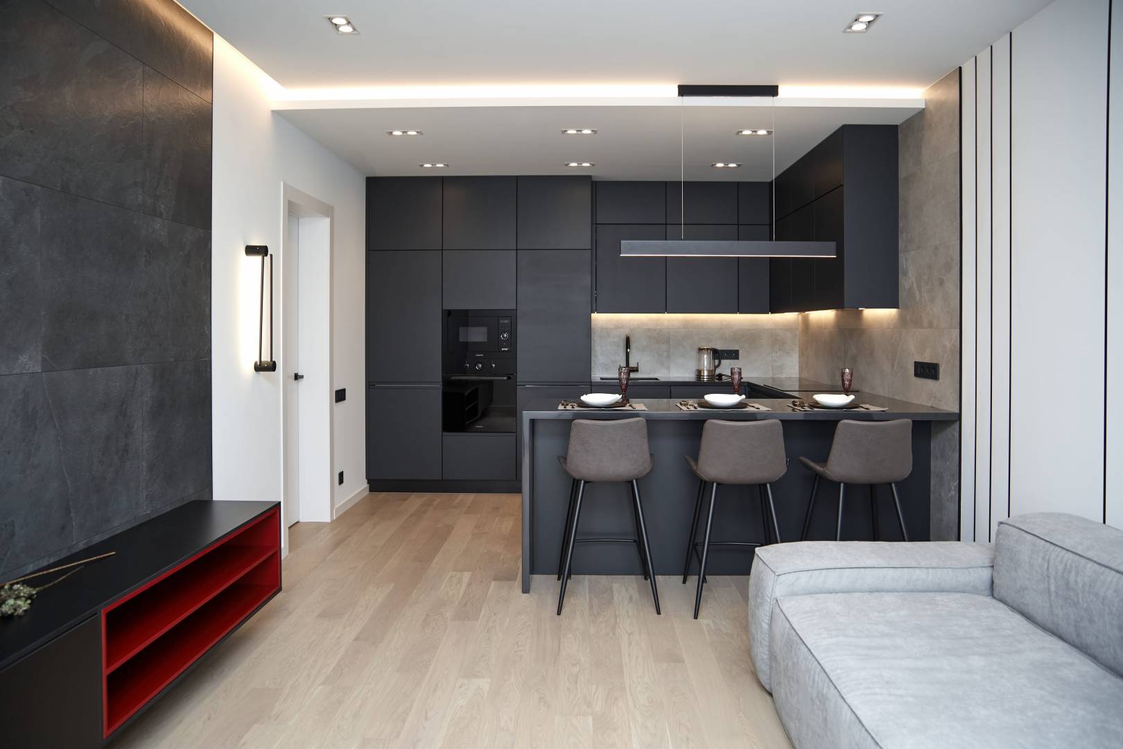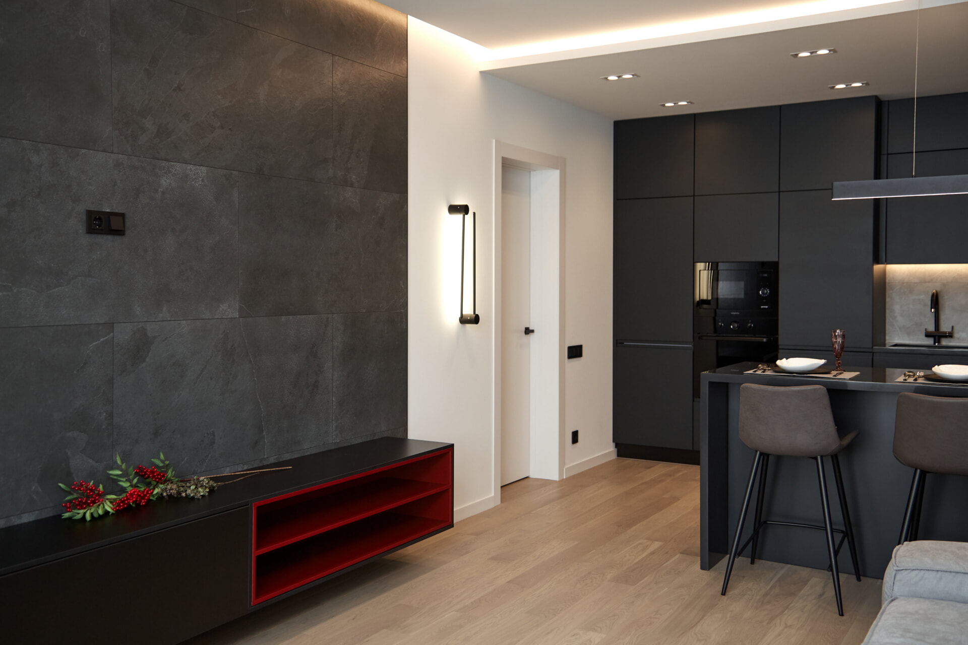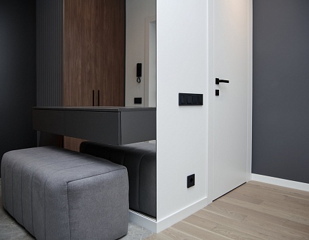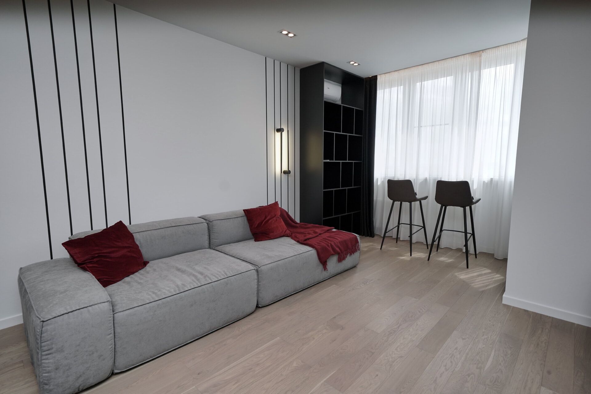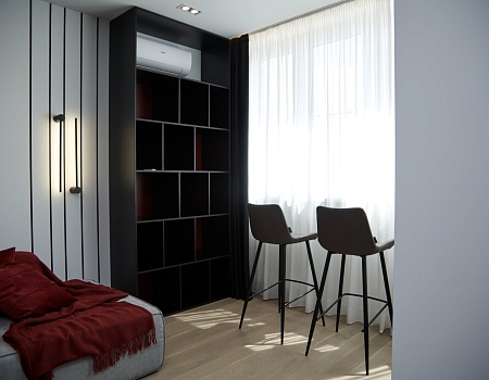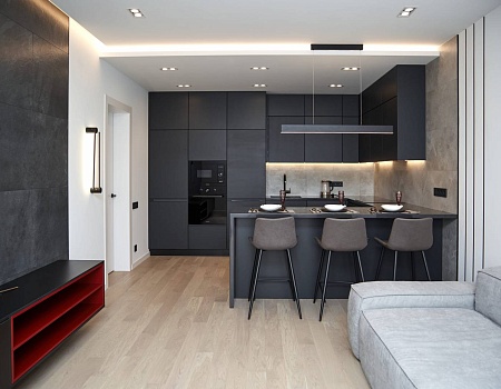 Проект реализован в современном стиле и влюбляет в себя с первого взгляда всех ценителей минималистичных интерьеров. В квартире разместилась полноценная спальня с выходом на лоджию, хол и прихожая с вместительными зонами хранения, просторный санузел, особой фишкой которого стало размещение как душевой, так и изящной отдельно стоящей ванны. Сердцем это квартиры является объединенная кухня-гостиная, в которой разместилась полноценная функциональная кухня с крылом-барной стойкой, а также зона гостиной с удобным модульным диваном.