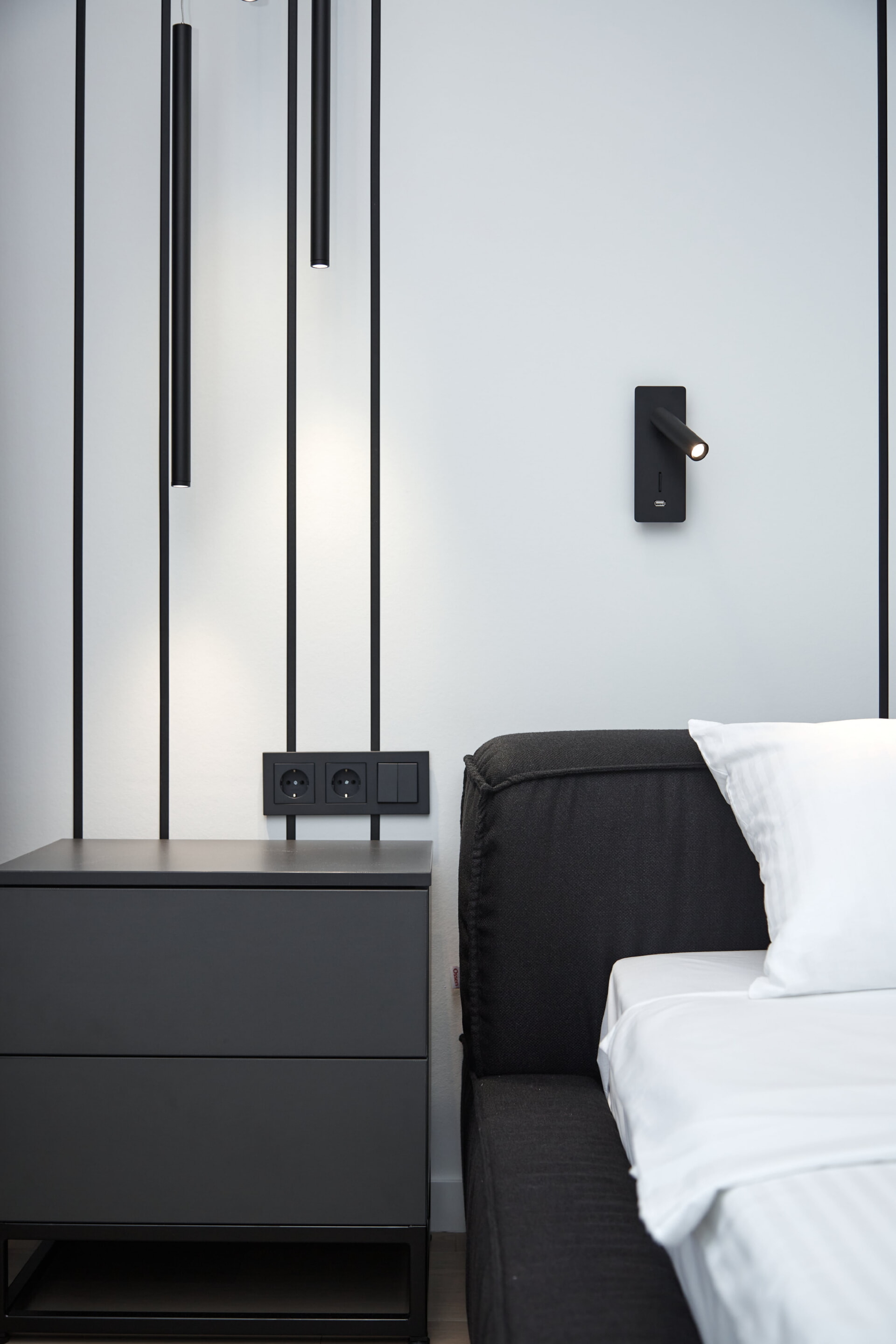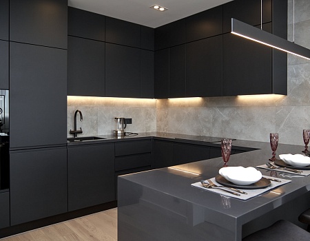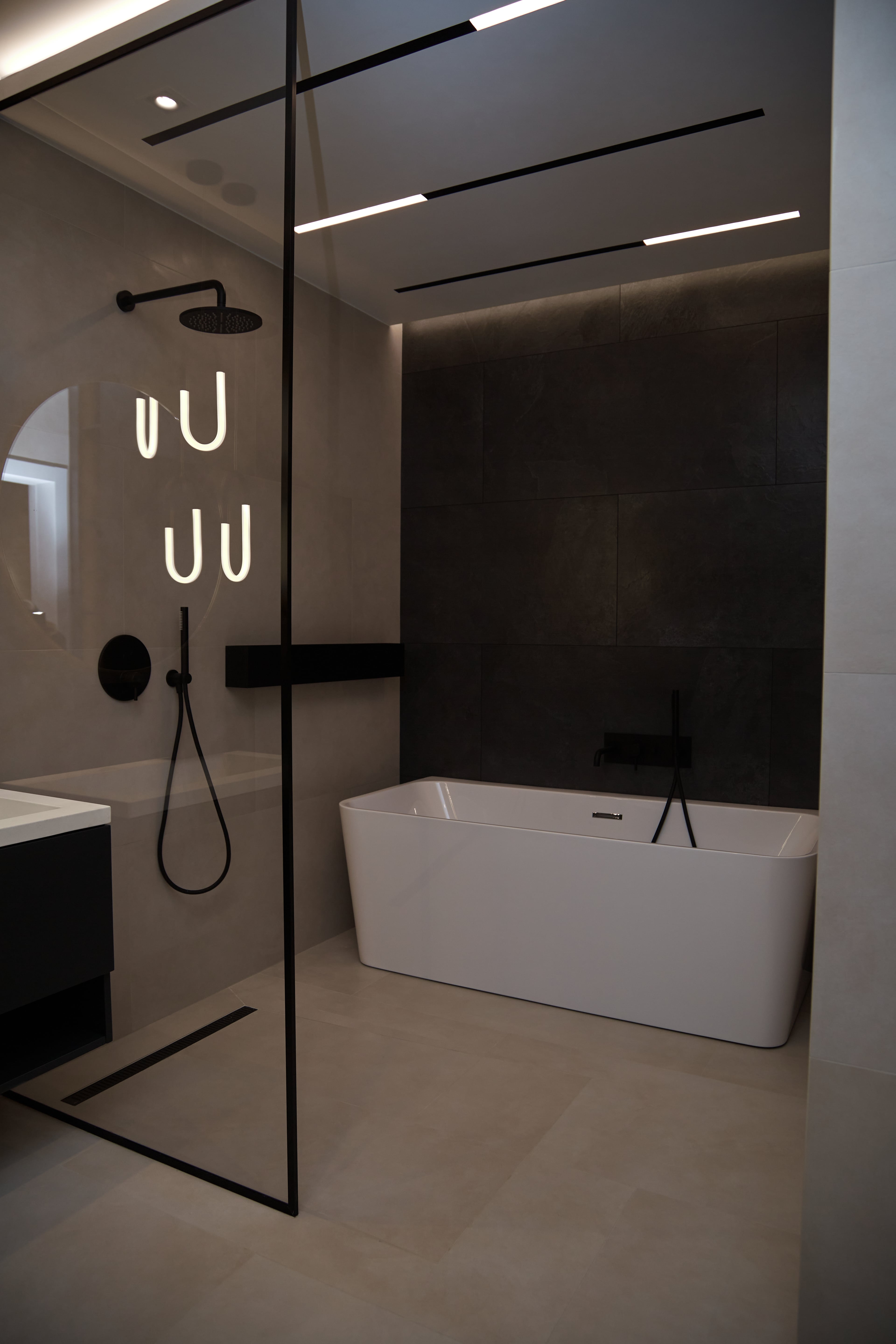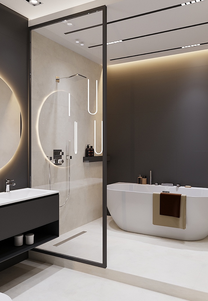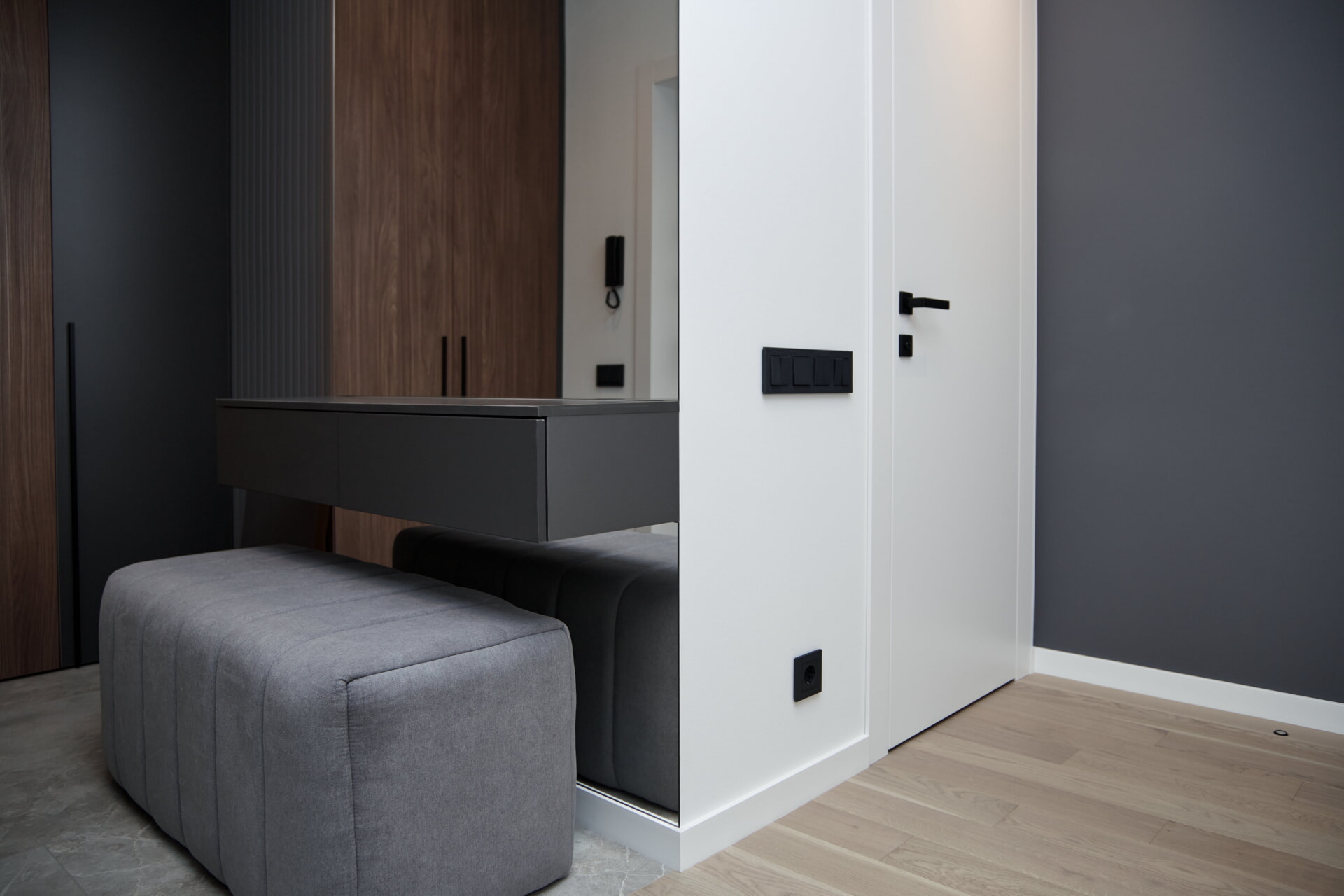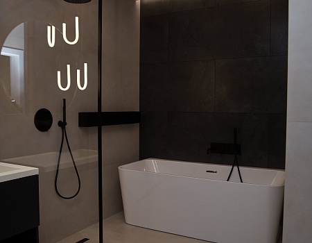 Проект реализован в современном стиле и влюбляет в себя с первого взгляда всех ценителей минималистичных интерьеров. В квартире разместилась полноценная спальня с выходом на лоджию, хол и прихожая с вместительными зонами хранения, просторный санузел, особой фишкой которого стало размещение как душевой, так и изящной отдельно стоящей ванны. Сердцем это квартиры является объединенная кухня-гостиная, в которой разместилась полноценная функциональная кухня с крылом-барной стойкой, а также зона гостиной с удобным модульным диваном.