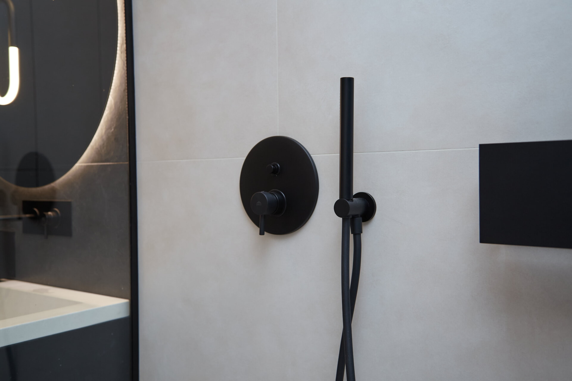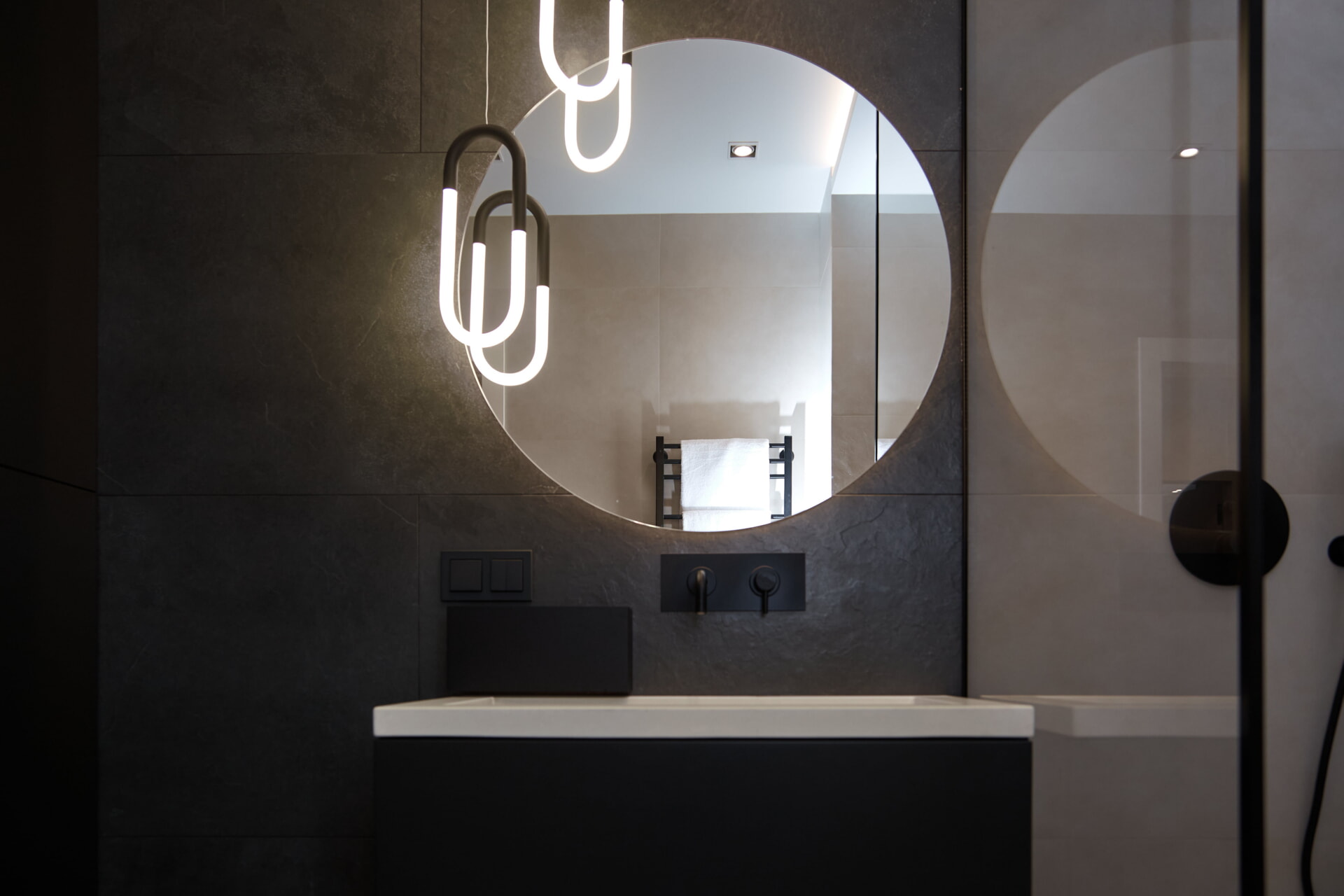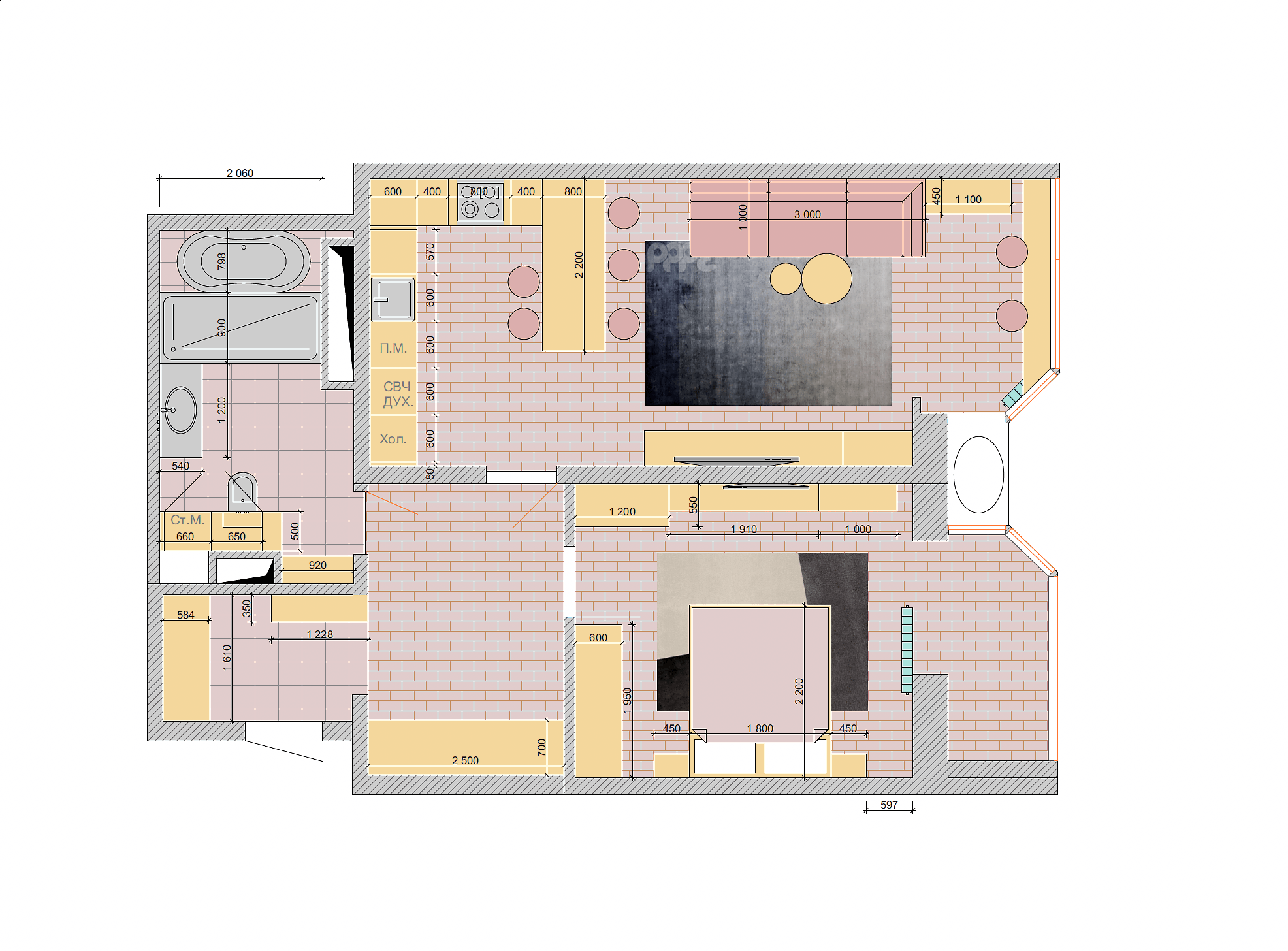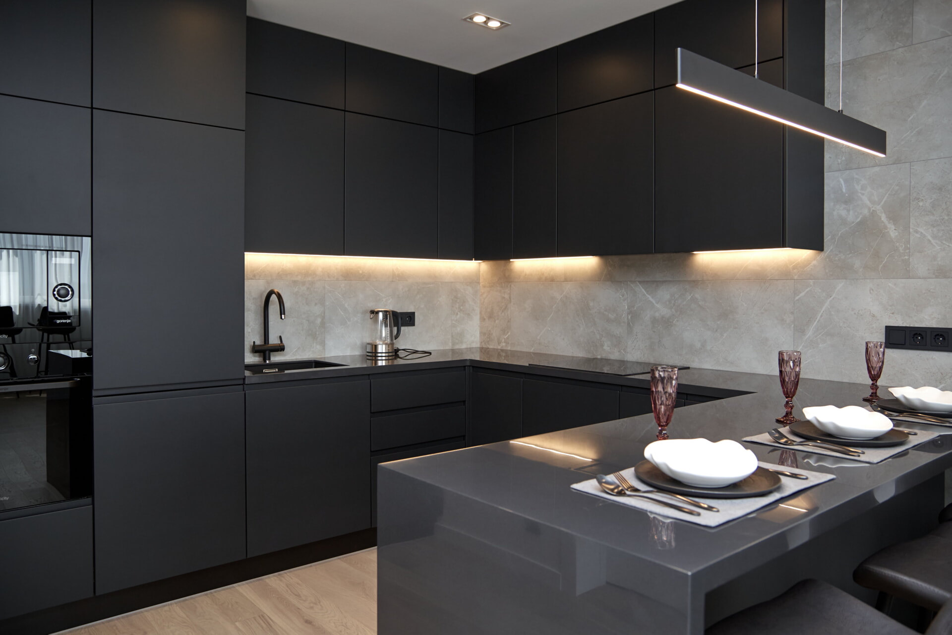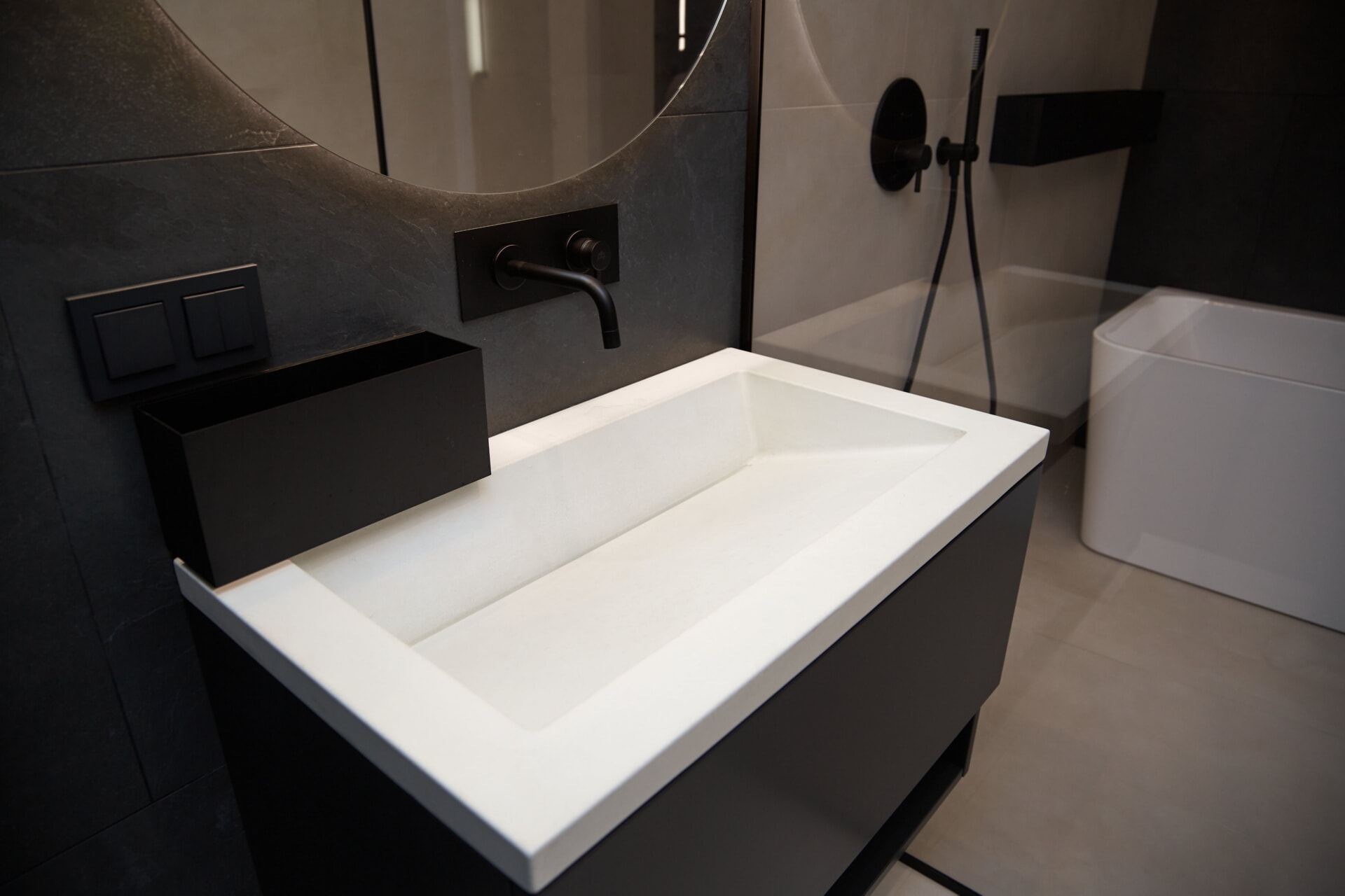 Проект реализован в современном стиле и влюбляет в себя с первого взгляда всех ценителей минималистичных интерьеров. В квартире разместилась полноценная спальня с выходом на лоджию, хол и прихожая с вместительными зонами хранения, просторный санузел, особой фишкой которого стало размещение как душевой, так и изящной отдельно стоящей ванны. Сердцем это квартиры является объединенная кухня-гостиная, в которой разместилась полноценная функциональная кухня с крылом-барной стойкой, а также зона гостиной с удобным модульным диваном.