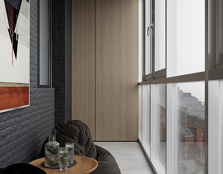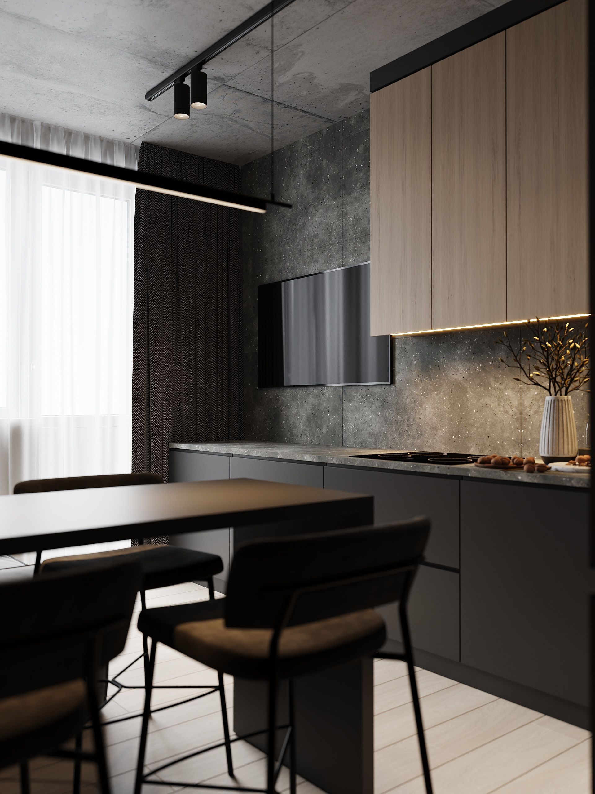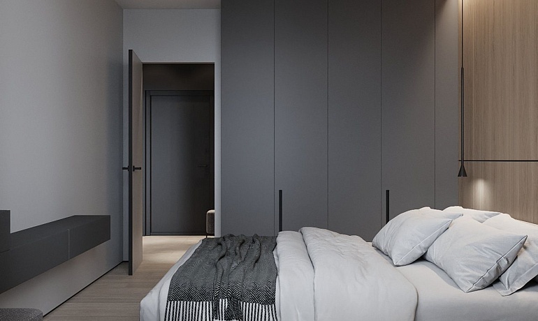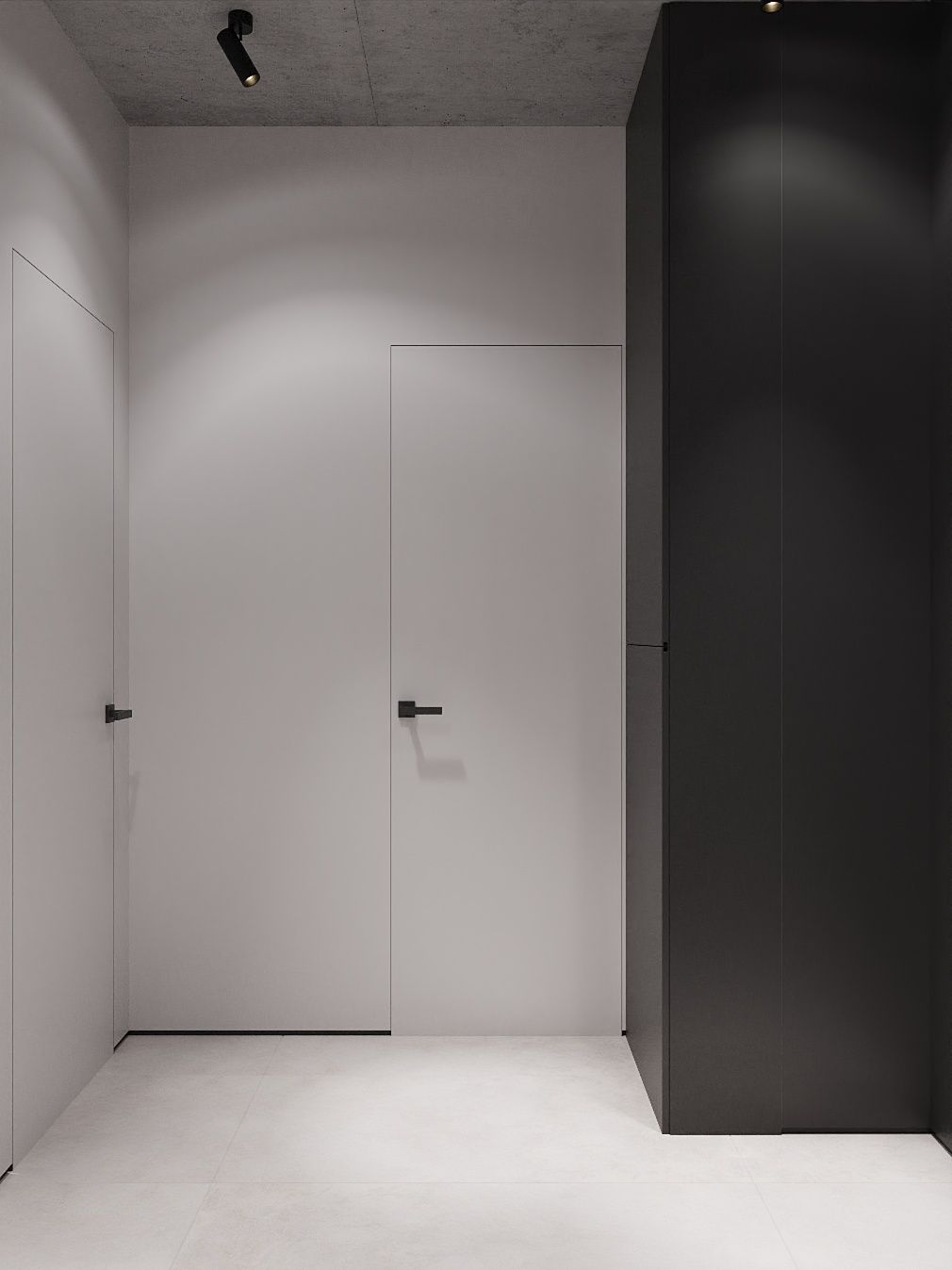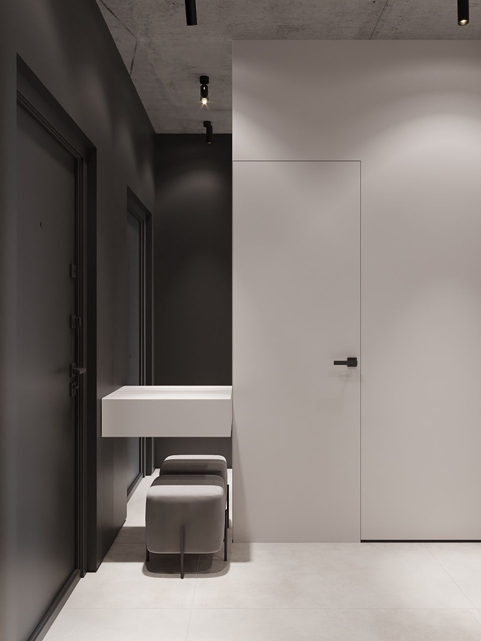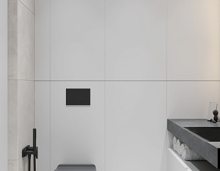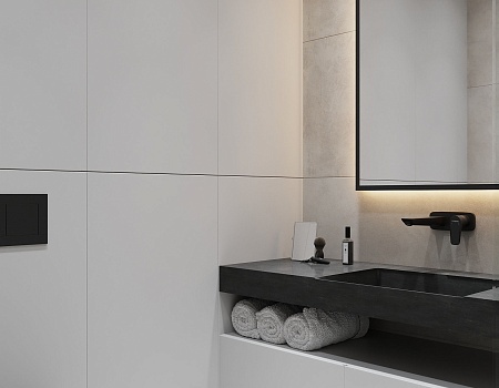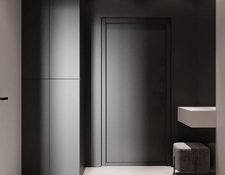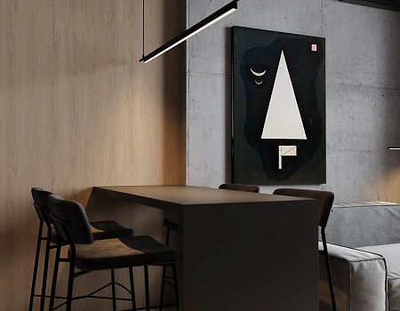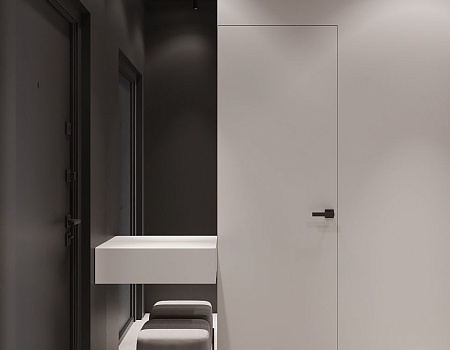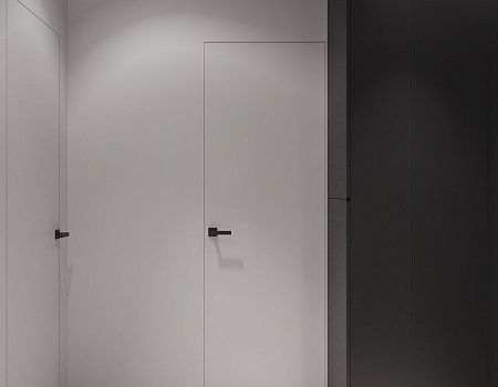 Пространство соединило в себе новейшие технологии и актуальные интерьерные решения: например, отделку стен и потолка под бетон в стиле лофт, двери скрытого монтажа, большое количество групп света и современные коммуникации.
