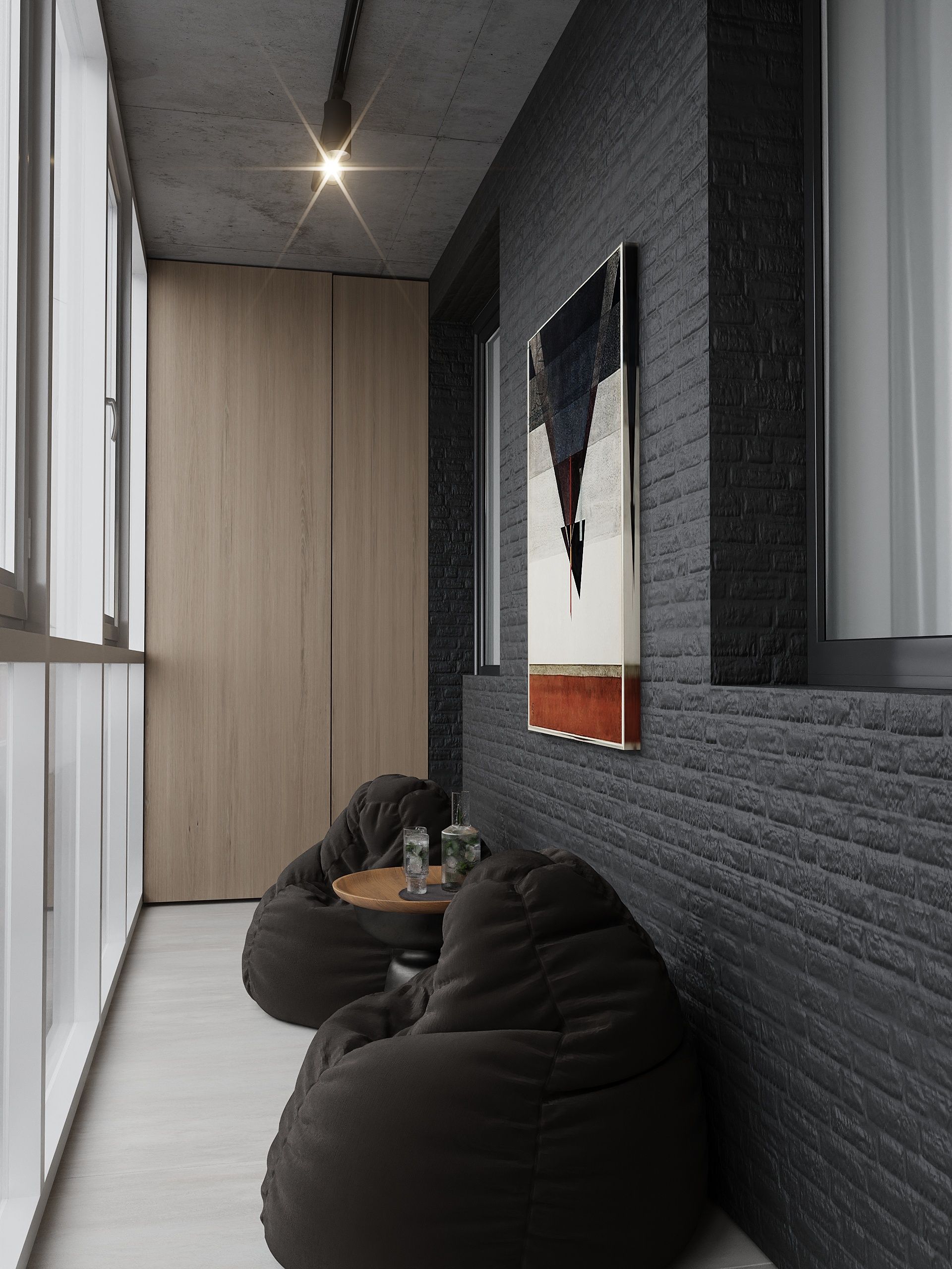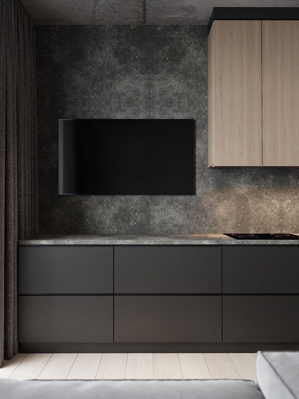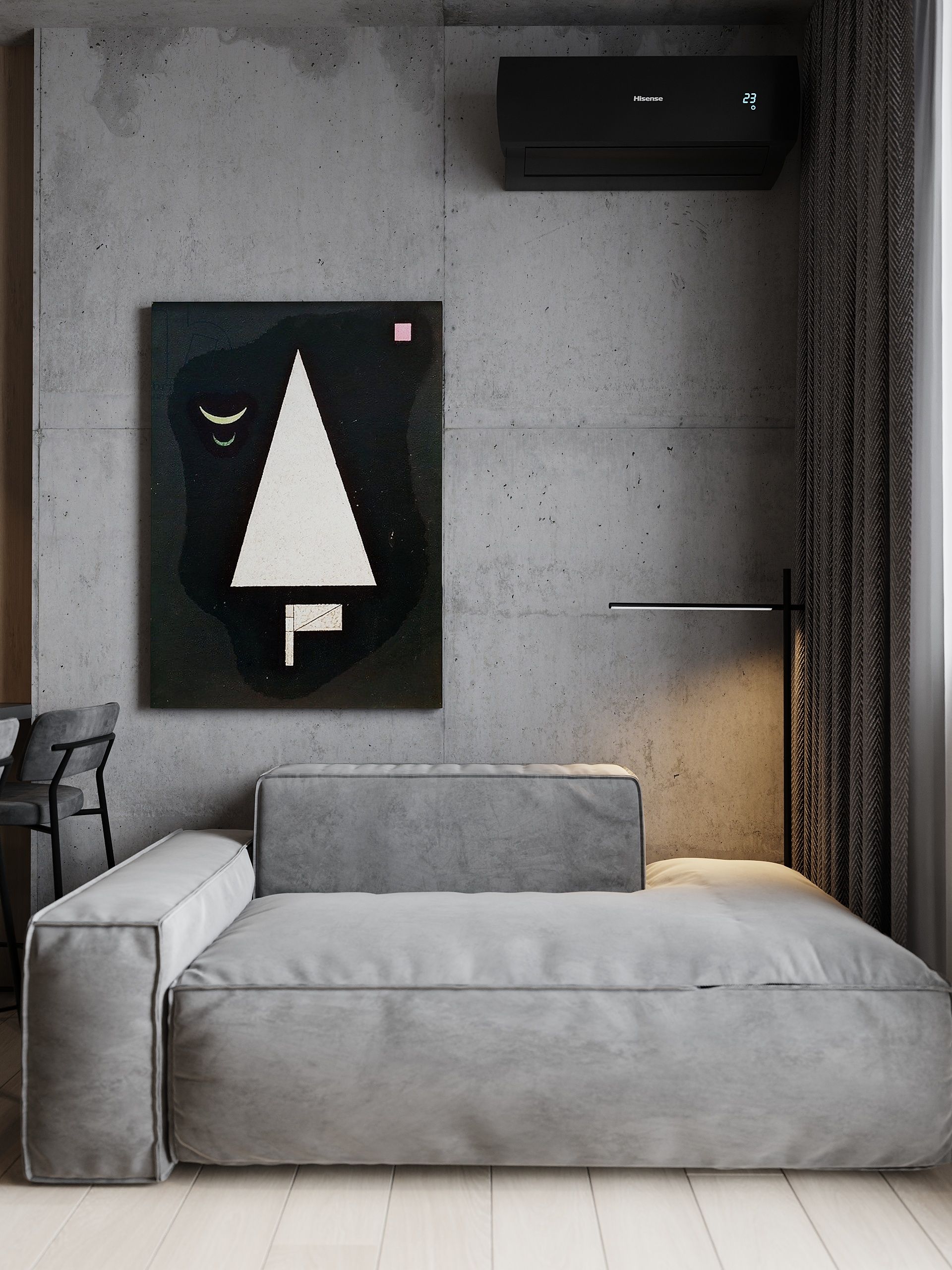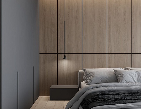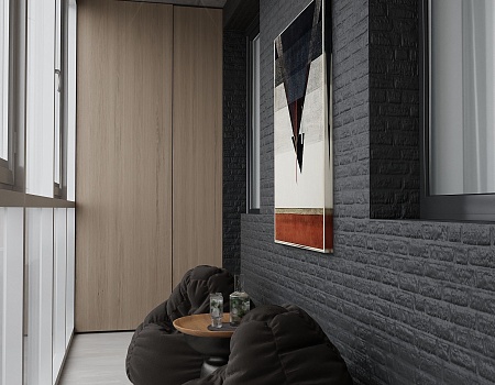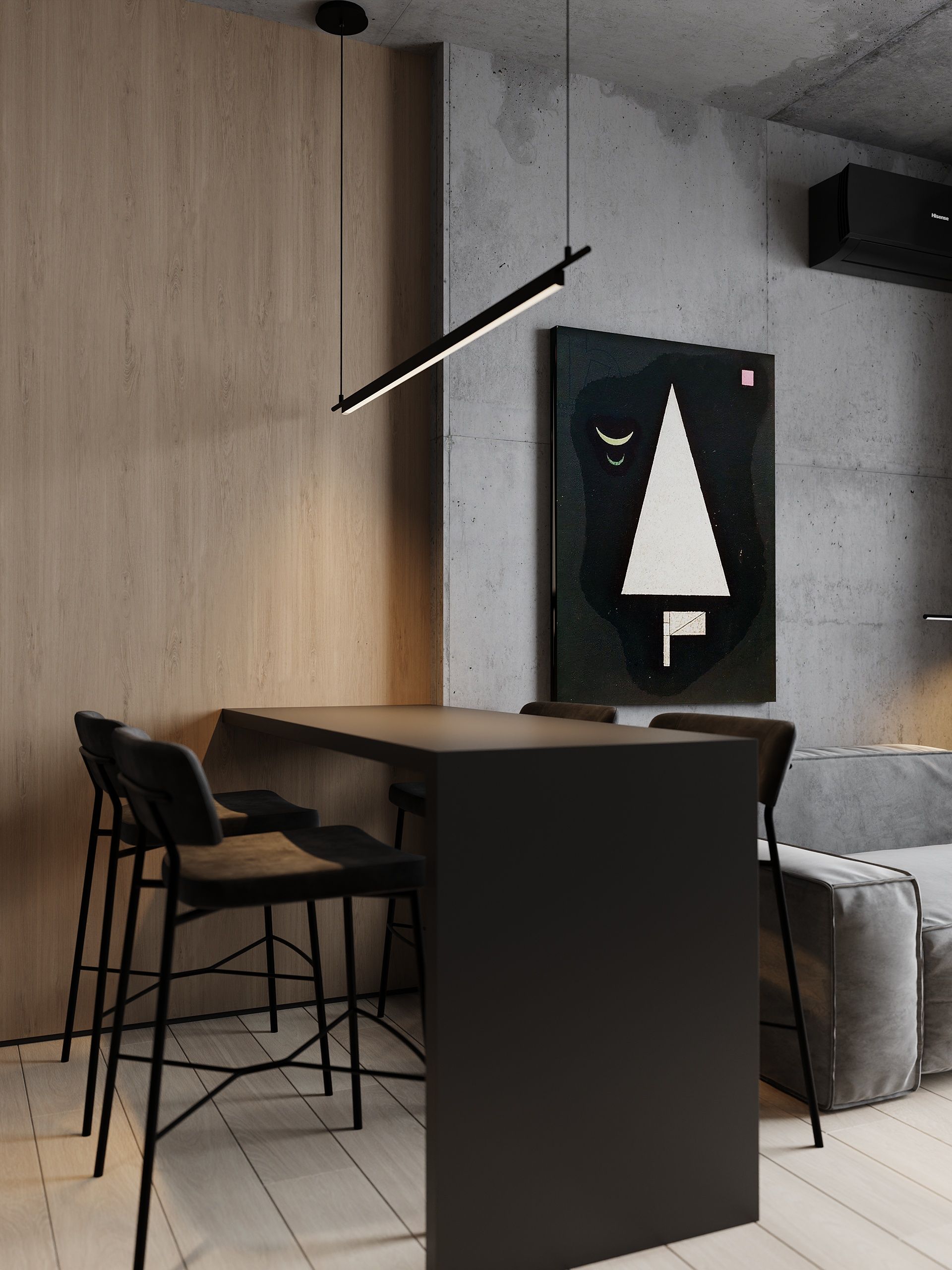Пространство соединило в себе новейшие технологии и актуальные интерьерные решения: например, отделку стен и потолка под бетон в стиле лофт, двери скрытого монтажа, большое количество групп света и современные коммуникации.