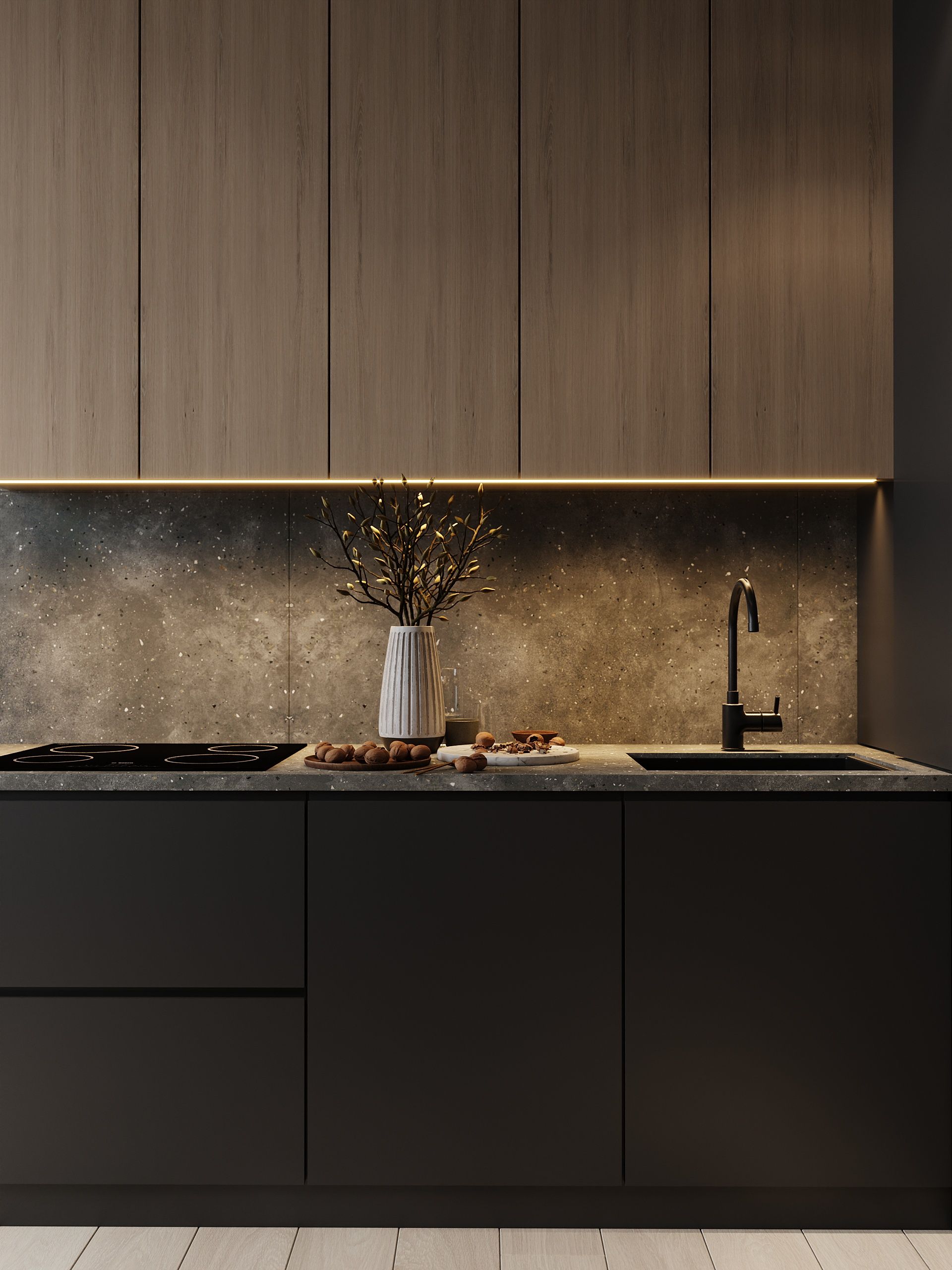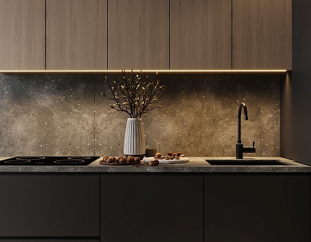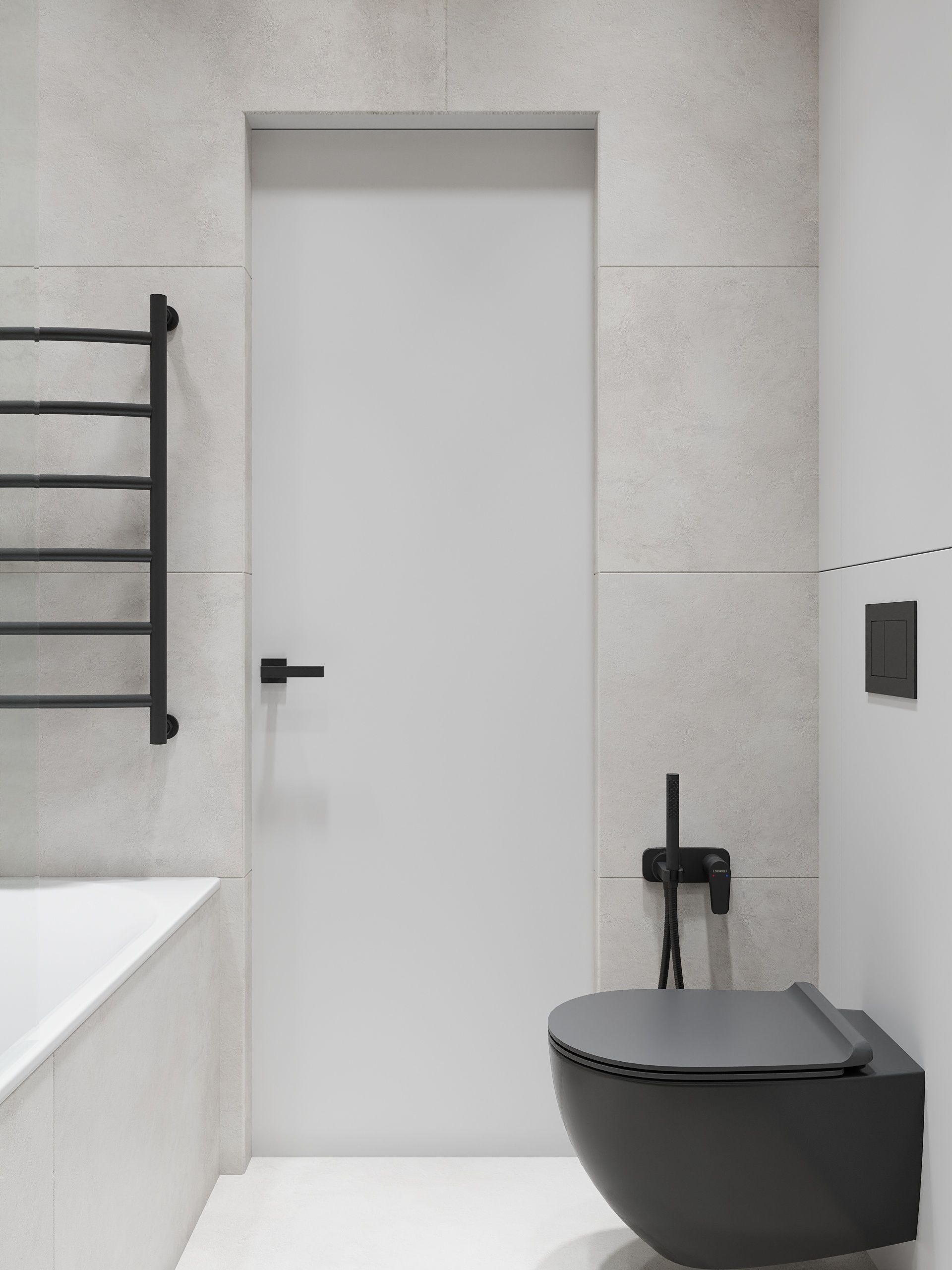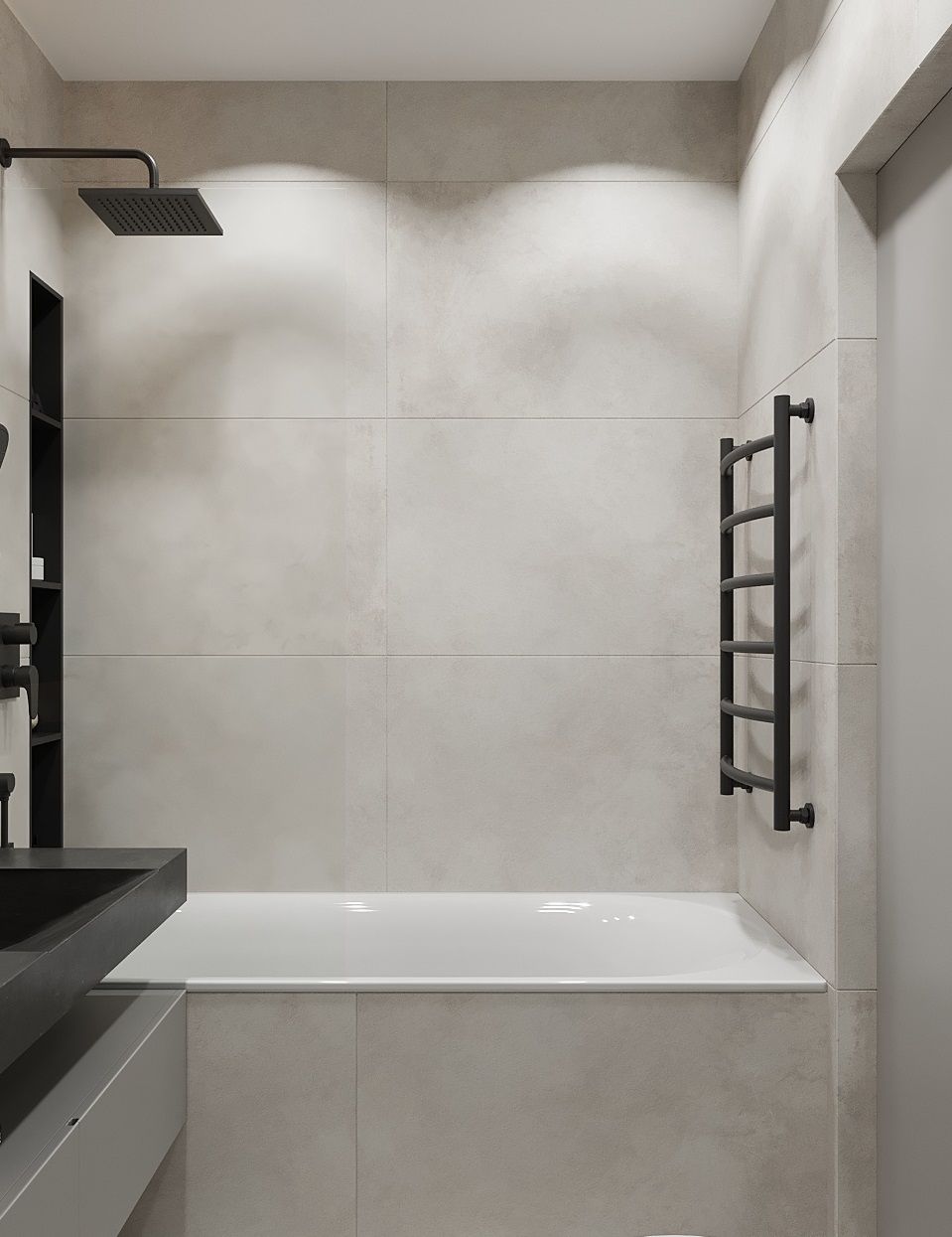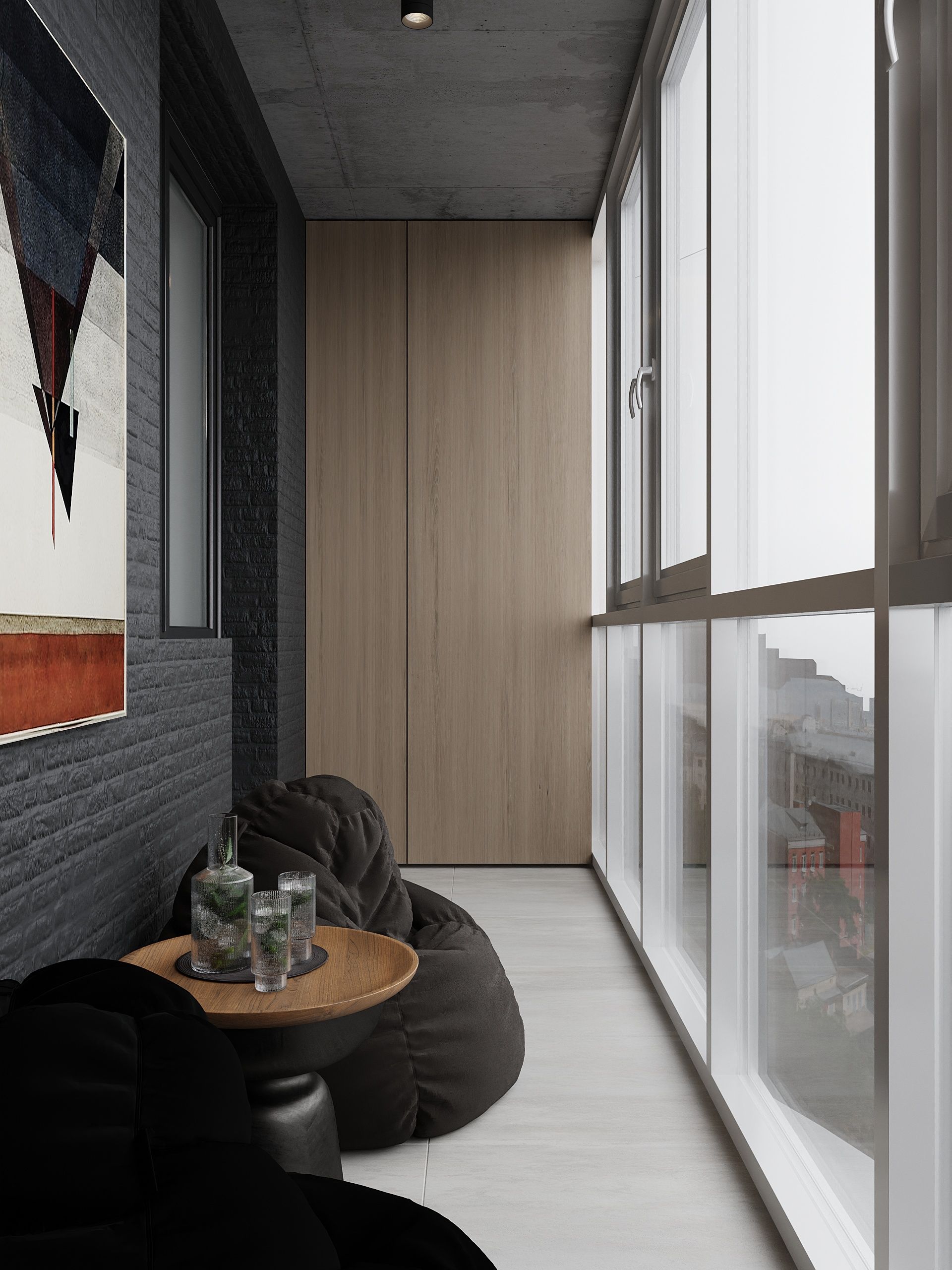 Пространство соединило в себе новейшие технологии и актуальные интерьерные решения: например, отделку стен и потолка под бетон в стиле лофт, двери скрытого монтажа, большое количество групп света и современные коммуникации.