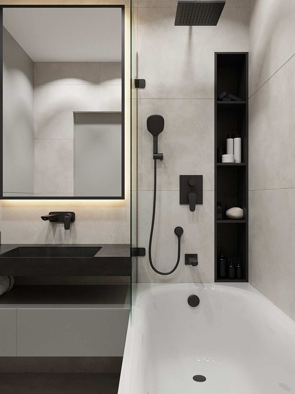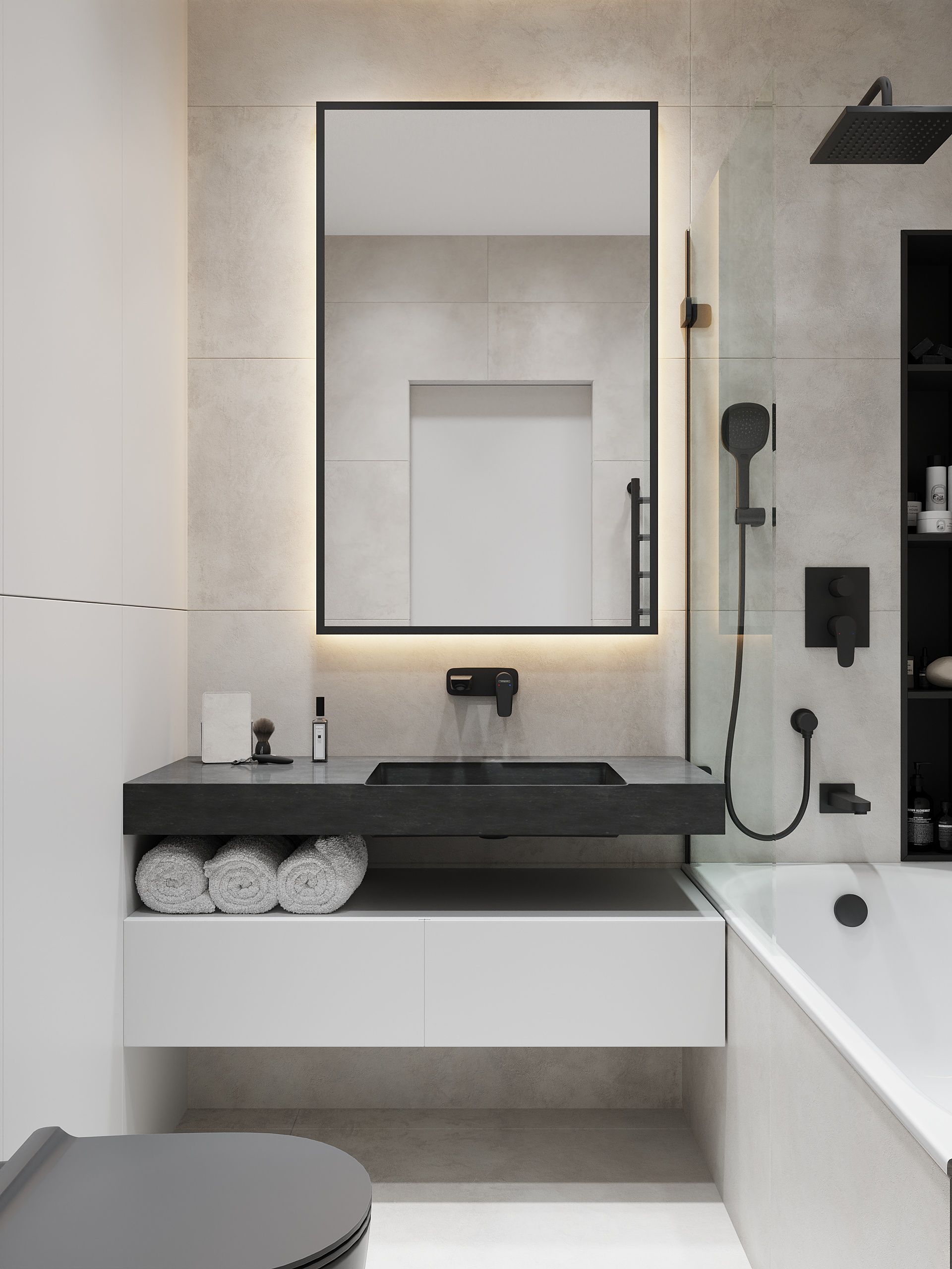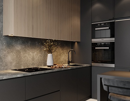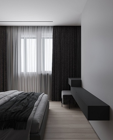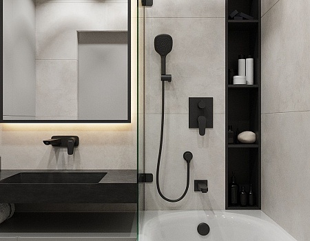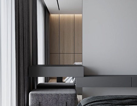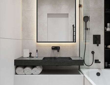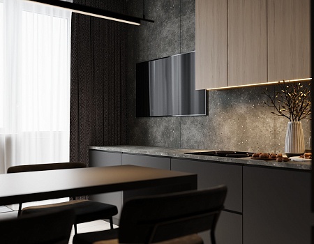 Проект выполнен в современном стиле с упором на минимализм и акцентом на серый цвет. В квартире разместились просторная кухня с мебельной группой и встроенной бытовой техникой, уютная спальная комната, стильный холл со множеством систем хранения и утеплённая лоджия. Особого внимание заслуживает монохромная ванная комната с черными аксессуарами и большой ванной. Купить однокомнатную квартиру в Краснодаре будет очень хорошим решением для вас!