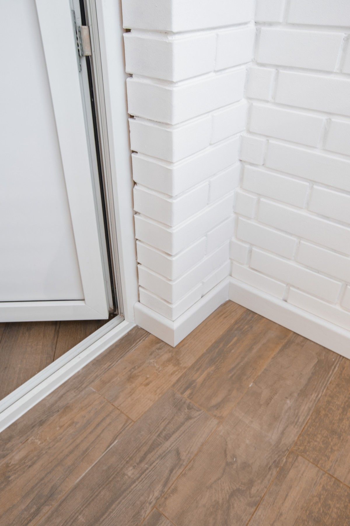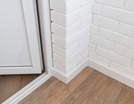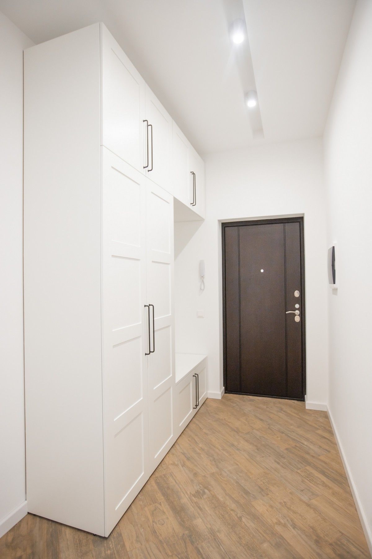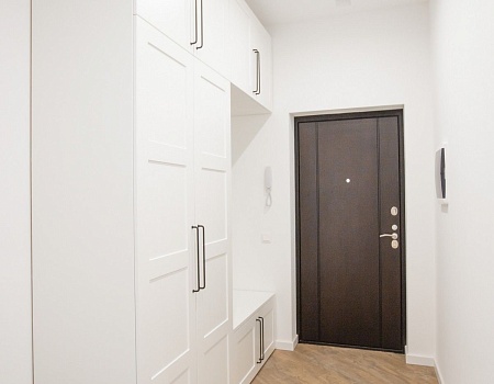 Утеплили балкон. В прихожей установили входную дверь от компании «Гардиан», вместительный шкаф для верхней одежды и электрический щит, который после закроется зеркалом. Проход между прихожей и коридором обрамили доборами и наличниками с двух сторон.
