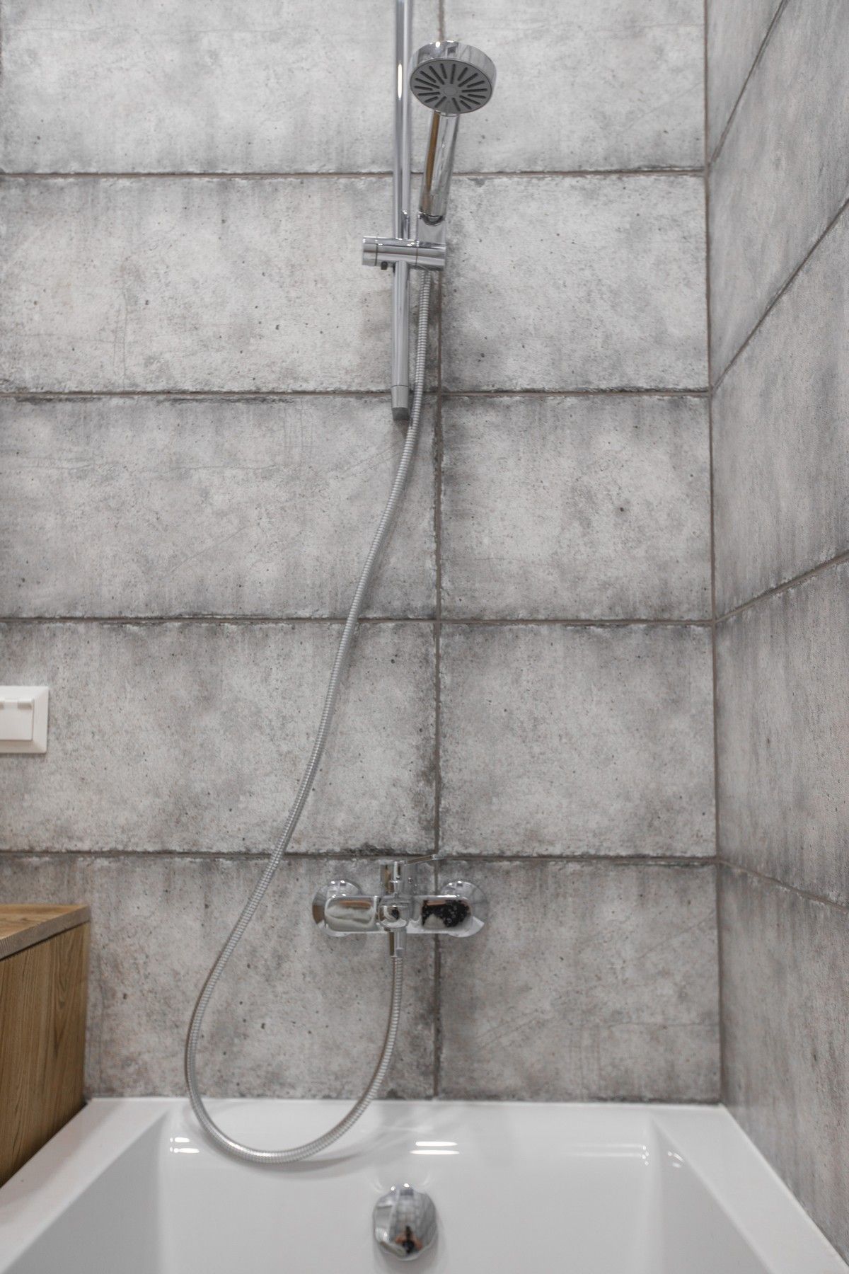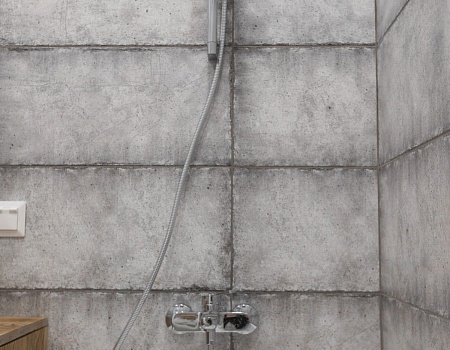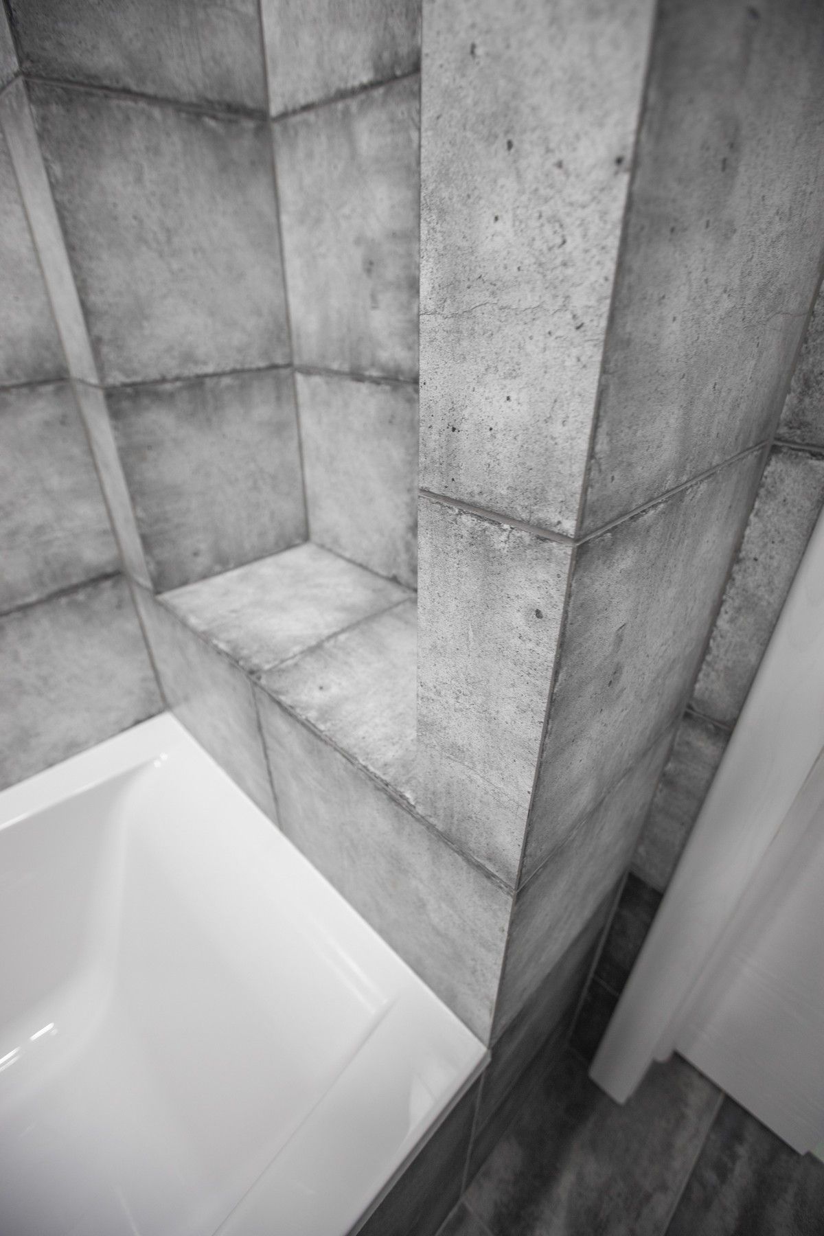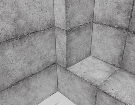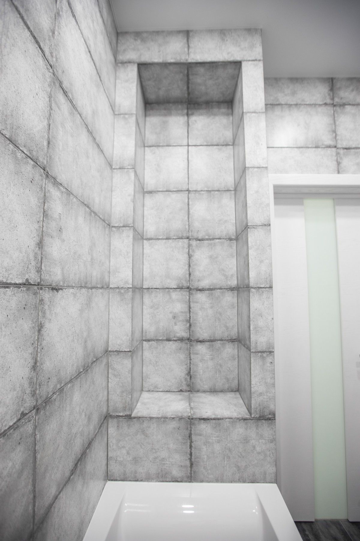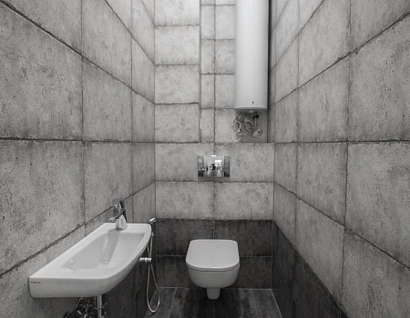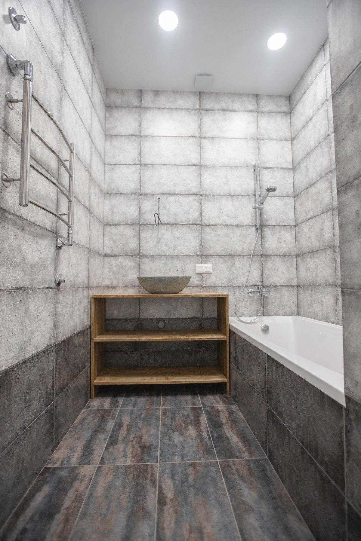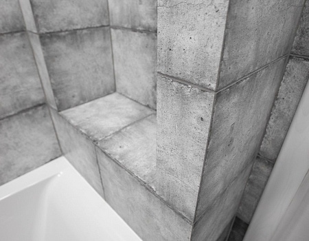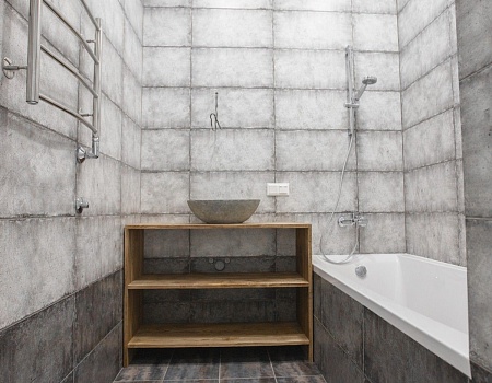 В ванной комнате уложили красивую, стильную плитку под бетон в стиле «loft», установили акриловую ванну. Изготовили из ГКЛ и облицевали плиткой нишу для хранения, установили водяной полотенцесушитель.