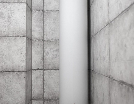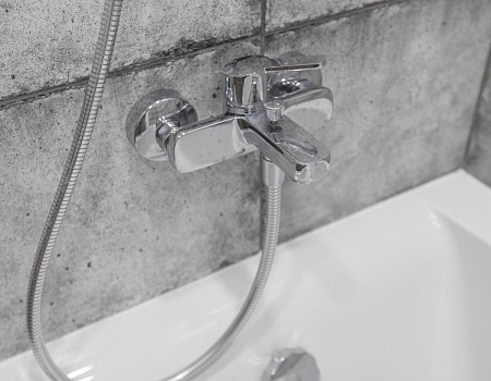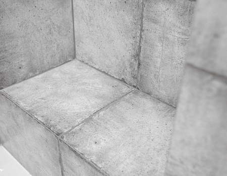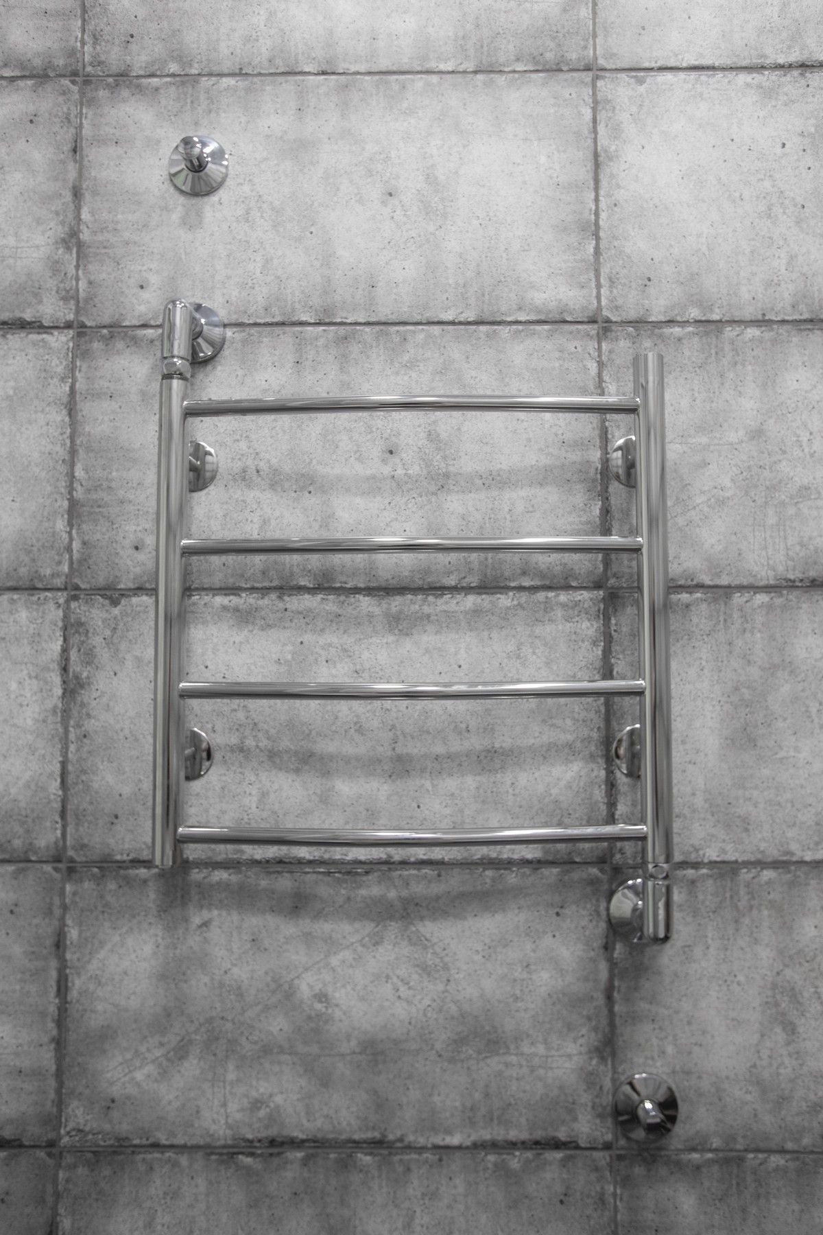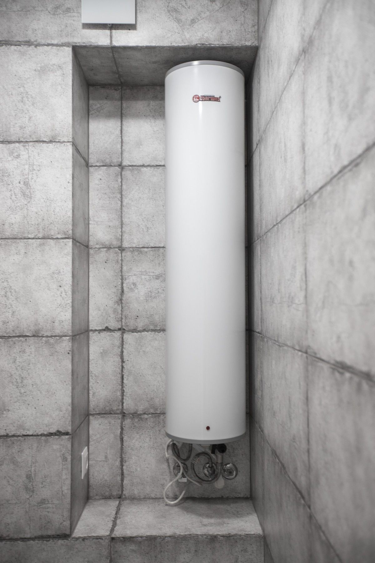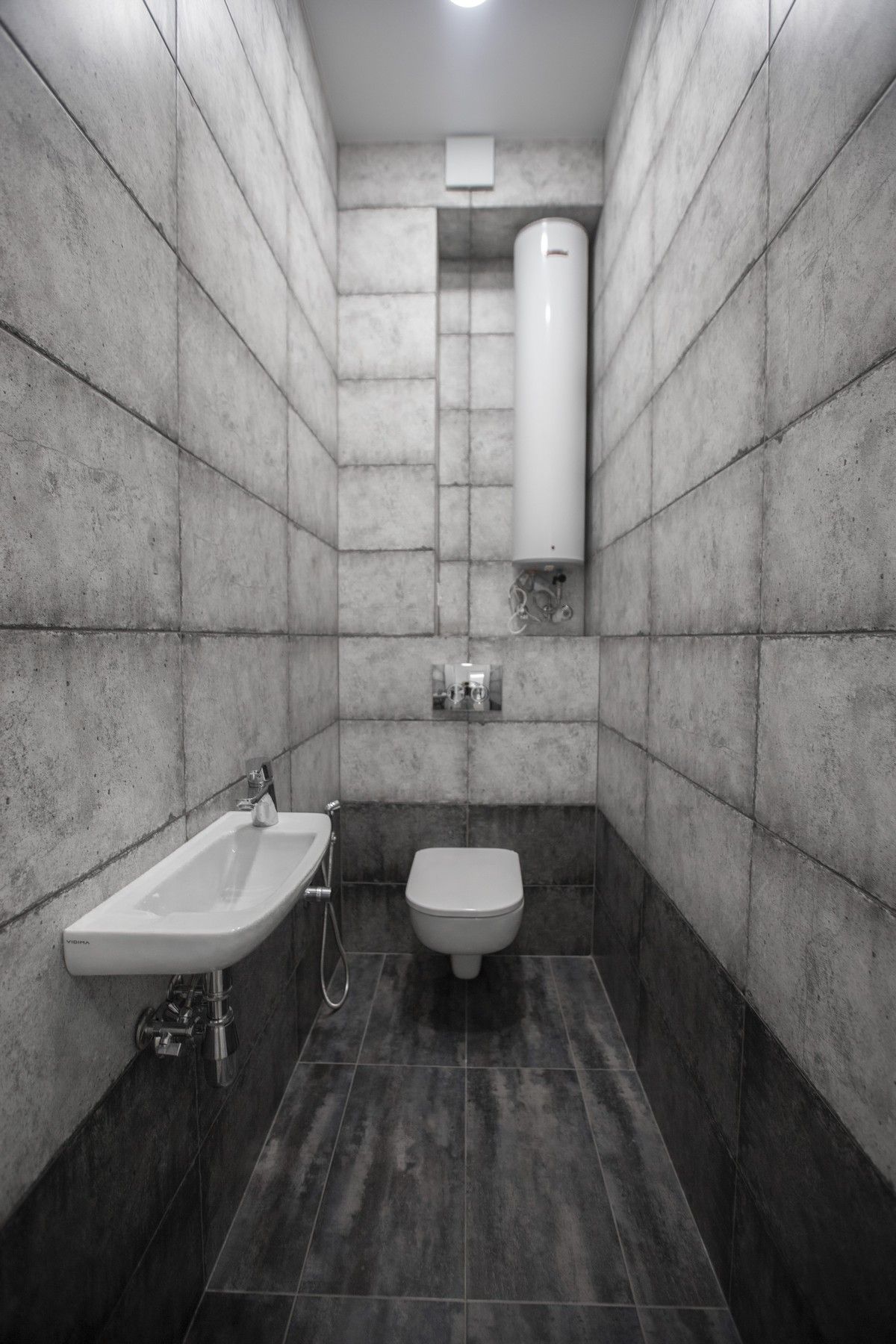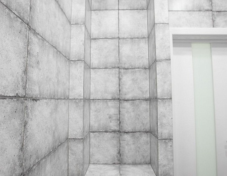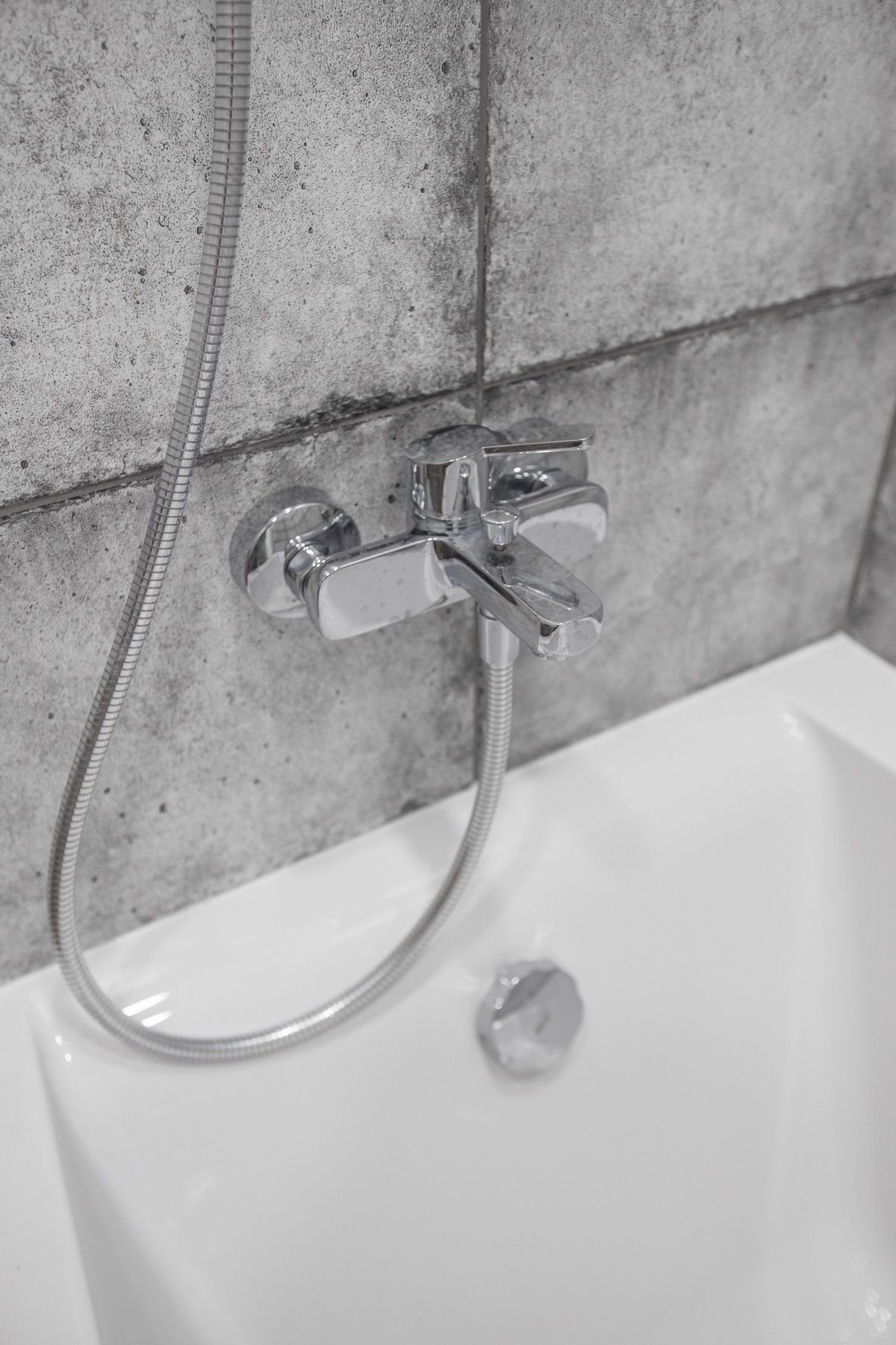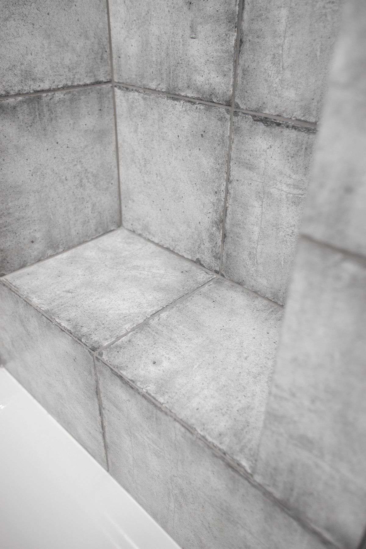В ванной комнате уложили красивую, стильную плитку под бетон в стиле «loft», установили акриловую ванну. Изготовили из ГКЛ и облицевали плиткой нишу для хранения, установили водяной полотенцесушитель.