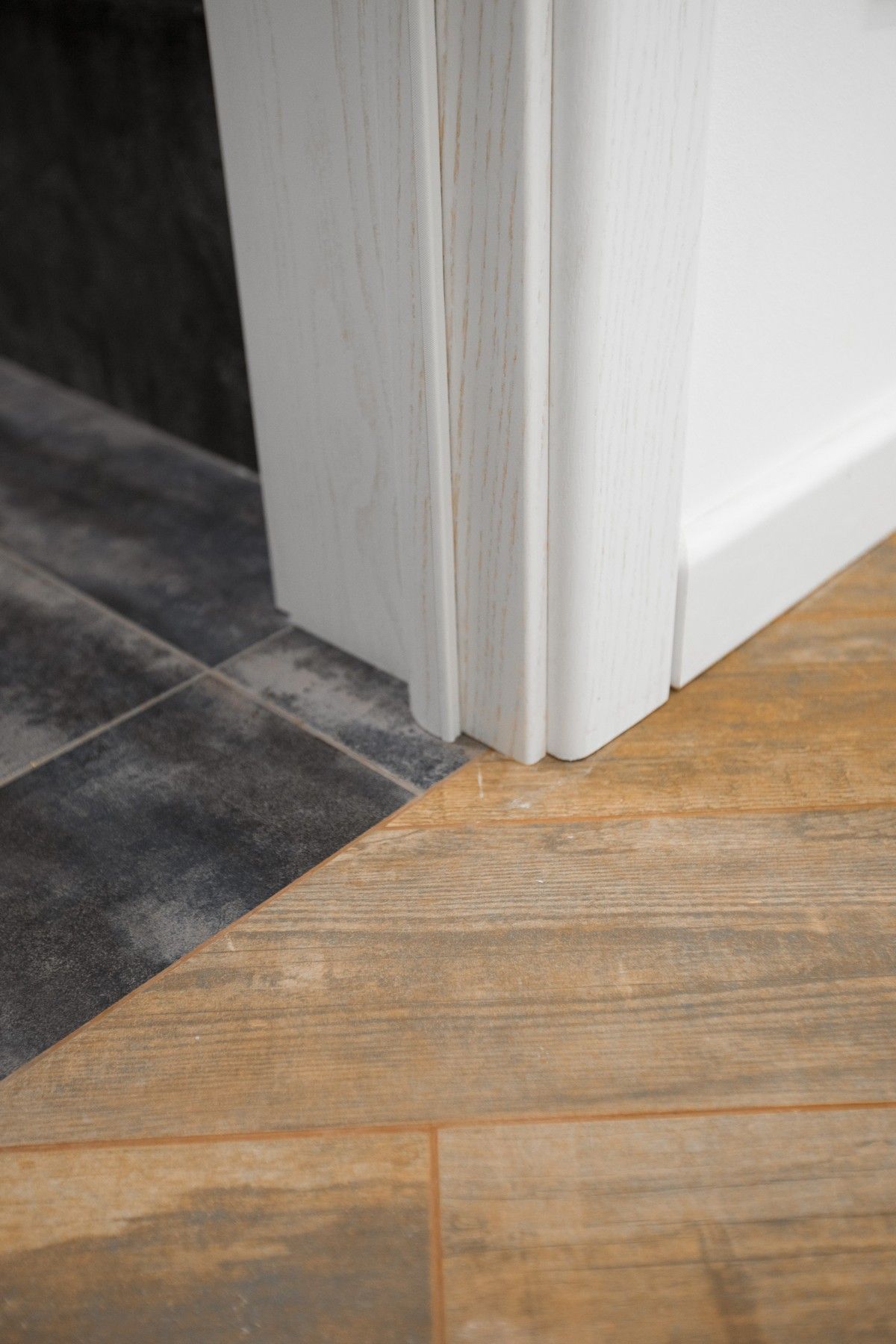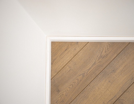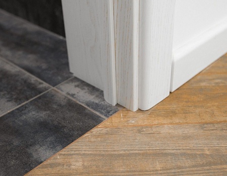 Чтобы уложить напольные покрытия в одной плоскости, мы выровняли полы, подготовили поверхность и залили стяжку в разных уровнях. Напольное покрытие в прихожей и санузле, на кухне и балконе — керамогранит под дерево, в остальных комнатах положили ламинат 33 класса. Также установили систему «тёплый пол»: на кухне и в санузле использовали термоматы, а на балконе — термокабель.
