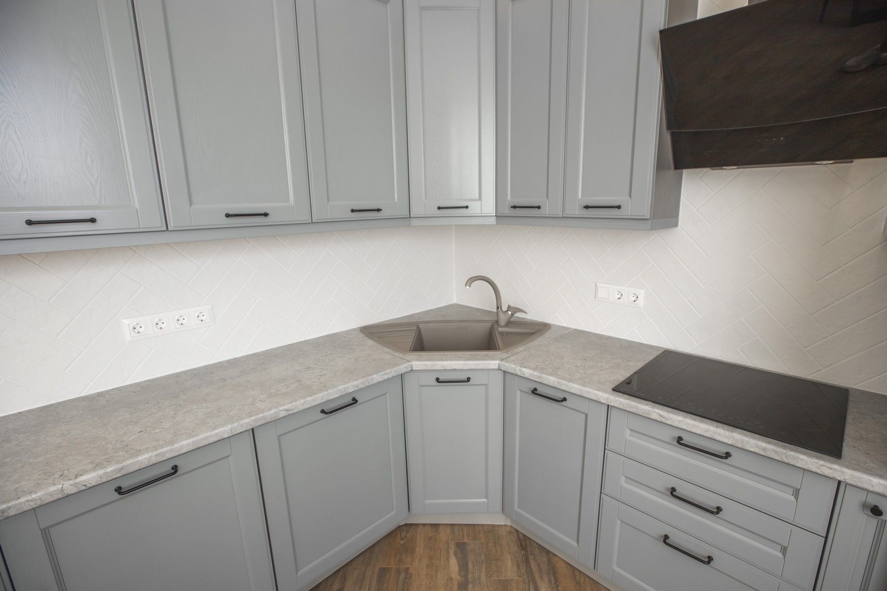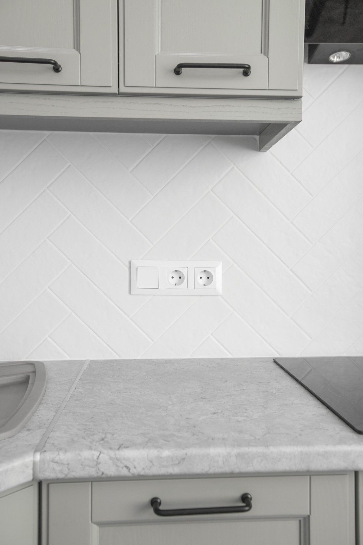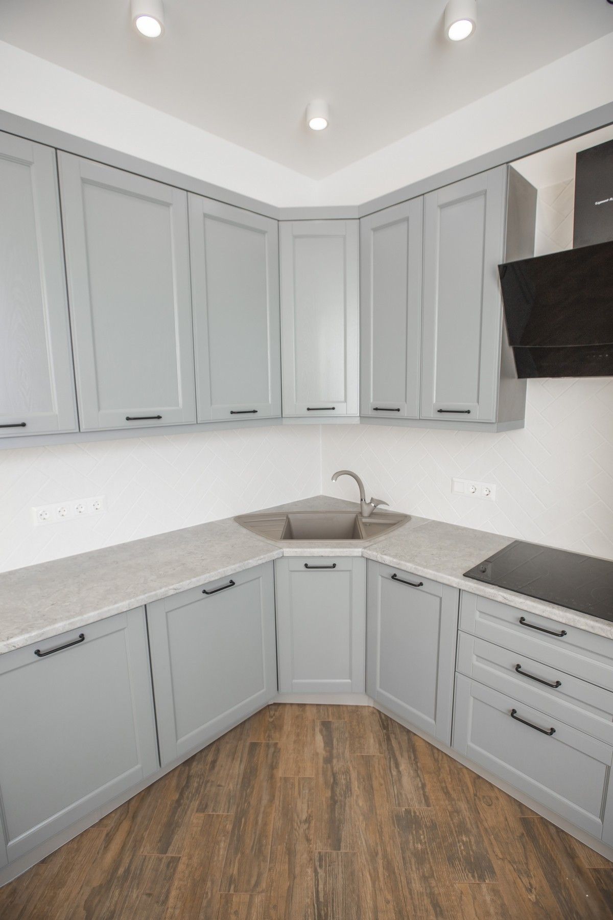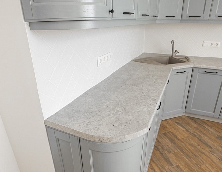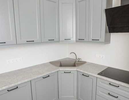 Установили кухонный гарнитур из массива, покрашенного в благородный серый цвет. Облицевали кухонный «фартук» мелкоразмерной белой плиткой.