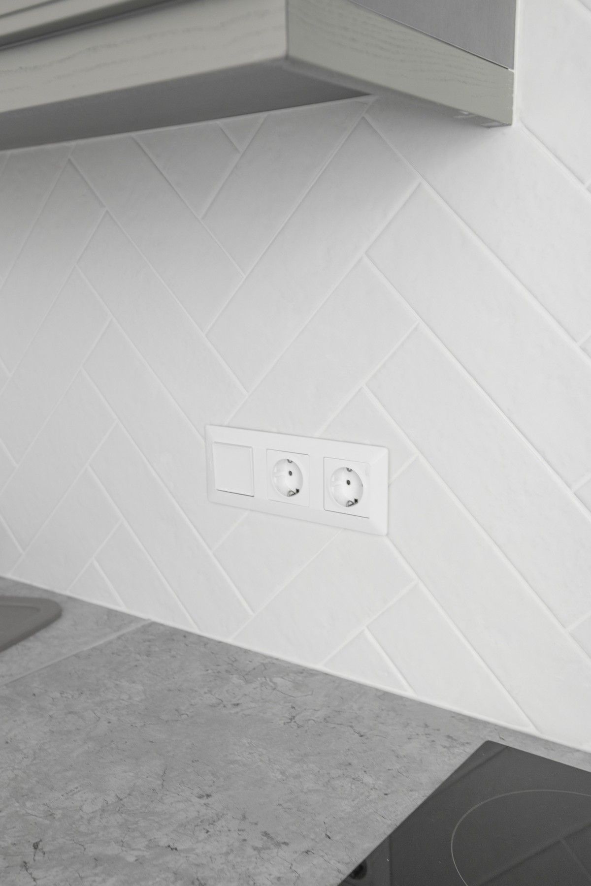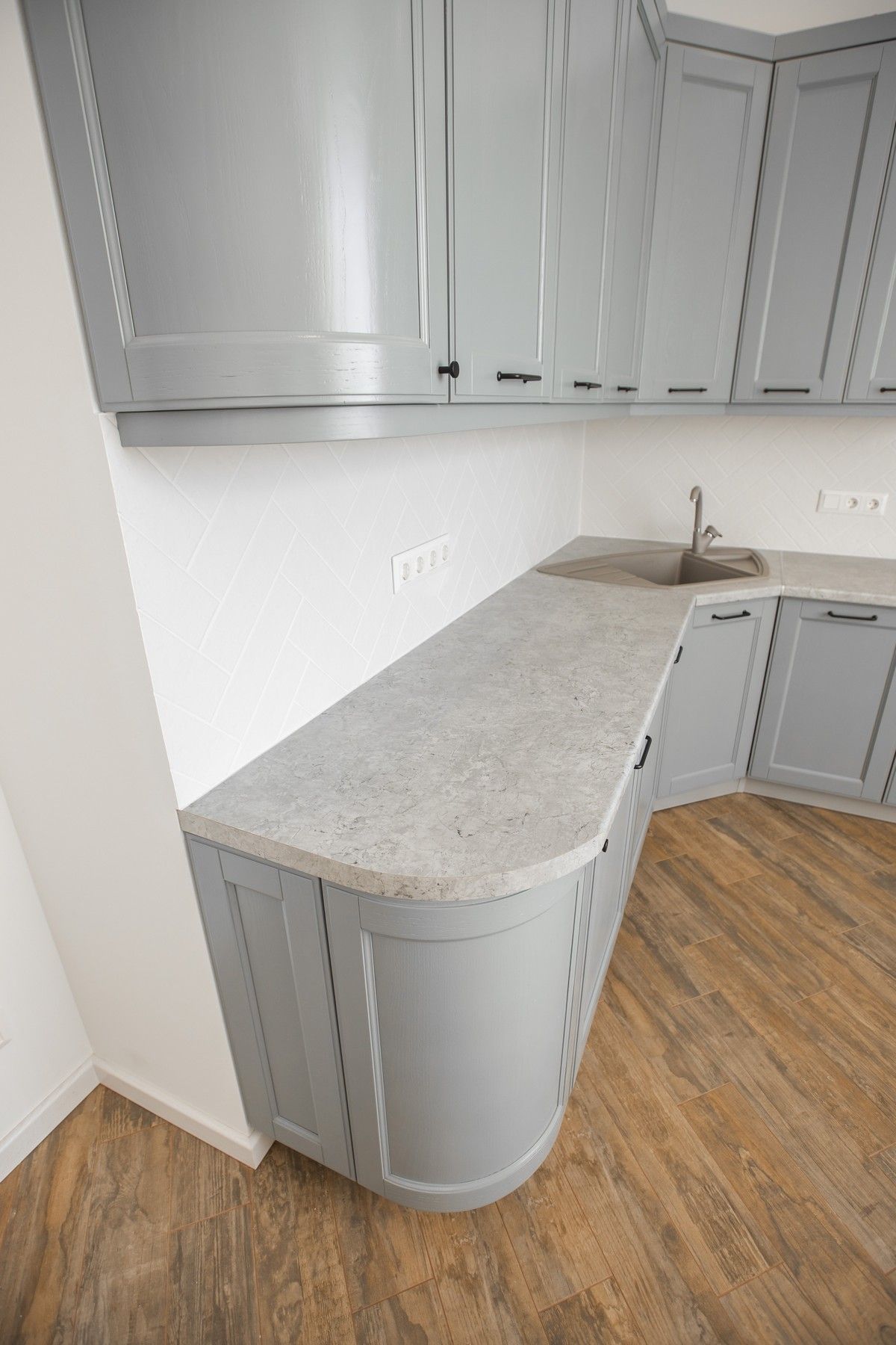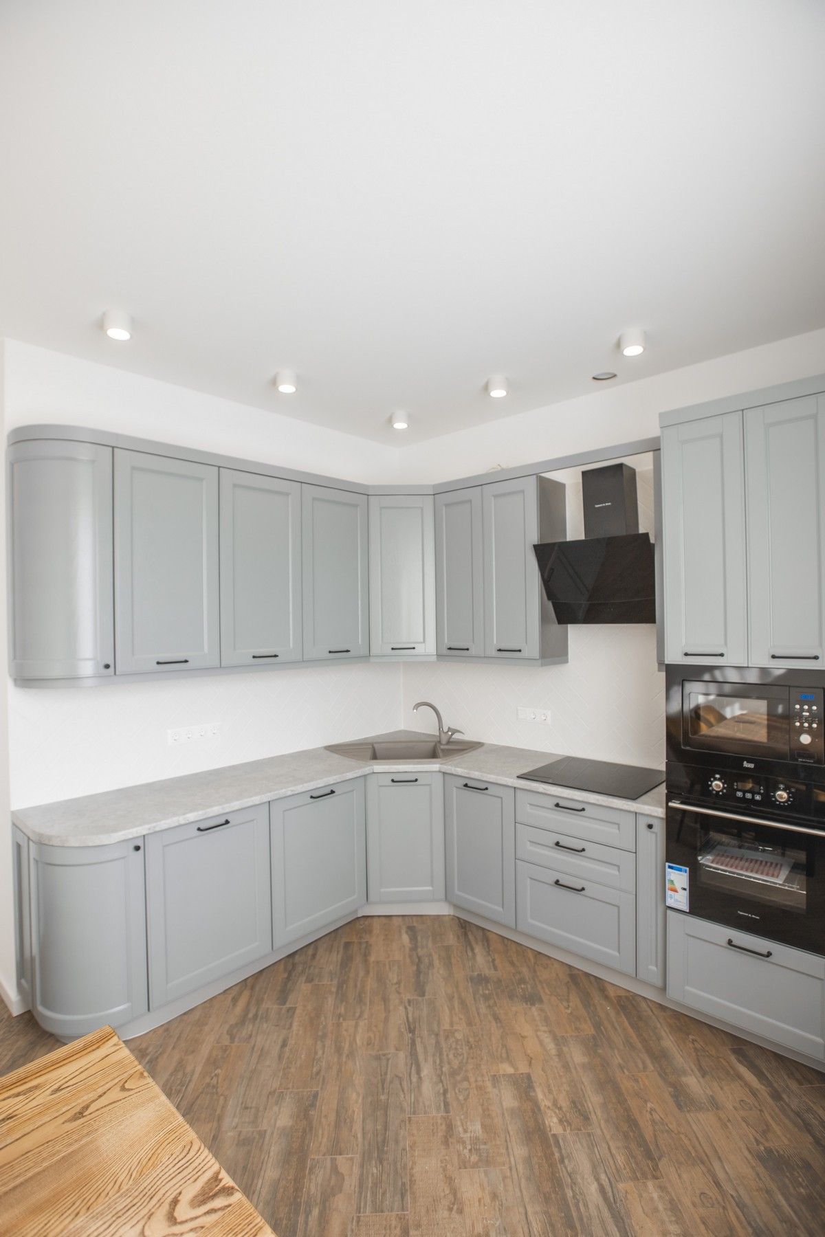Установили кухонный гарнитур из массива, покрашенного в благородный серый цвет. Облицевали кухонный «фартук» мелкоразмерной белой плиткой.