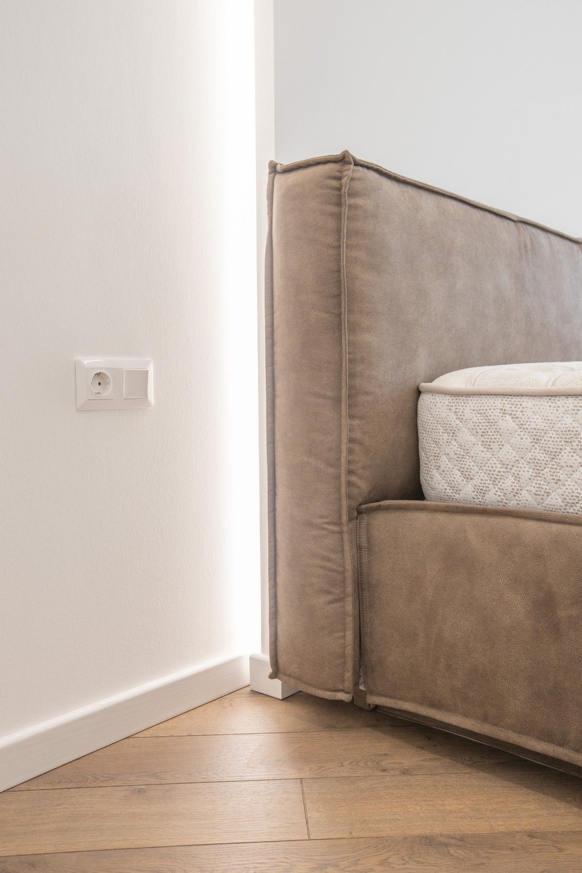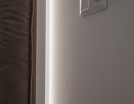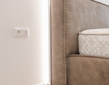 Изголовье кровати в спальной комнате выделили акцентной конструкцией из гипсокартона и светодиодной подсветки. В гостиной разделили освещение на несколько групп, основная люстры, точечные светильники и светодиодная подсветка.