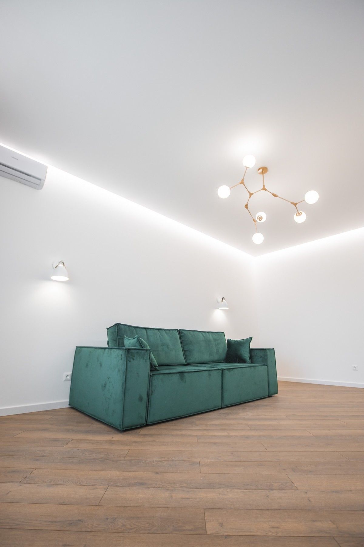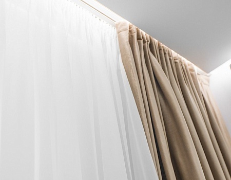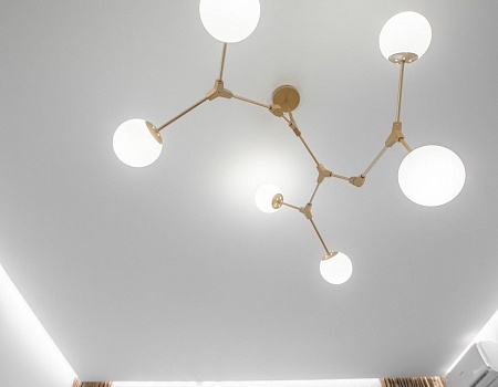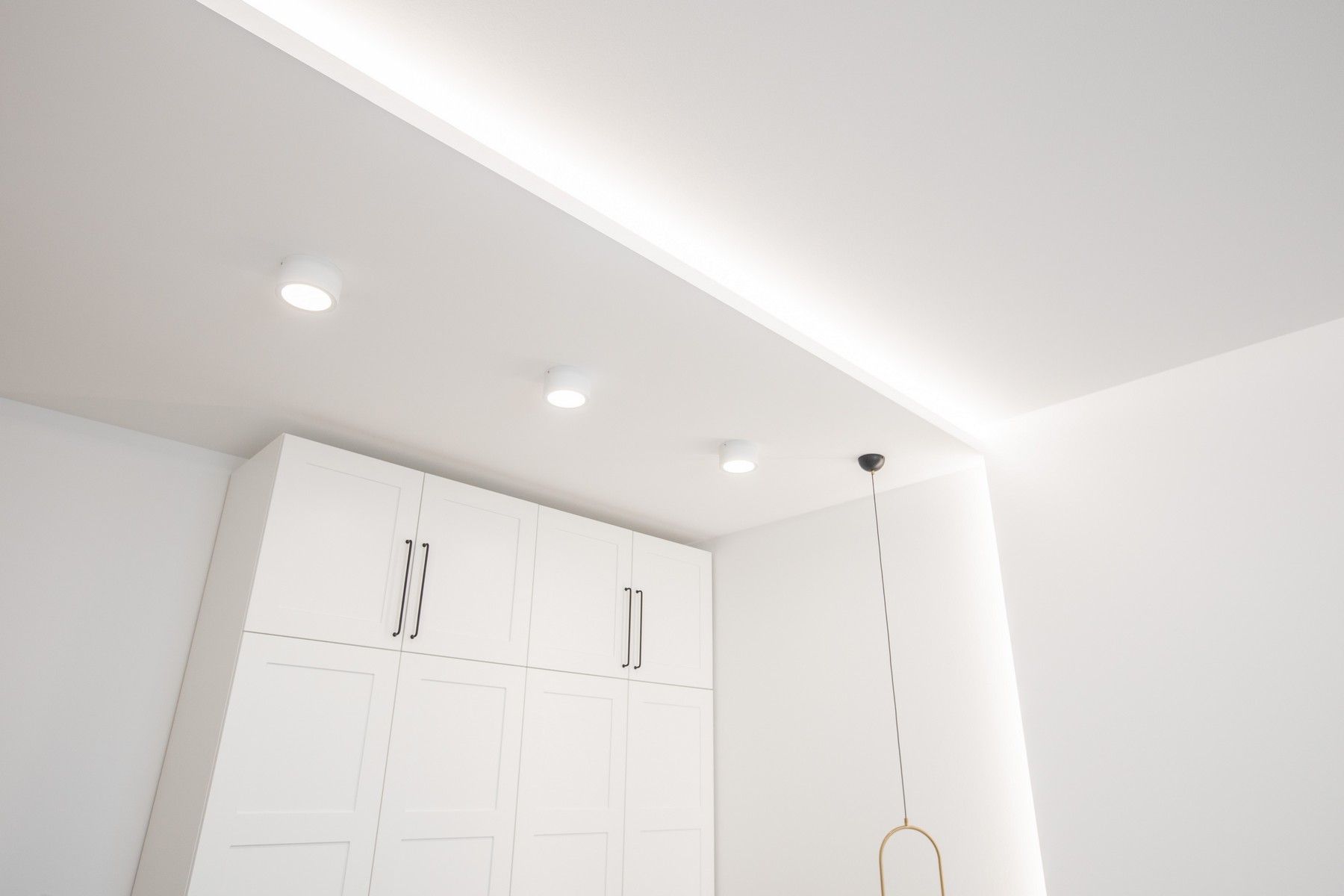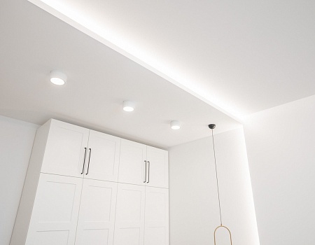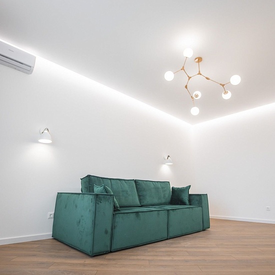 Потолок сделали из гипсокартона с нишами под накладные светильники и шторы. Чтобы создать «парящий» эффект в гостиной, мы сделали нишу со светодиодной лентой по периметру комнаты.
