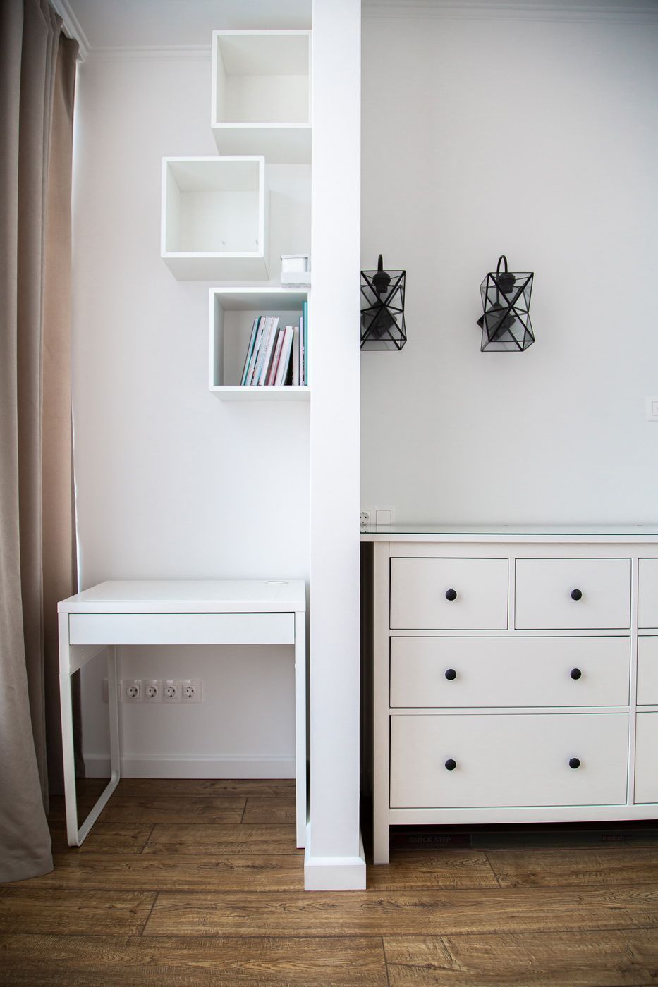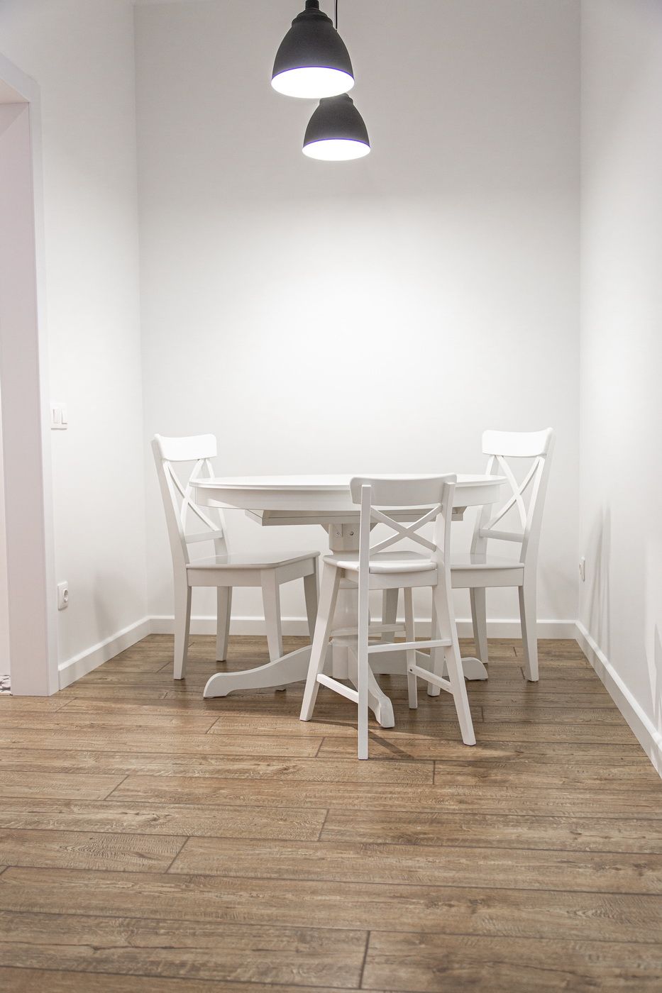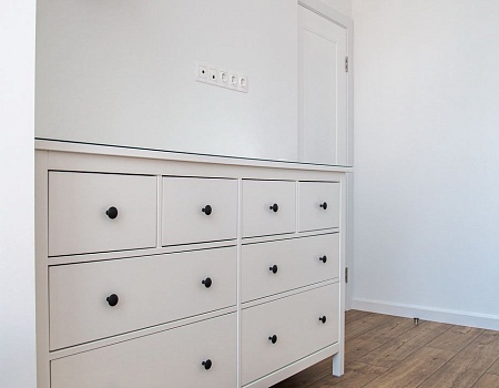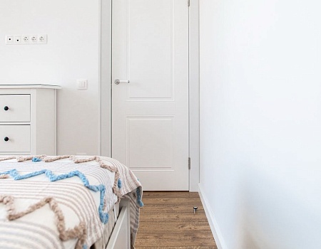 Мы выстроили новые межкомнатные перегородки из гипсокартона, залили стяжку в разных уровнях, чтобы разные напольные покрытия получились в одной плоскости. Все стены идеально выровняли и покрасили в белый цвет. Такое решение позволило визуально еще больше увеличить пространство и реализовать идею скандинавского стиля.