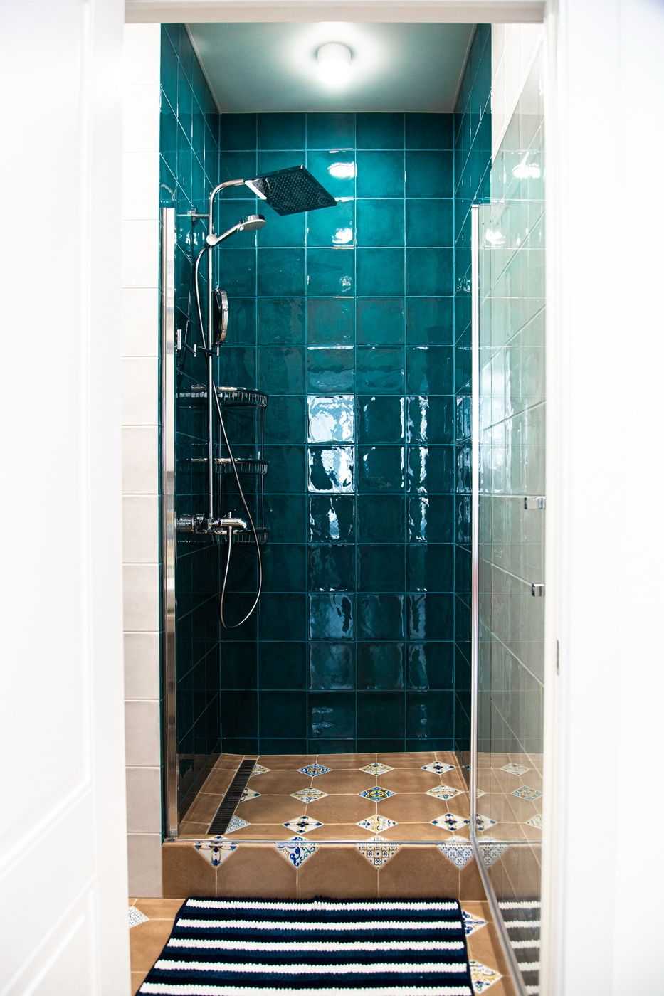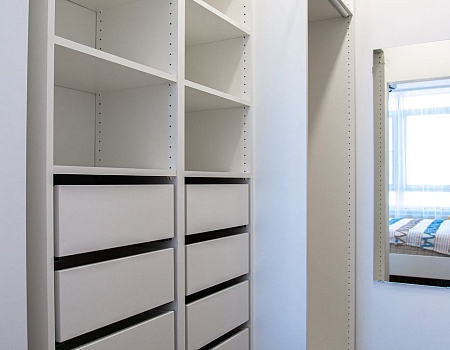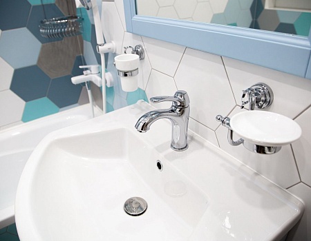 Потолки мы оштукатурили по маякам чтобы сохранить максимальную высоту, потолки в зоне лоджии сделали из ГКЛ для того чтобы была возможность их утеплить и сделать ниши под шторы, в санузлах использовали натяжной потолок. Для удобство всех членов семьи в квартире предусмотрели раздельные санузлы.