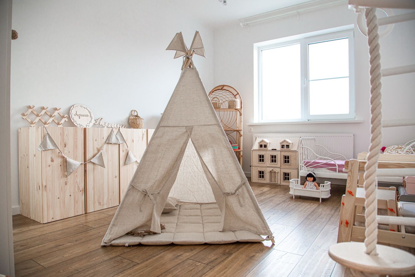 Стильный интерьер с акцентном на натуральность и естественность: оттенки дерева, тёплое освещение, обилие уютного текстиля и природный декор.
