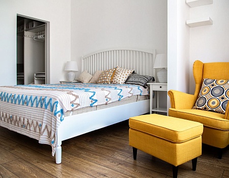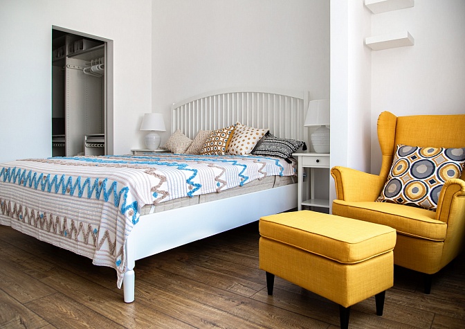 Запоминающийся проект с необычной «фишкой» — большой ванной, которая разместилась в спальной комнате.