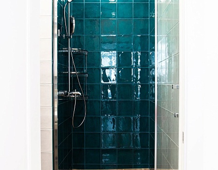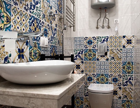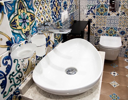Первый санунзел оборудован инсталляцией с подвесным унитазом и душевой кабиной в строительном исполнении. Второй санузел имеет просторную акриловую ванную и также инсталляцию с унитазом. В обоих санузлах смонтирован теплый пол, а на случай отключения горячей воды в одном из санузлов установлен бойлер.