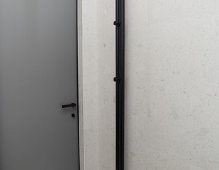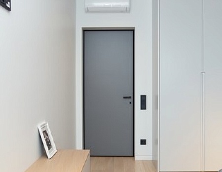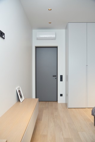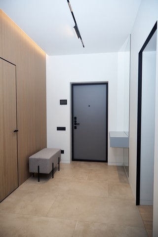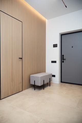 В прихожей, площадью 12 кв.метров, расположили гардеробную. Для этого выстроили перегородку и декорировали её шпонированными панелями в оттенке под натуральное дерево. В ней разместили большое количество мест хранения, чтобы спрятать вещи и сохранить минималистичность интерьера.