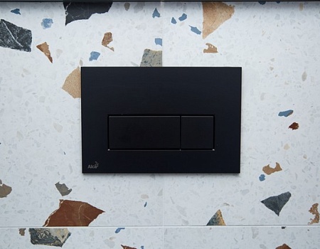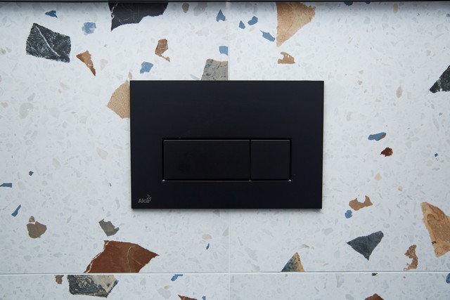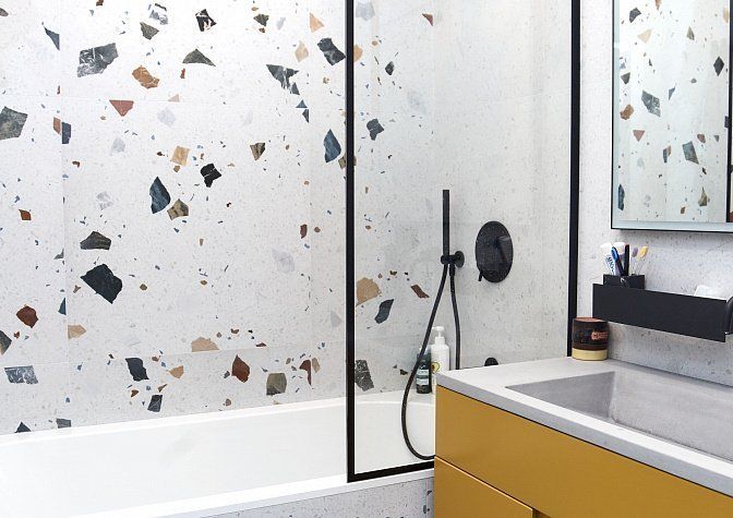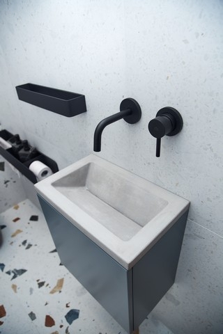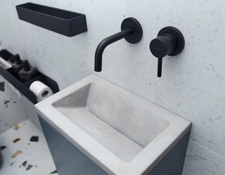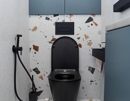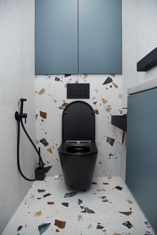 В квартире раздельный санузел. В туалете расположили подвесную инсталляцию с унитазом и небольшую раковину из бетона со смесителями скрытого монтажа. В ванной комнате установили ванну со стеклянным ограждением, раковину из бетона со смесителями встроенного монтажа, зеркало с подсветкой, системы хранения и полотенцесушитель в чёрном оттенке.