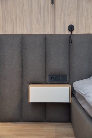 В спальной комнате родителей декорировали изголовье кровати с помощью мягких панелей и ЛДСП-панелей, установили вместительный шкаф, будуар и ТВ-зону. Для отопления выбрали вертикальный трубчатый радиатор.