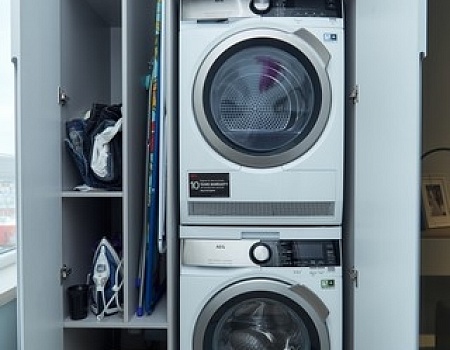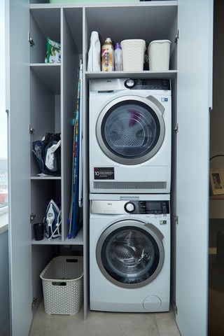 Вход в зону лоджии организовали с помощью большой стеклянной перегородки с раздвижной дверью, предварительно утеплив балкон. Также со стороны лоджии мы разобрали лицевой кирпич, чтобы увеличить площадь помещения. Эта лоджия стала особенной — в ней разместилось не только рабочее место, но и зона постирочной. Стиральную и сушильную машину, а также технику и все средства для уборки мы расположили за мебельной конструкцией.