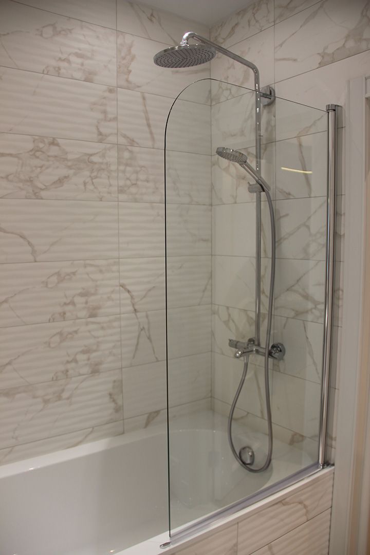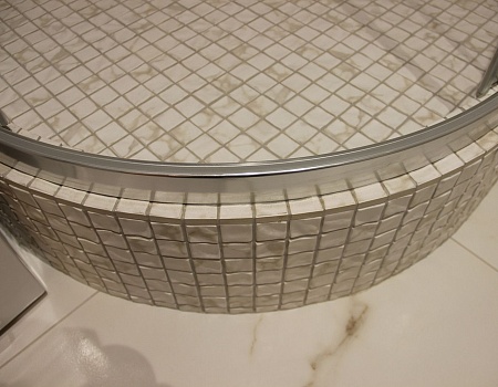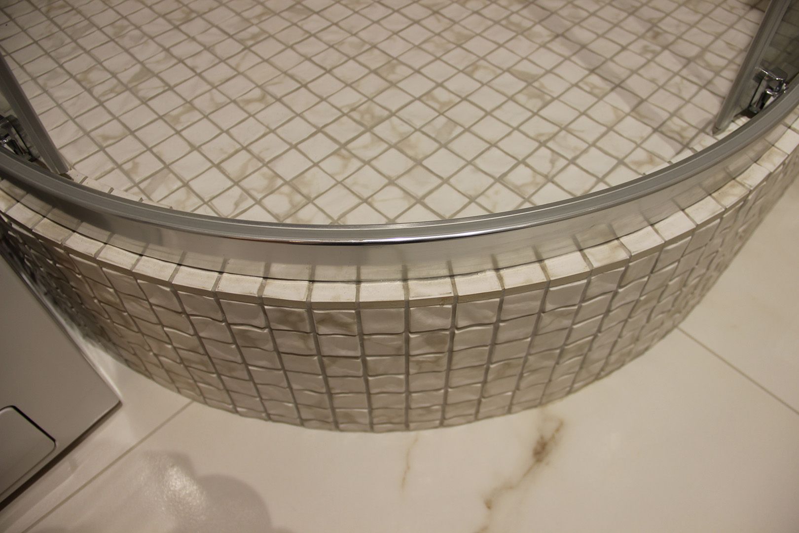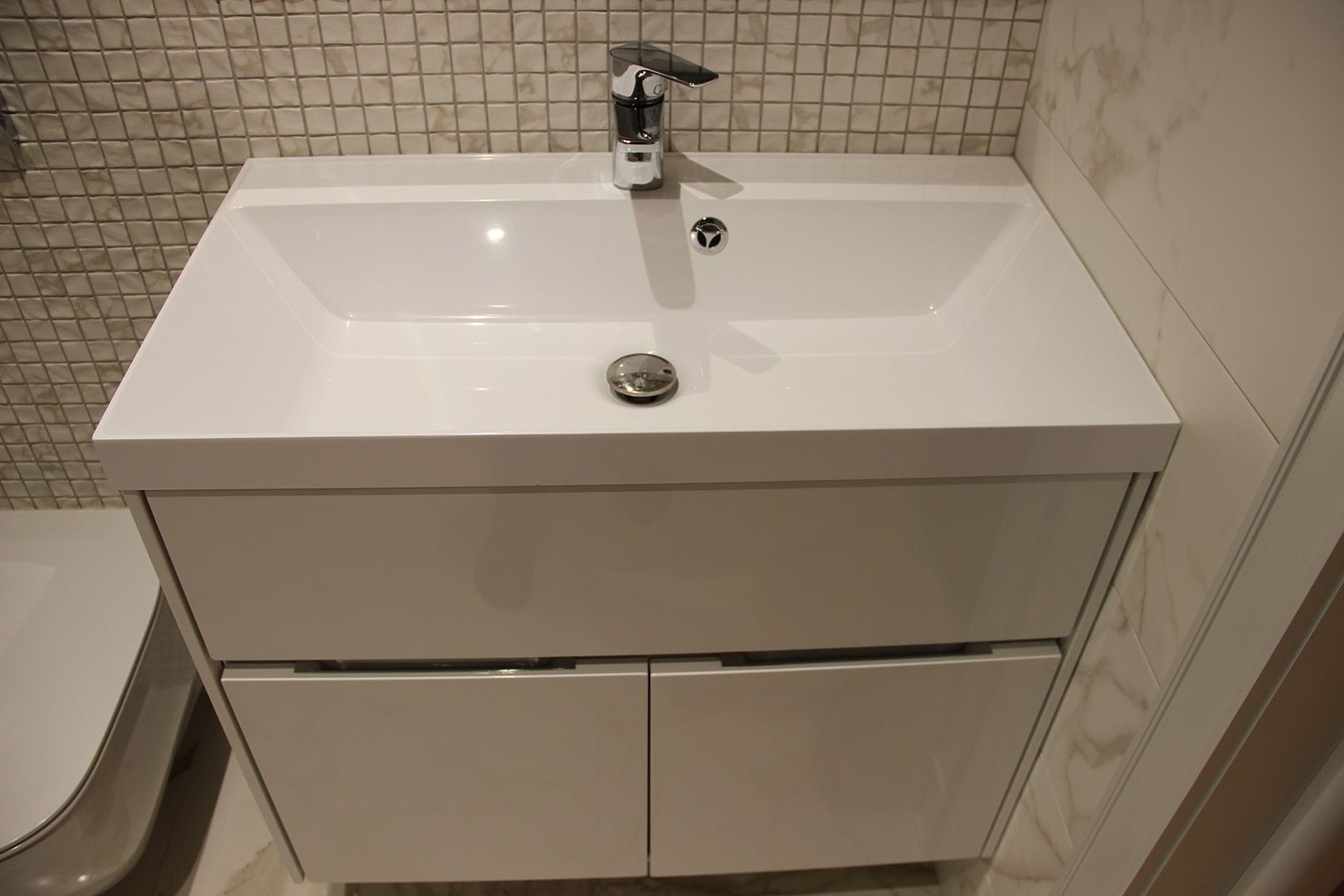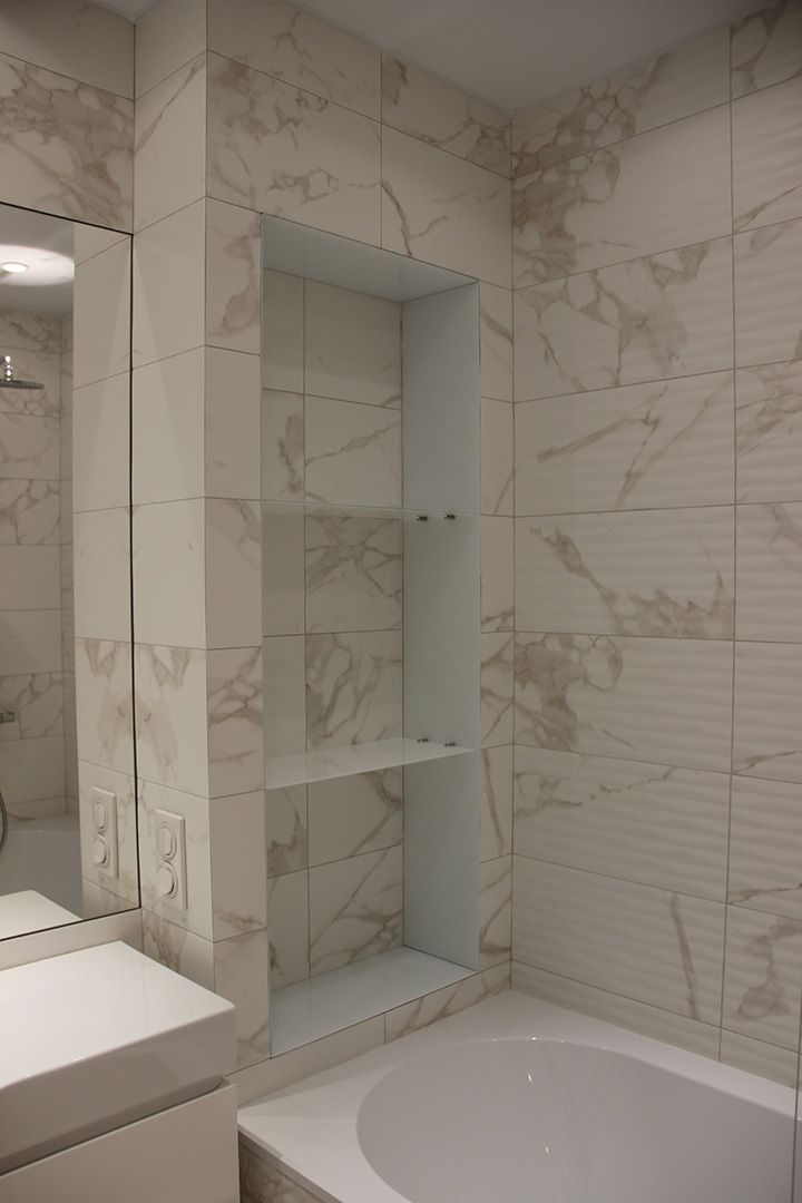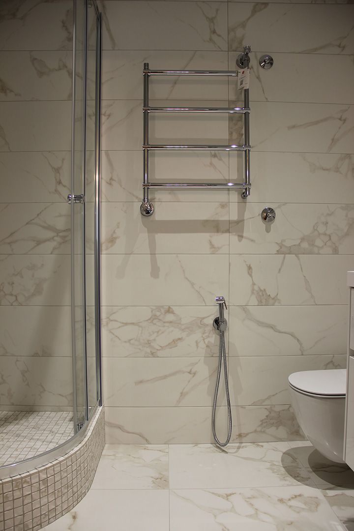 В ванной комнате установили ванну с тропическим душем и стеклянной перегородкой, тумбу с раковиной и зеркалом, инсталляцию с подвесным унитазом. Также оформили в стене нишу для хранения принадлежностей. Во втором санузле установили душевую кабину с поддоном, полотенцесушитель, инсталляцию с подвесным унитазом и гигиеническим душем, а также небольшую раковину с тумбой.