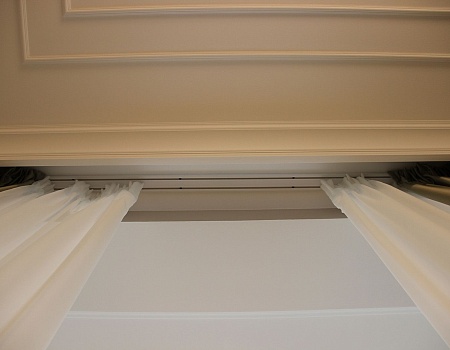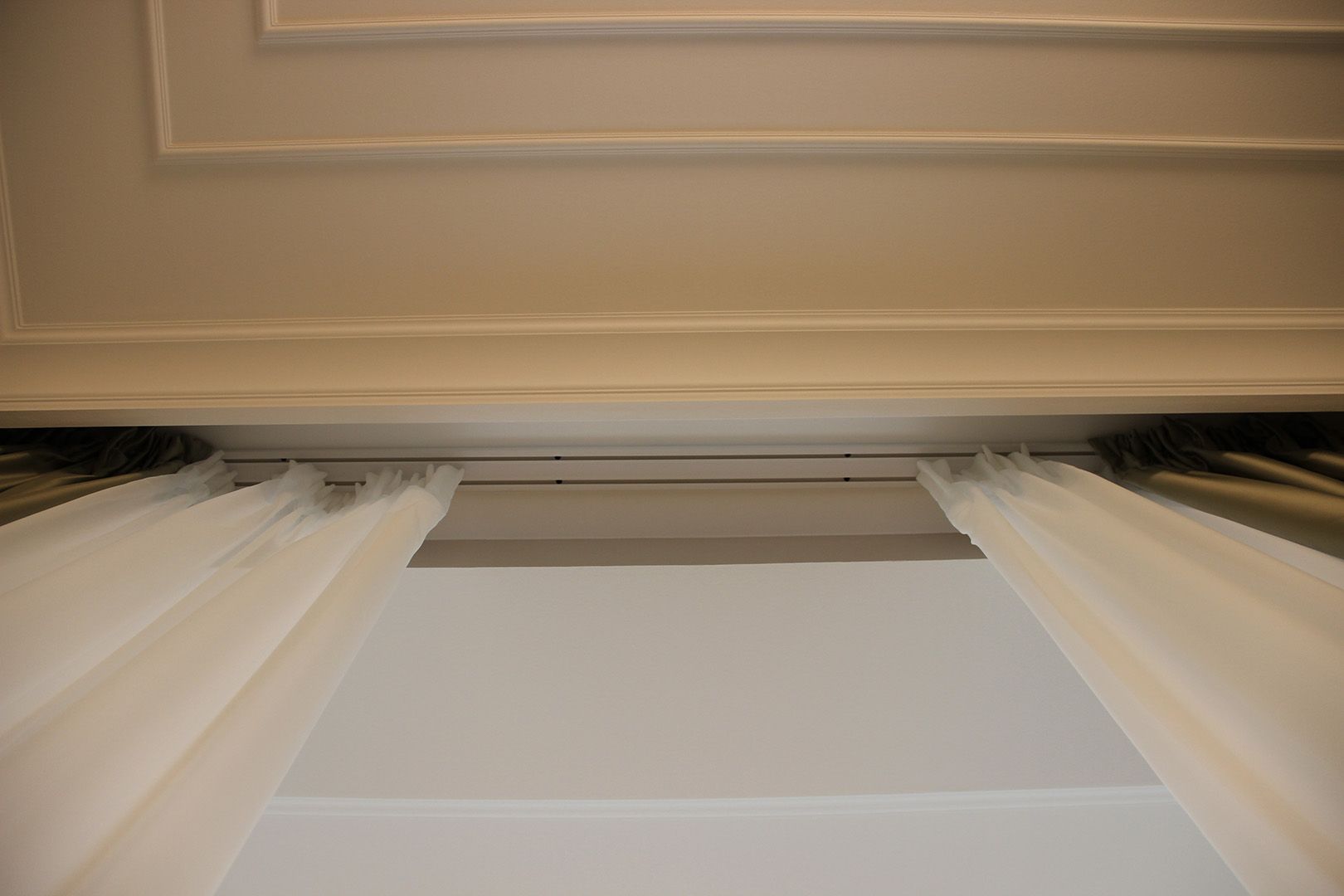 В отделке стен использовали краску, обои, плитку и молдинги для декора. На пол уложили керамогранит и инженерную доску. Потолок выполнили из гипсокартона с нишами под шторы. Установили белые межкомнатные двери в традиционном стиле, а также раздвижную конструкцию в гостиной комнате.