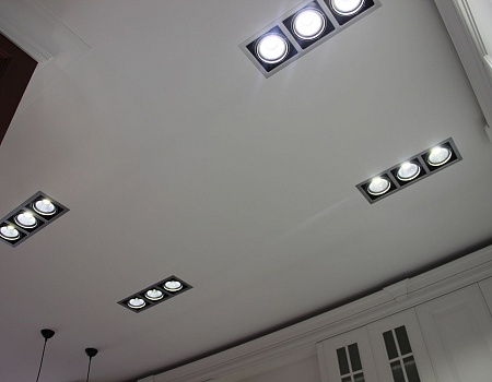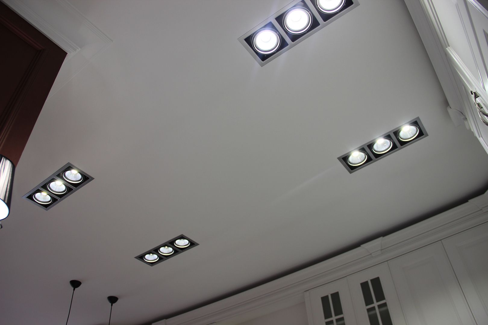 Установили межкомнатные двери в традиционном стиле и белом цвете, для входа в гостиную выбрали раздвижную конструкцию. Для освещения выбрали множество групп света: подвесные светильники и бра, встроенные точечные светильники разных видов, люстры и накладные лампы.