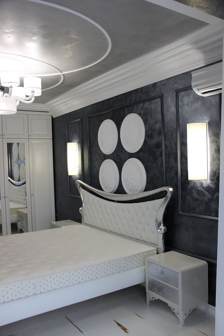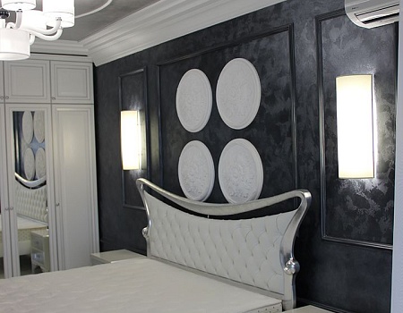 В спальной комнате под витражным остеклением установили внутрипольный конвектор для комфортного обогрева помещения. Декорировали изголовье кровати лепниной в виде розеток, а ТВ-зону разместили в нише. Установили сплит-систему.