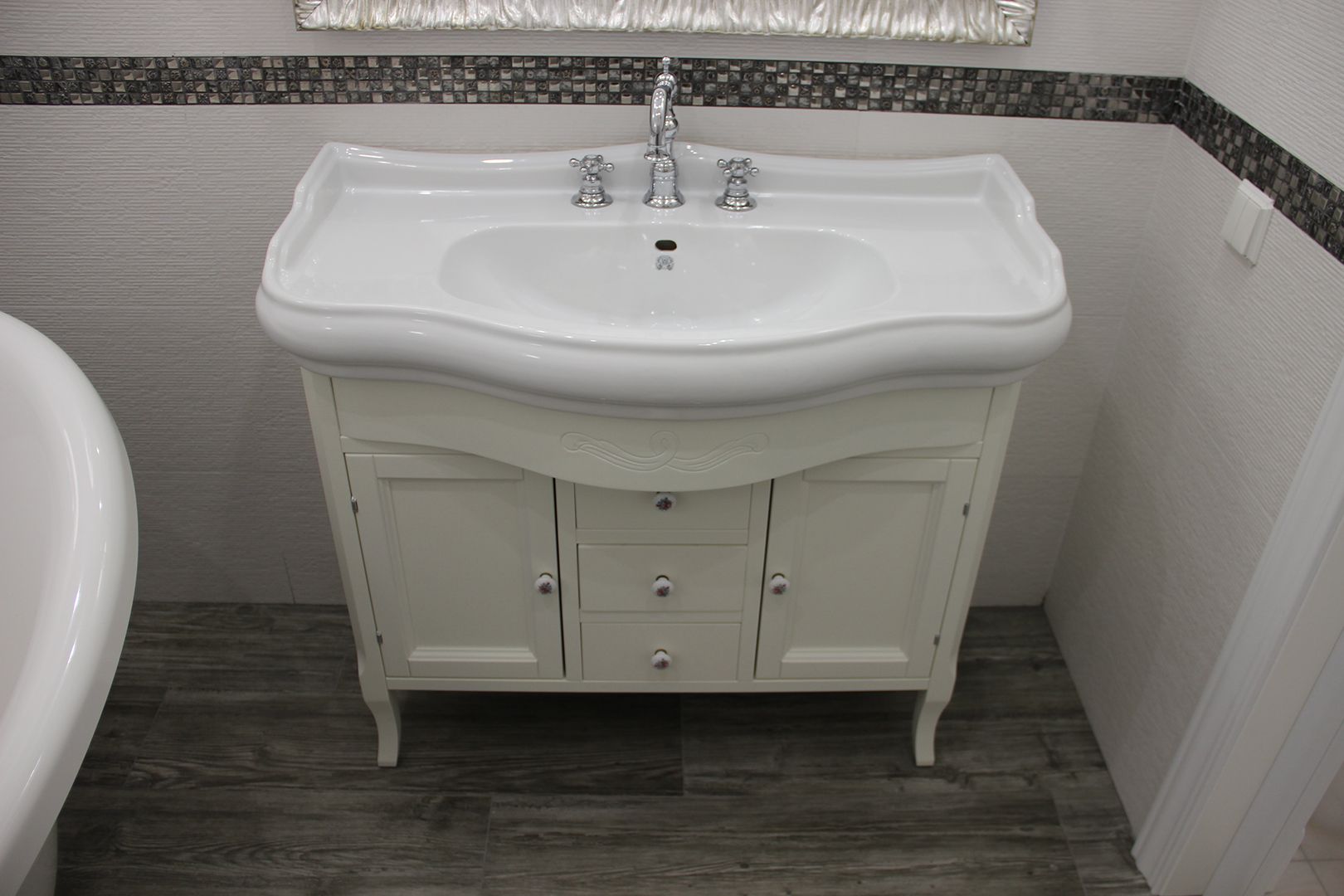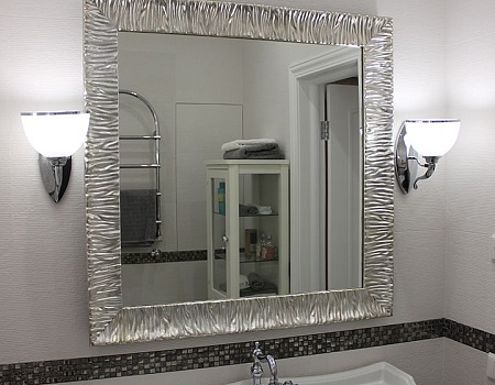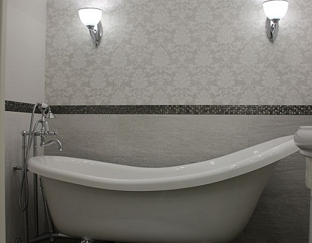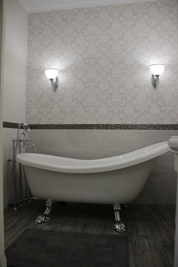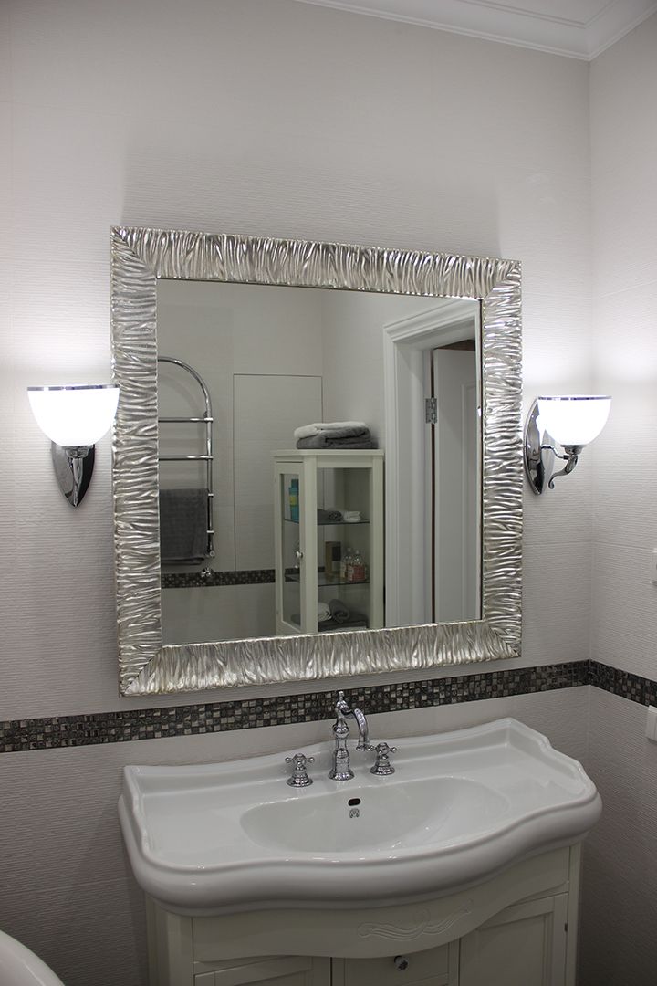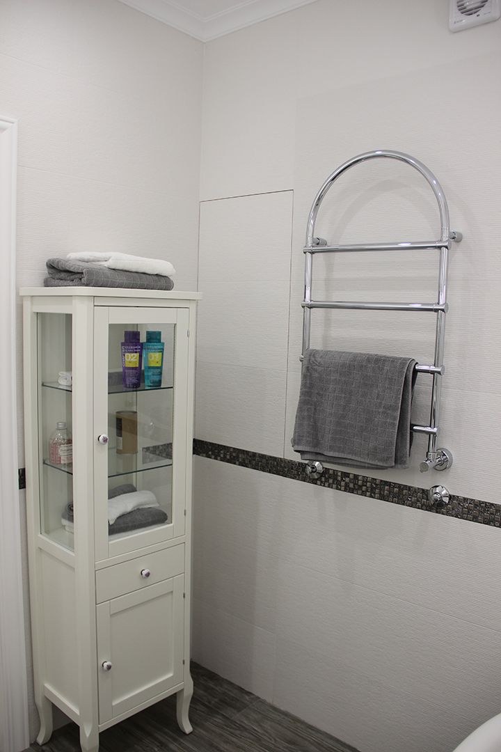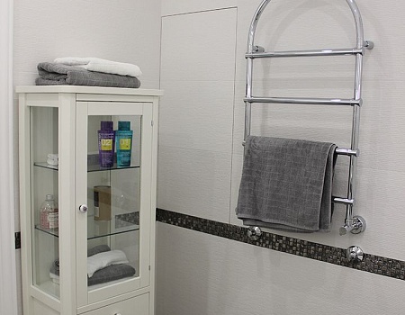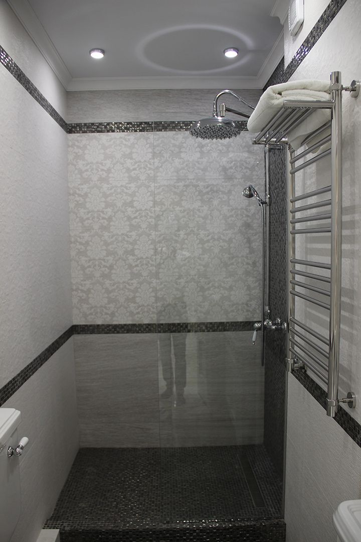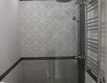 В ванной уложили «теплый пол», установили отдельно стоящую ванну, раковину с тумбой, полотенцесушитель в серебряном оттенке и зеркало. Стены облицевали плиткой. Во втором санузле установили душ в строительном исполнении со стеклянной перегородкой и тропическим душем.