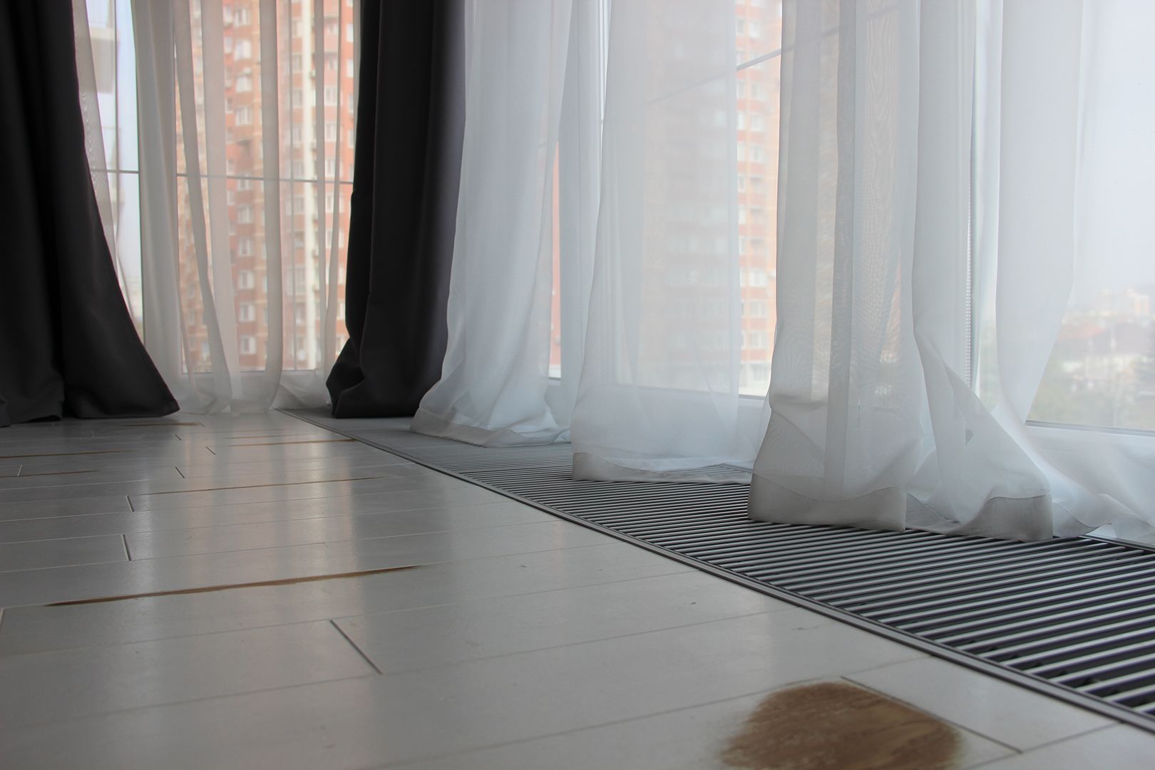 На кухне выделили две зоны: кухню и обеденную часть. В зоне кухни установили цельную столешницу, плавно перетекающую в барную стойку. Обеденную зону также дополнили внутрипольным конвектором и классическим радиатором отопления. В гостиной создали нишу из гипсокартона для ТВ-зоны, акцентировали место за диваном необычным 3D-декором.