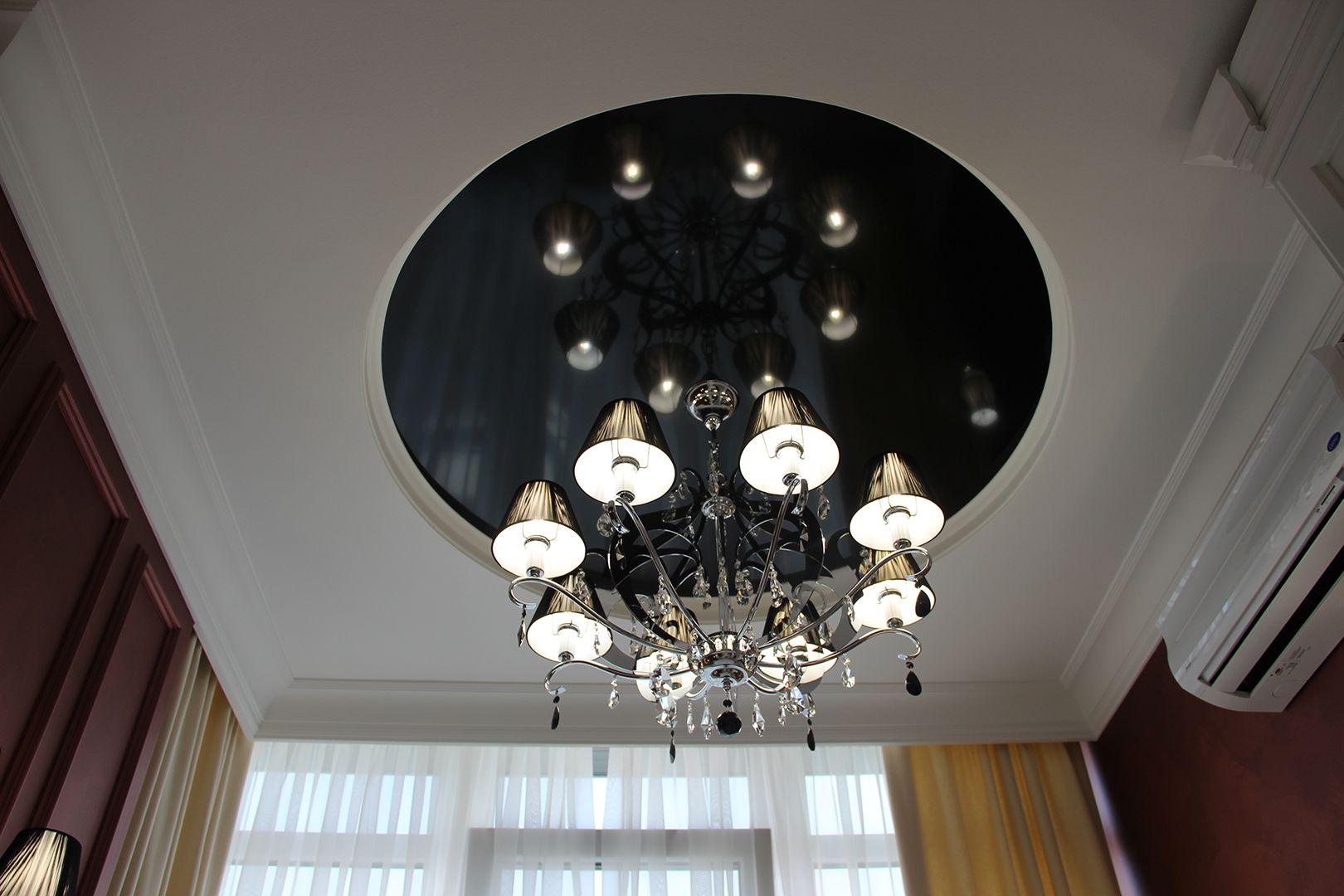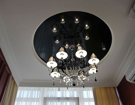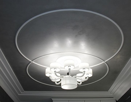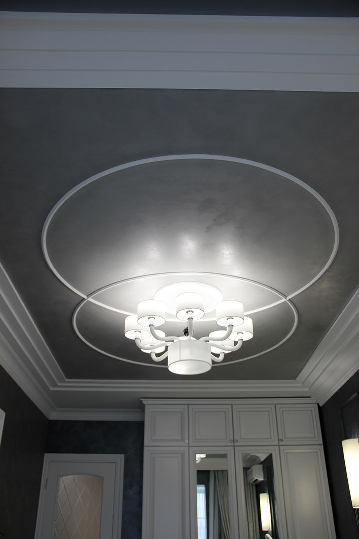Потолок из гипсокартона с декором в виде розеток и лепнины. Дополнили пространство молдингами и 3D-панелями.