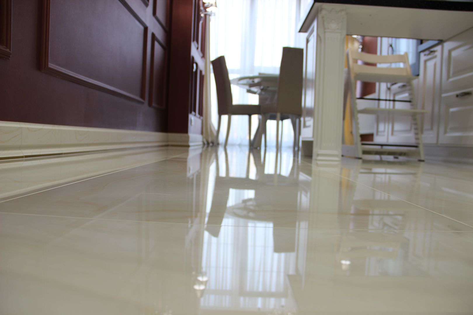 В ремонте этой квартиры мы использовали материалы в натуральных оттенках. На пол уложили инженерную доску и несколько видов плитки, например, с перламутровым рисунком для коридора. Для отделки стен выбрали обои: сияющие, персиковые в прихожей, белые с узором в детской комнате, темные в спальной комнате, серебристые в гостиной и насыщенно-бордовые на кухне.