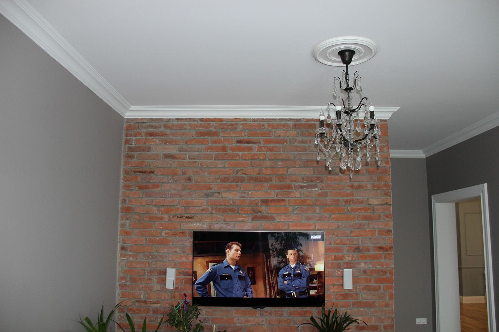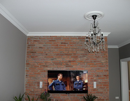 В спальной комнате декорировали изголовье кровати красочными обоями, установили сплит-систему и большой шкаф-купе в одном стиле с дверьми. В гостиной одну из стен оформили «царским кирпичом», созданным в стиле дореволюционного Петербурга. Также выстроили декоративный камин с накладными лампами и зеркалом вместо огня, который нивелирует брутальность «лофтового» кирпича. Выделили зону для работы.
