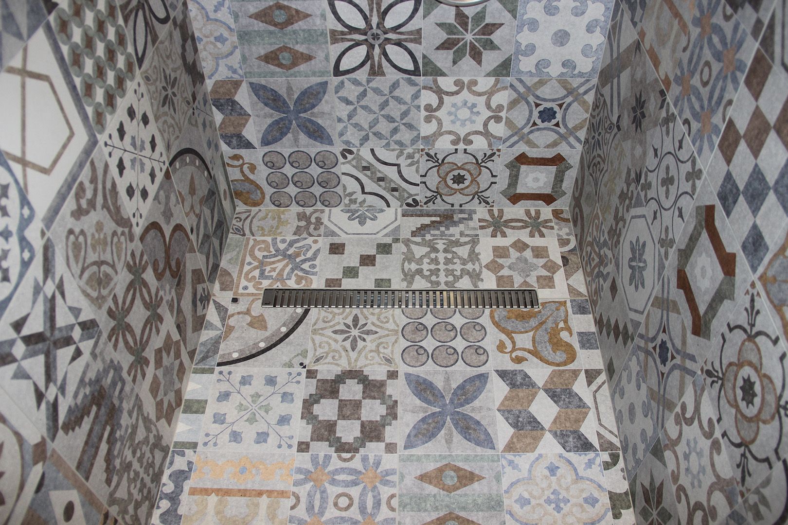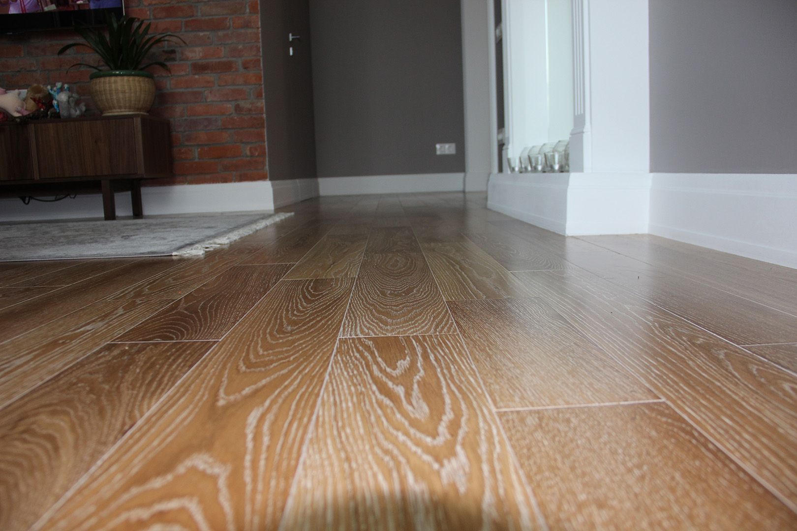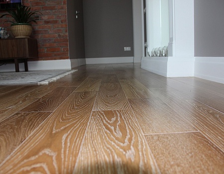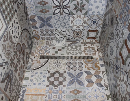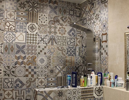 В отделке стен использовали краску и обои в серой цветовой гамме, в ванной комнате использовали бежевый керамогранит, а во втором санузле — плитку в стиле пэчворк. На пол единым контуром уложили плитку и инженерную доску без стыков и порожков. Для этого заливали стяжку в разных уровнях, чтобы создать равномерную поверхность без перепадов.