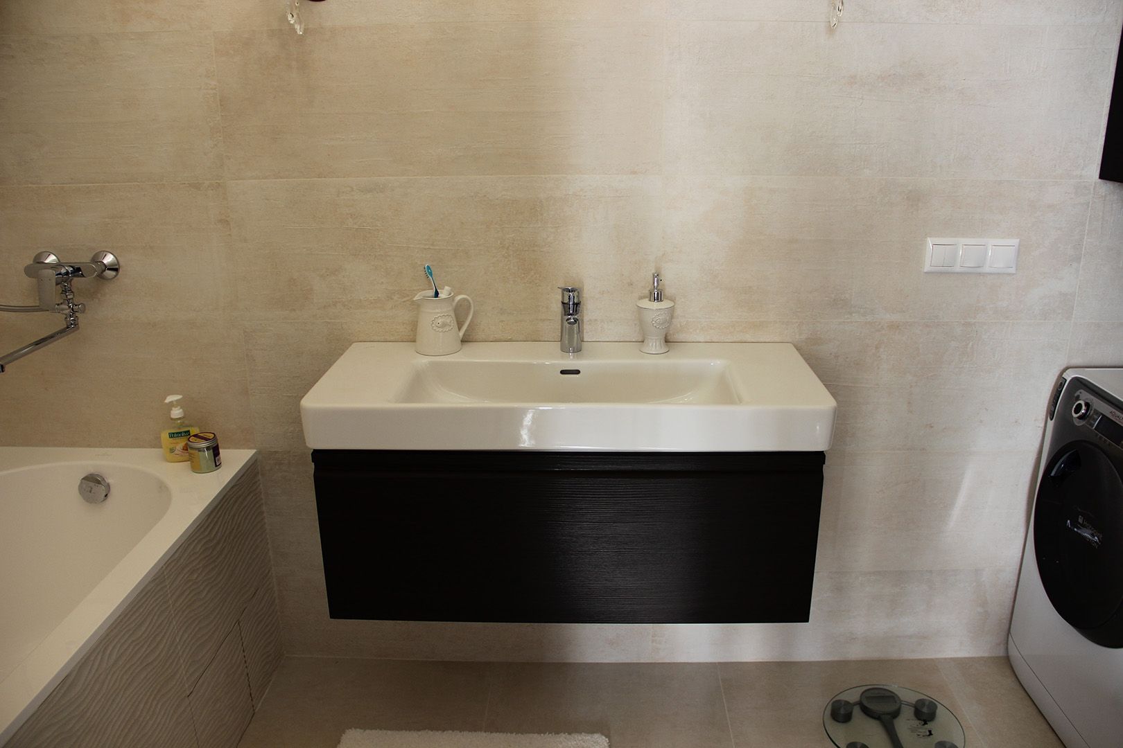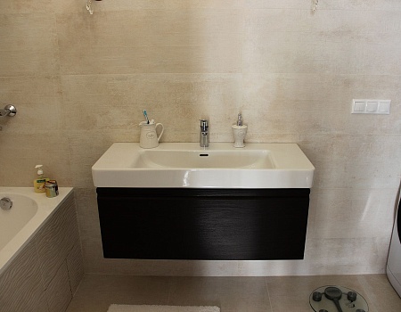 В душевой комнате установили поддон в строительном исполнении с трапом и разуклонкой, раковину с зеркалом, инсталляцию с подвесным унитазом. В ванной комнате установили ванну, тумбу с раковиной, выделили место для стиральной машины и систем хранения.