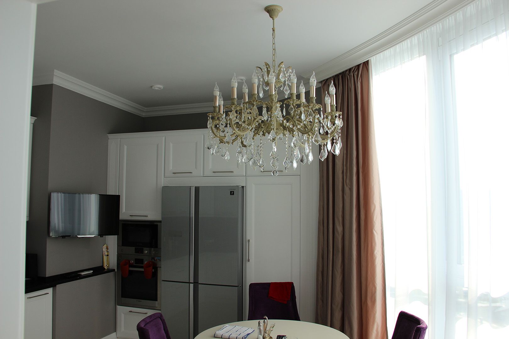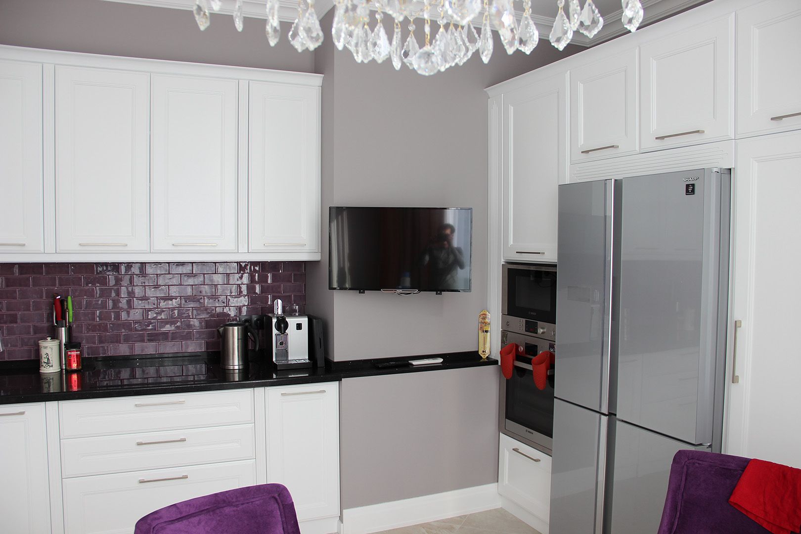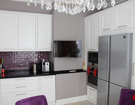 Благодаря продуманному дизайну, небольшая площадь кухни и ее нетрадиционная форма не стали помехой, поэтому в комнате уместилось всё самое нужное: гарнитур со встроенной бытовой техникой, телевизор и обеденная зона с круглым столом. Кухонный фартук облицевали мелкоразмерной плиткой в фиолетовом цвете.