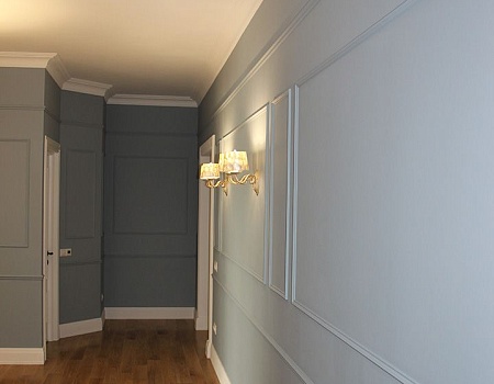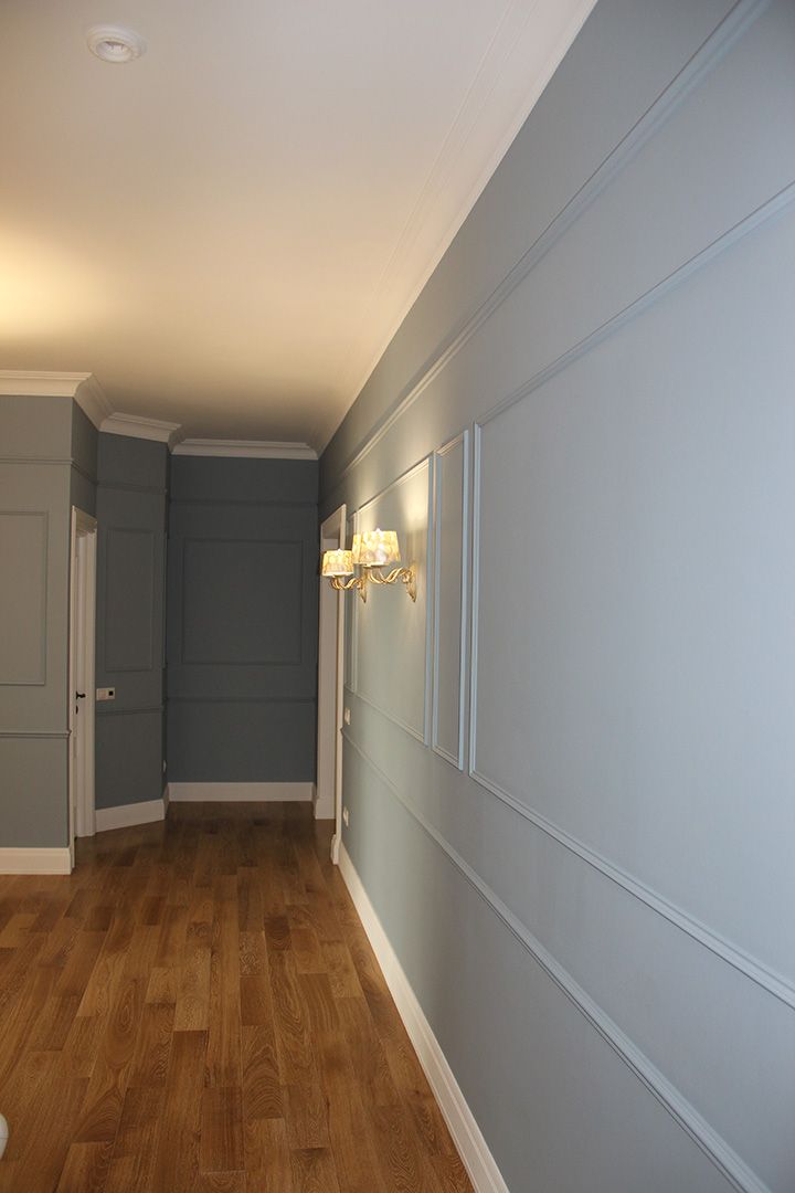 Роскошная квартира в стиле "неоклассика" для молодой девушки. Настенные молдинги, потолочные карнизы, стены под окраску и инженерная доска.