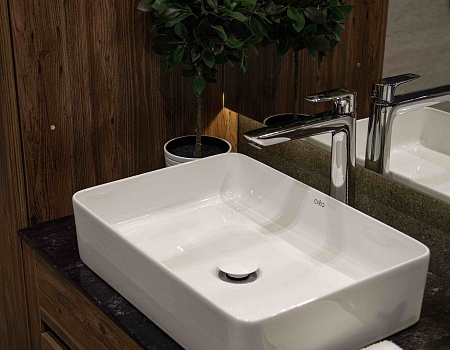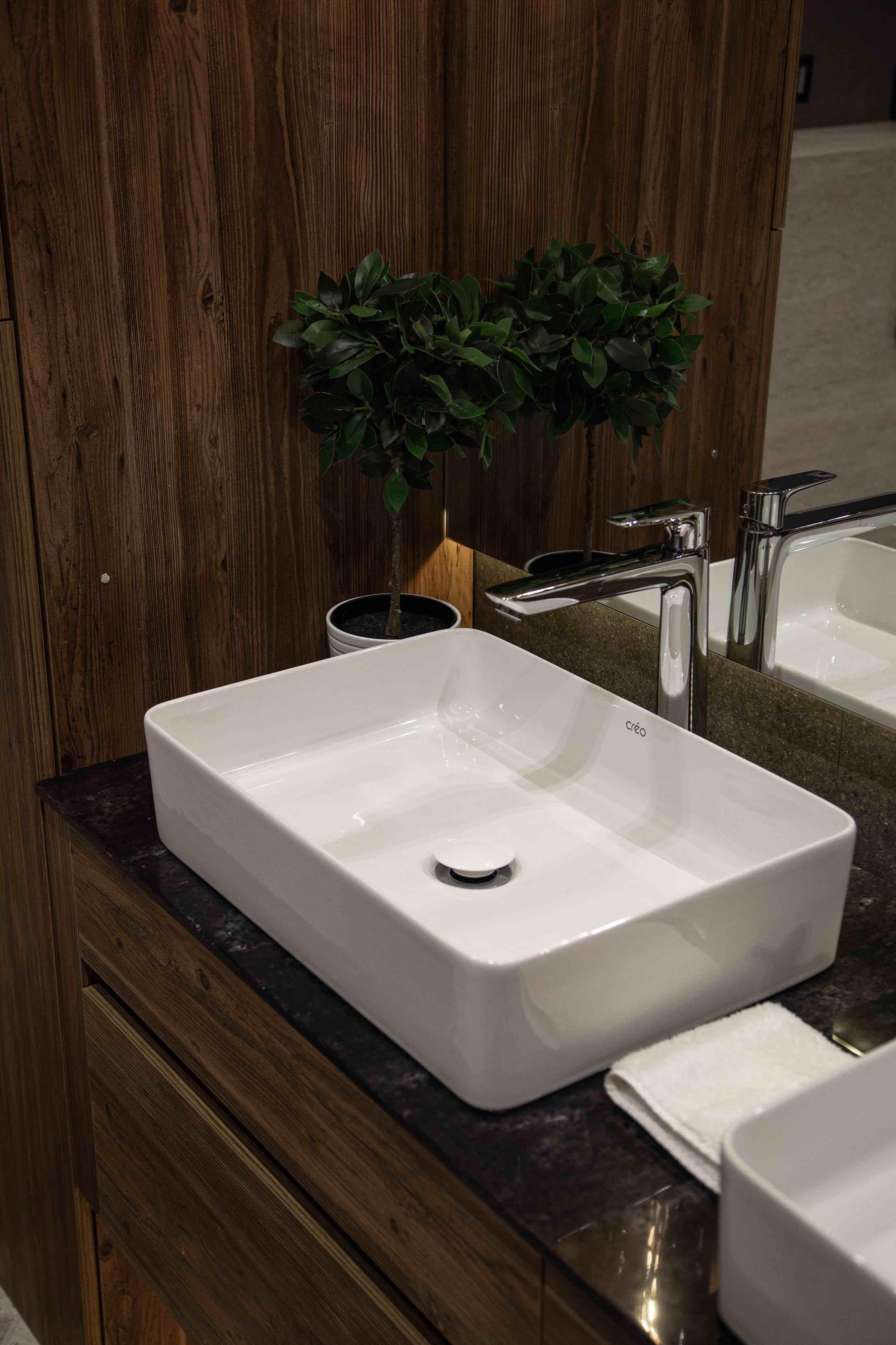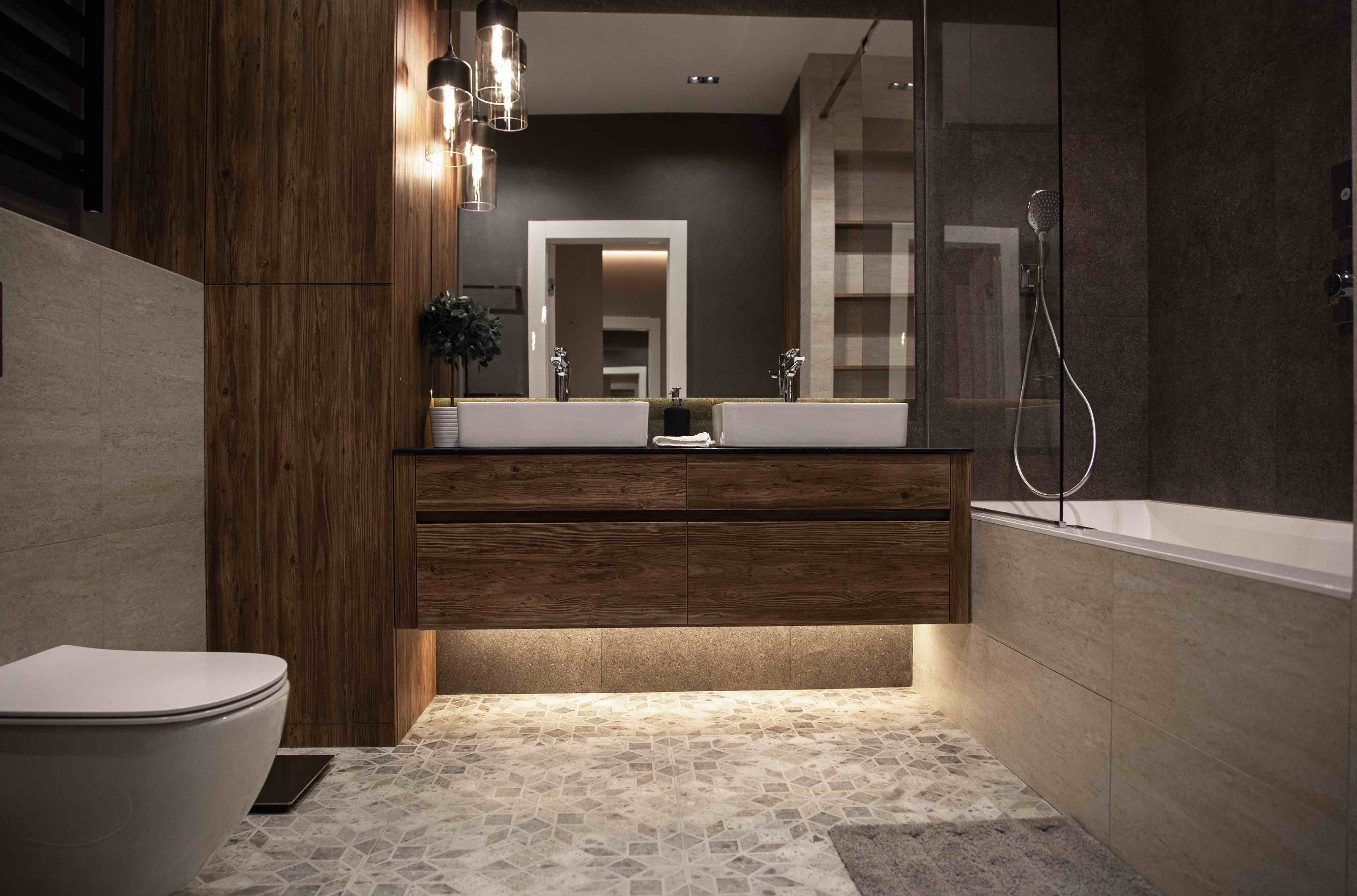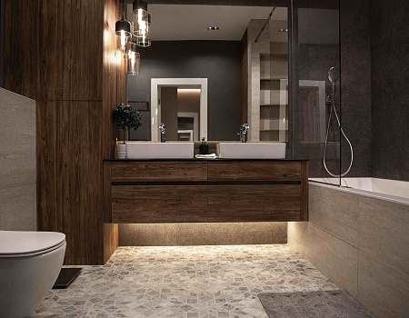 Основное место в ванной комнате занимают 2 раковины со столешницей из искусственного камня и зеркалом с подсветкой.